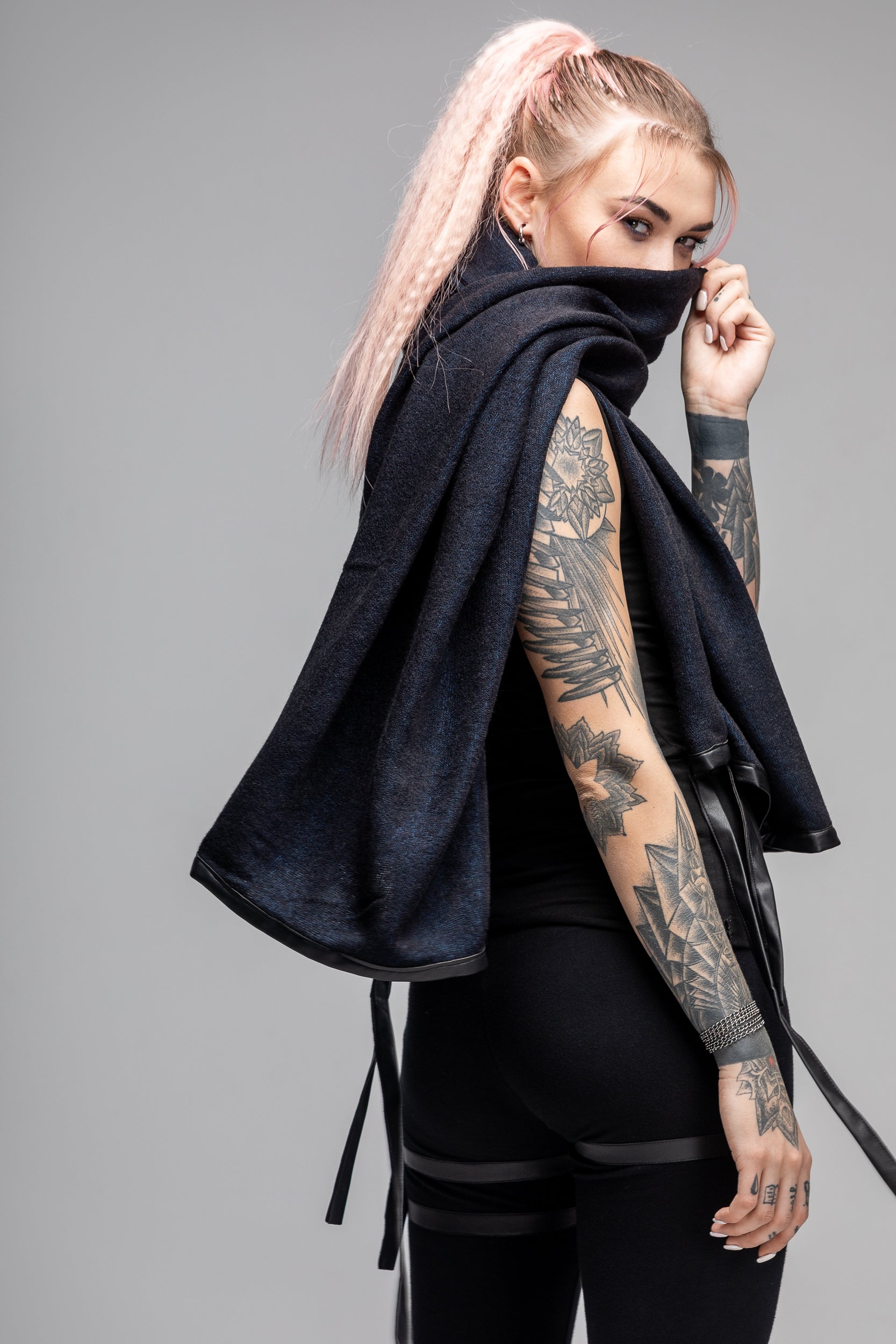 Black wool scarf with leather trim