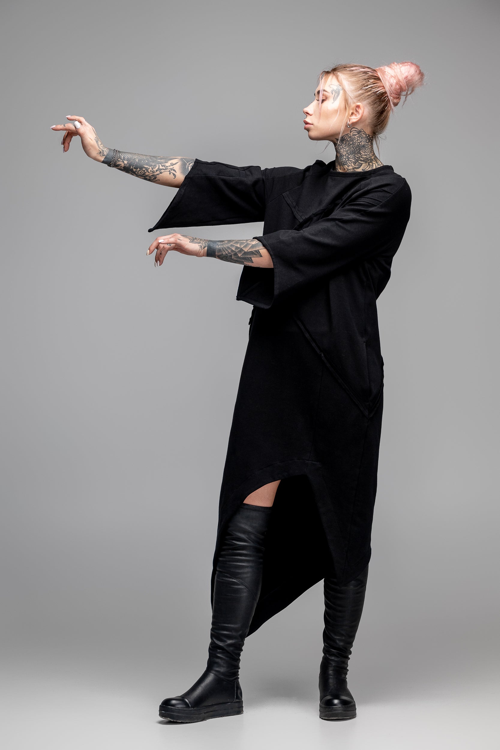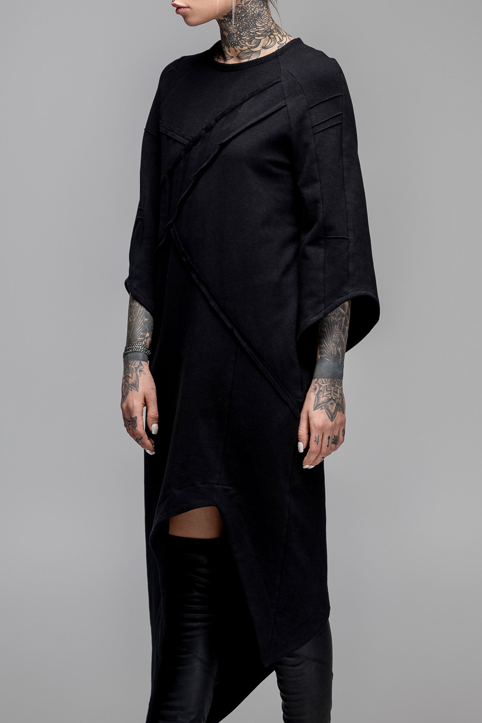 Have you ever wanted to appear confident and stand out from the crowd? The first step is to dress the part, and that's just what our shop specializes in! We produce many unusual, minimalistic, and futuristic clothes to make you shine through the masses! You just need to look at this wonderful dress to know what we're talking about. Asymmetric design, interesting geometric patterns all along the dress, even the monotone color—all these seemingly minor details come together to make you stunning and, more importantly, one of a kind. Another big advantage of this sleek dress is that you can wear it with any kind of shoe: high heels, sneakers, boots—any will match the dress! You'll always look stylish and interesting with this dress on!