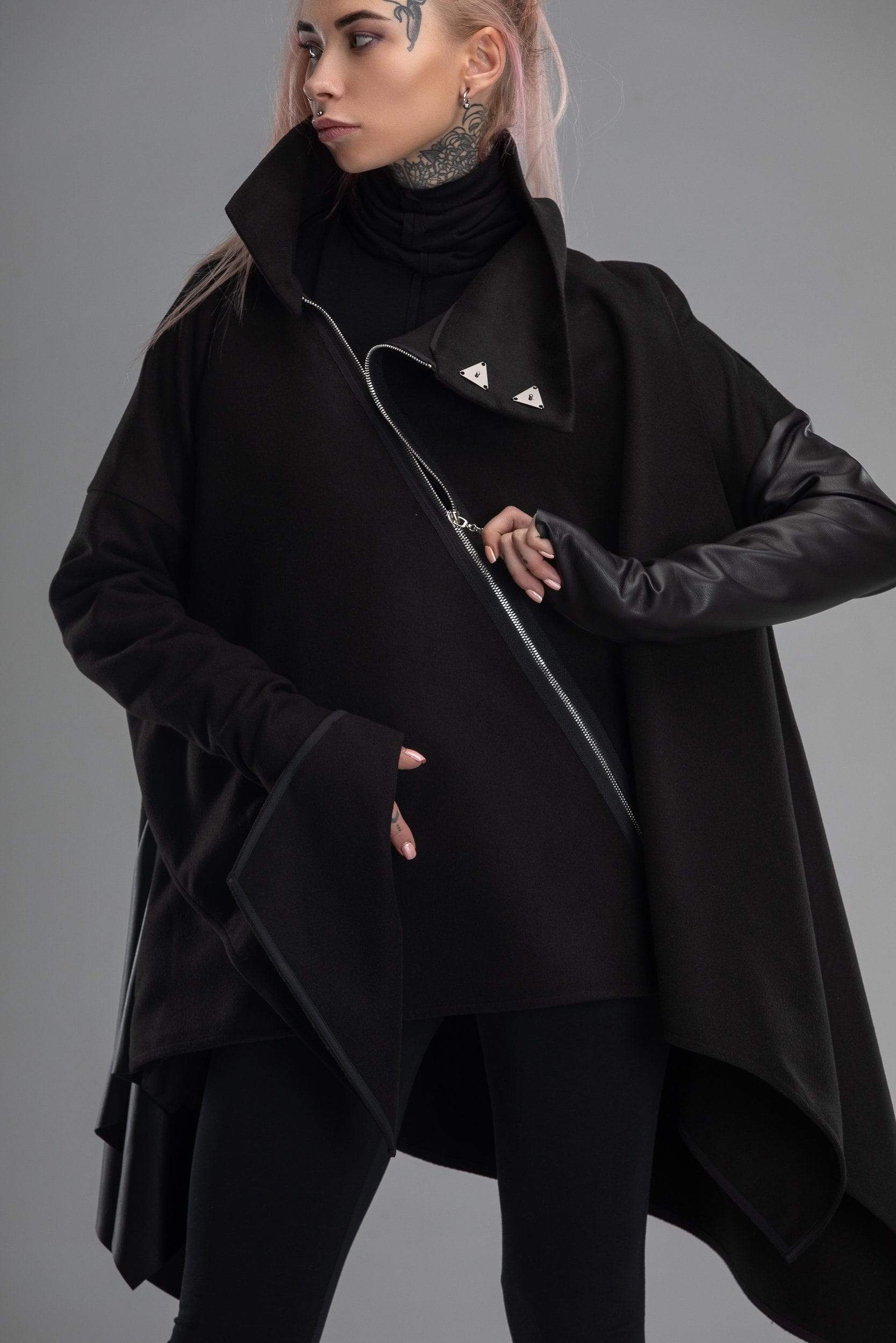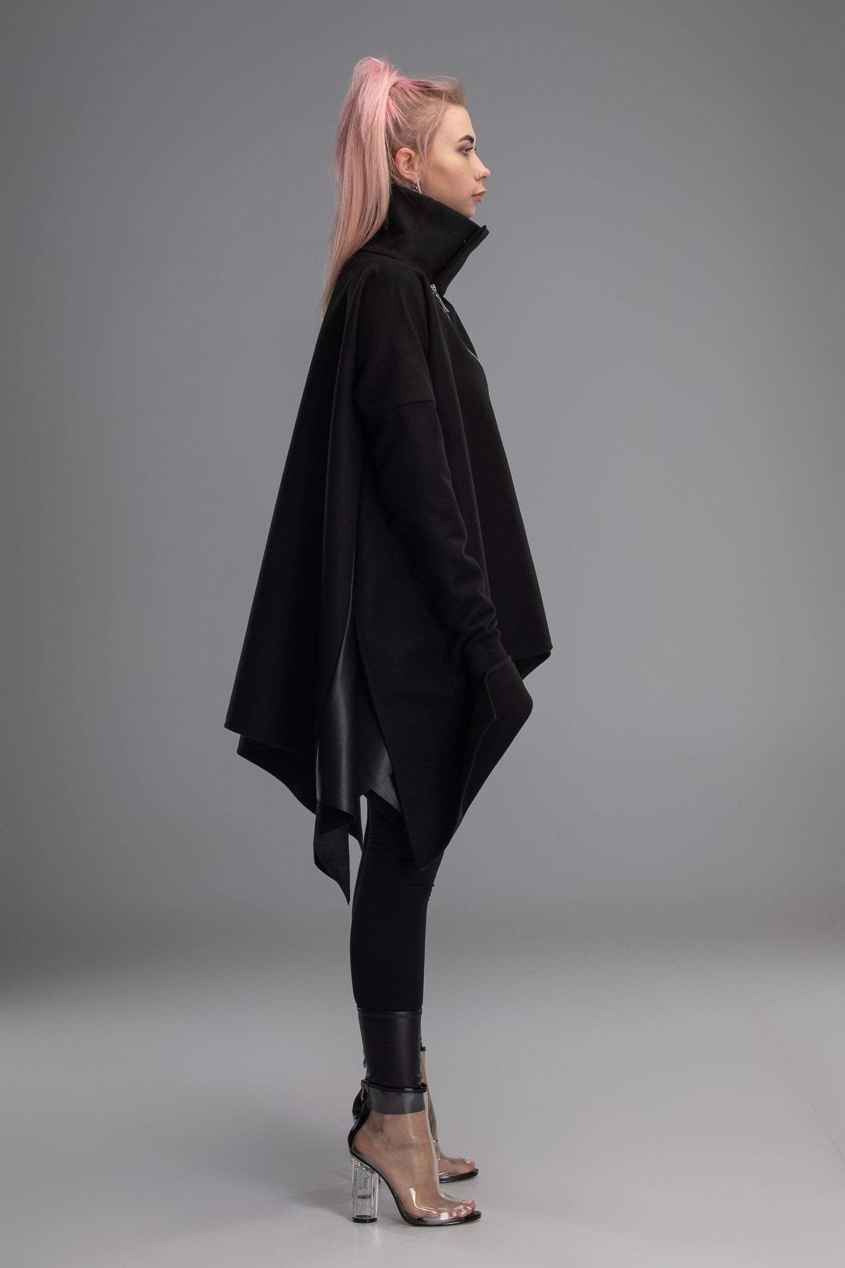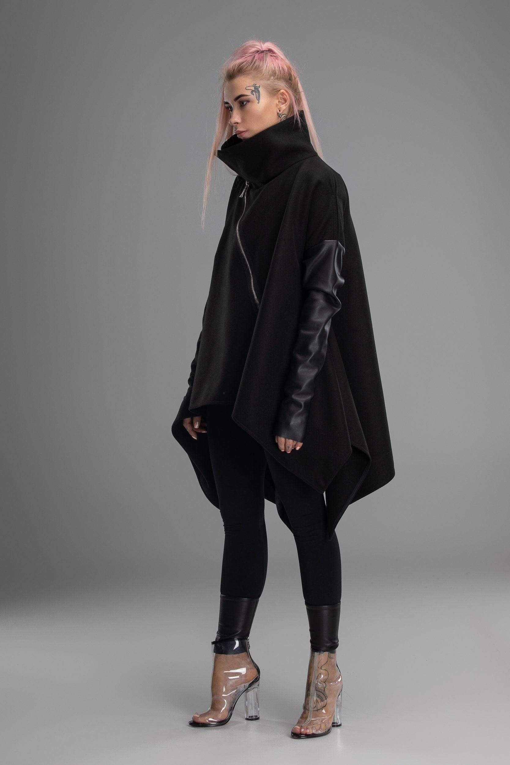 Your day to day look is not just a selection of clothes you chose, it’s a way of expressing yourself. This however doesn’t mean that clothes you choose doesn’t matter! It can be a real challenge to create a unique personal look with just the boring standard clothes you would find in any regular shop. Well, this is not a regular shop – here you will find all kinds of clothes with unique design, like this coat! Unusual shape, asymmetrical design, sleeves made from different materials and in different shapes, diagonal zipper – this poncho doesn’t even really look like an usual coat, more like a futuristic cloak. If you are looking for a way to make your look truly stand out – you found it!