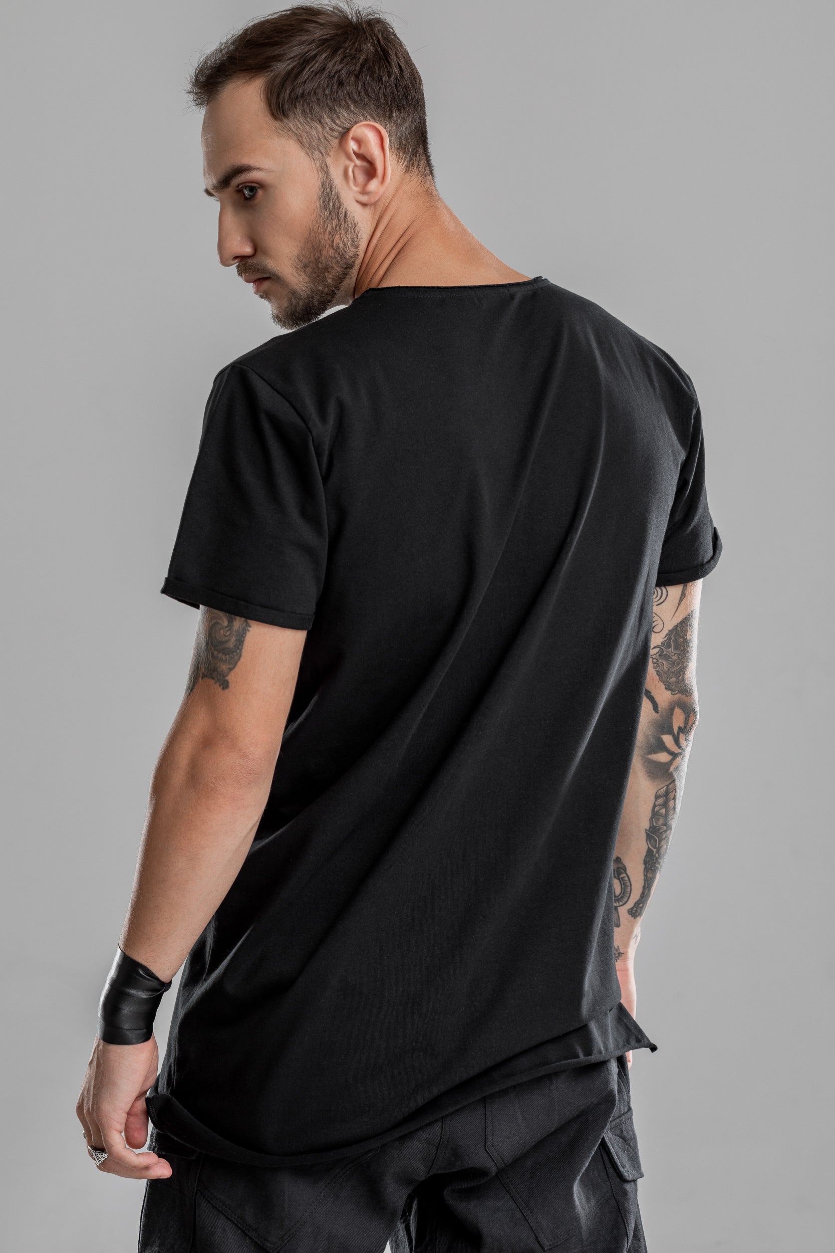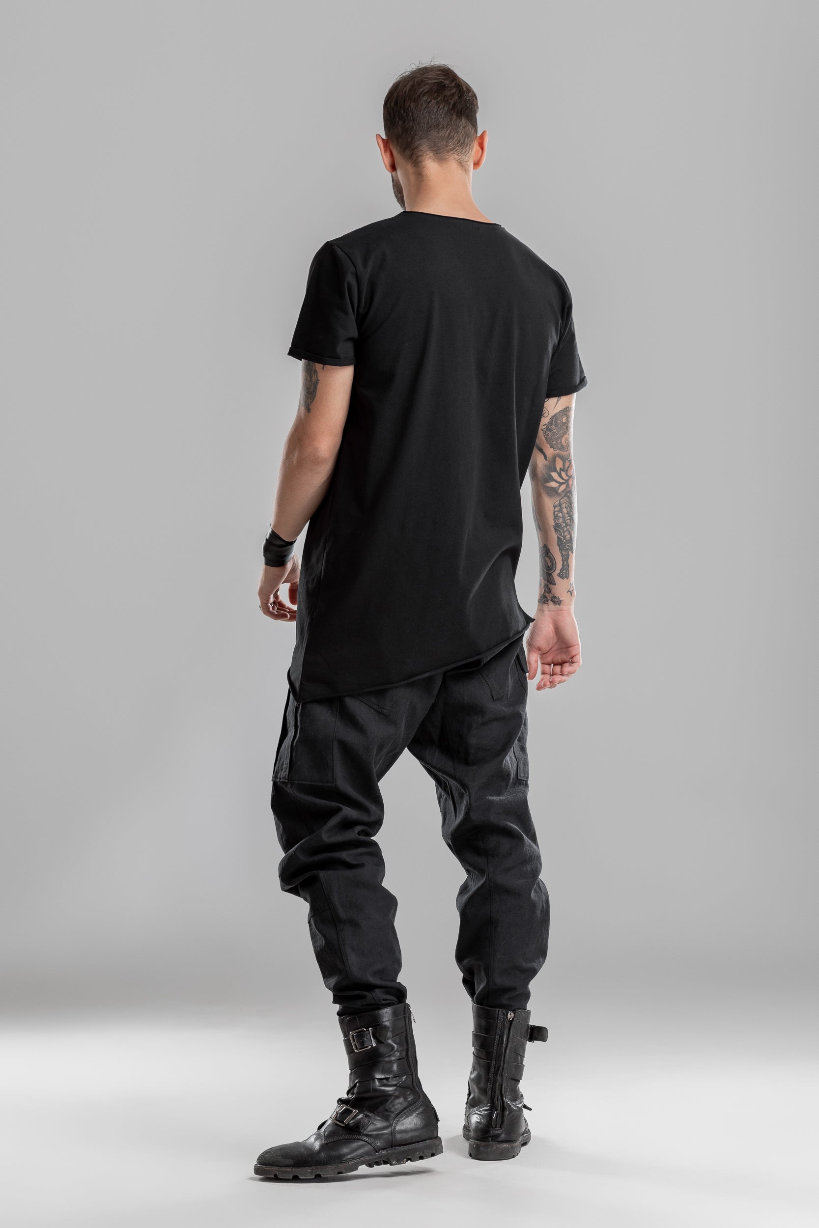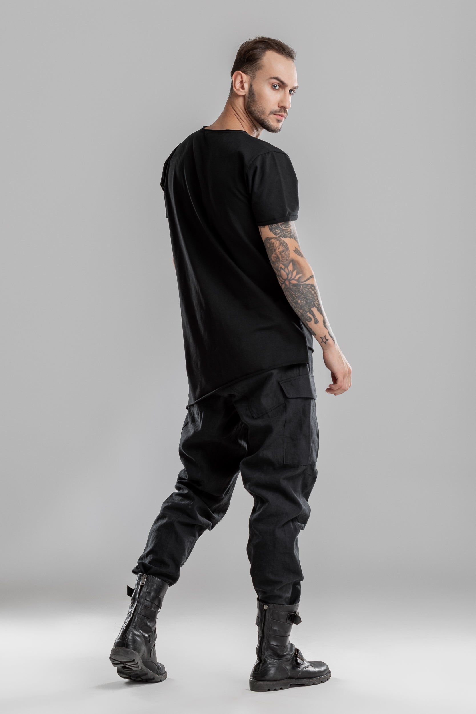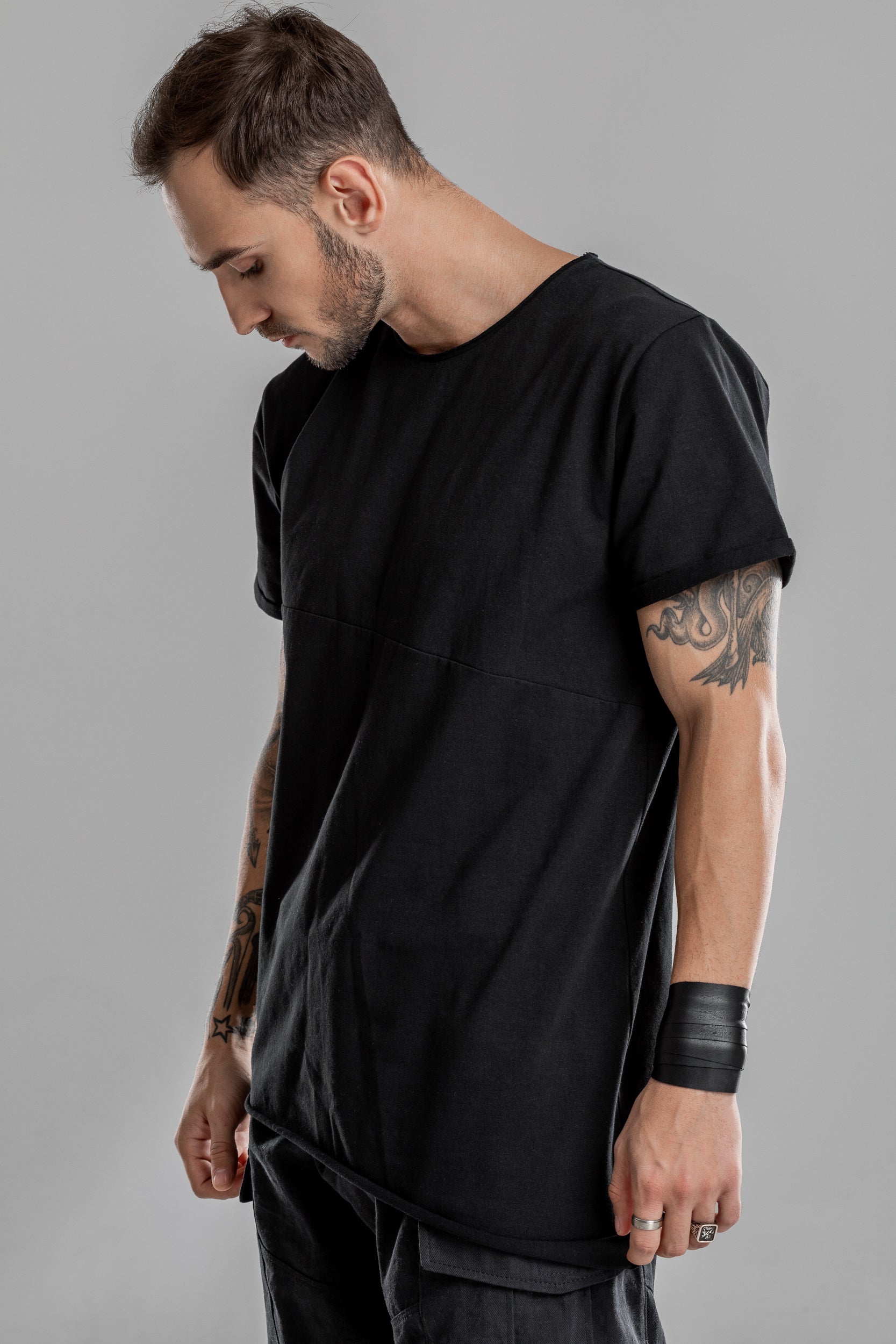 Designed for men looking for more than just an everyday base layer, our gently relaxed tee is tailored from soft cotton and is destined to become your new go-to essential. Longlined with a contemporary cut and in an evergreen crew neck style, it is for men wanting a more elevated minimalist streetwear clothing that could be worn anywhere. Pair it with some cargo pants or baggy bottoms, merge styles and play with looks for a fresh alternative vibe any day, and any time you want to add your outfit an extra kick. This black jersey cotton t-shirt will make you look dapper and feel comfortable every time you slide into it.