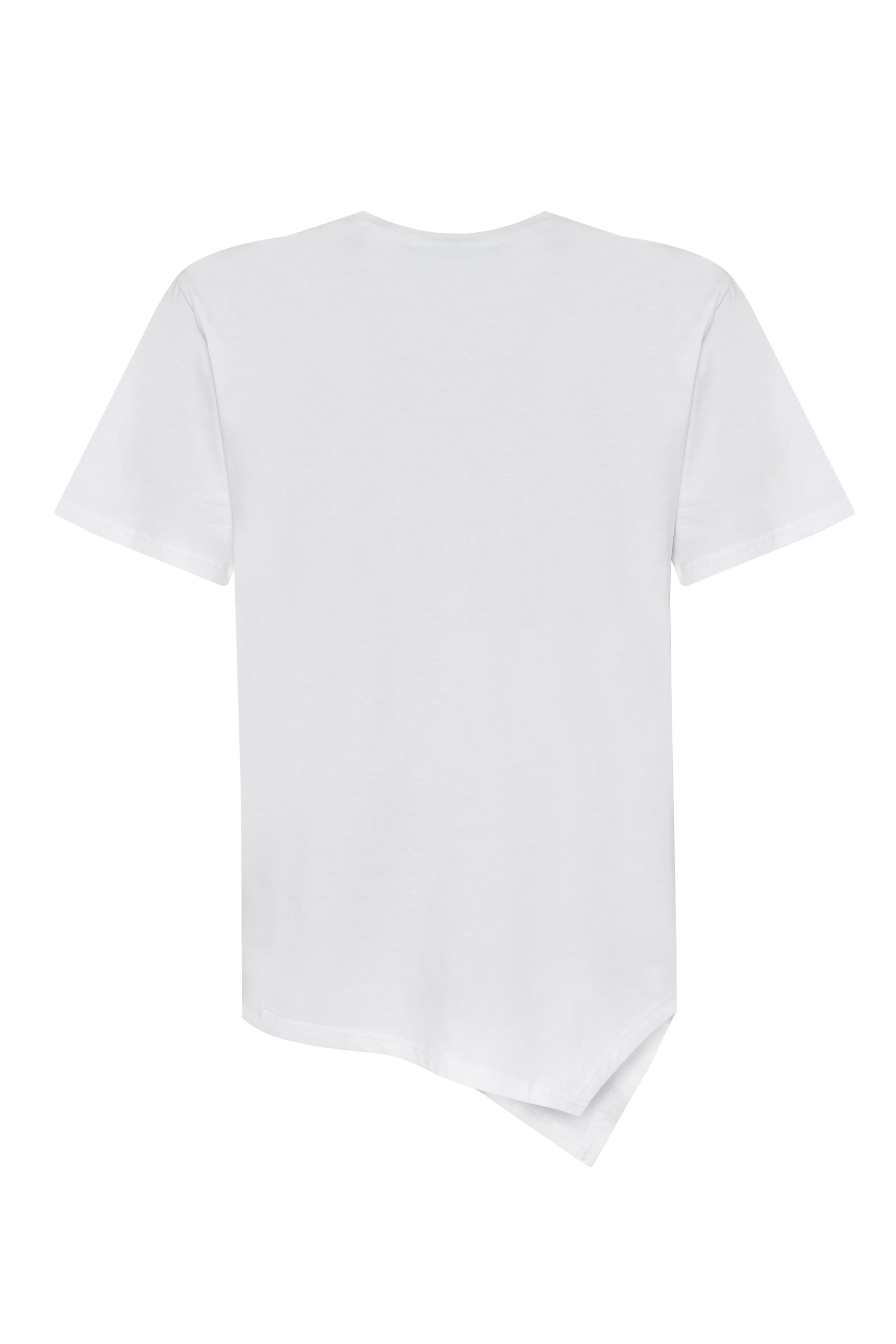 With a diagonal decorative front seam and explicit, deconstructed bottom, this white t-shirt comes in elongated form to feature a simple construction with a twist that makes it refreshingly novel in appearance.
