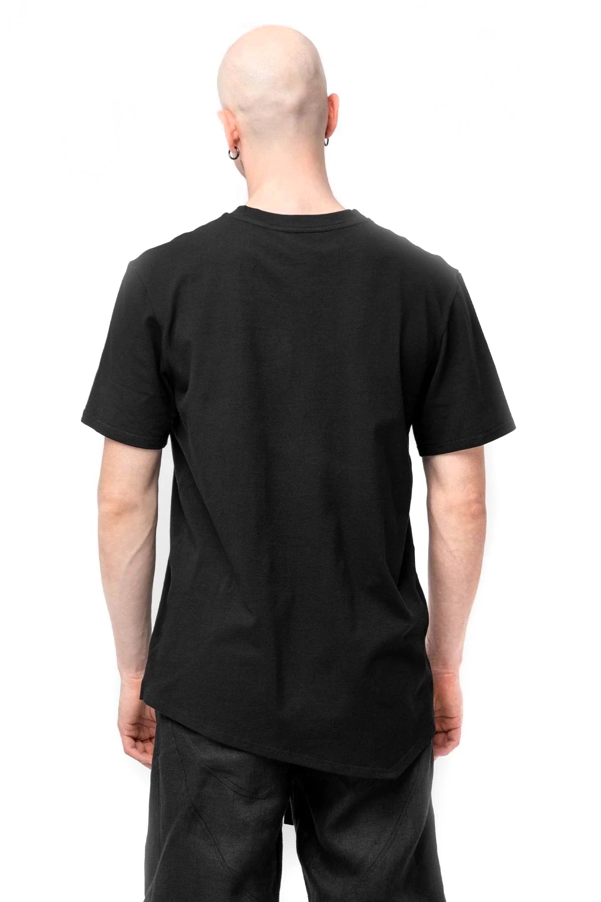 Punched with elements that feature patchwork-like details, it displays a frontal diagonal seam and an original asymmetric hem to give the casual a new personality.
