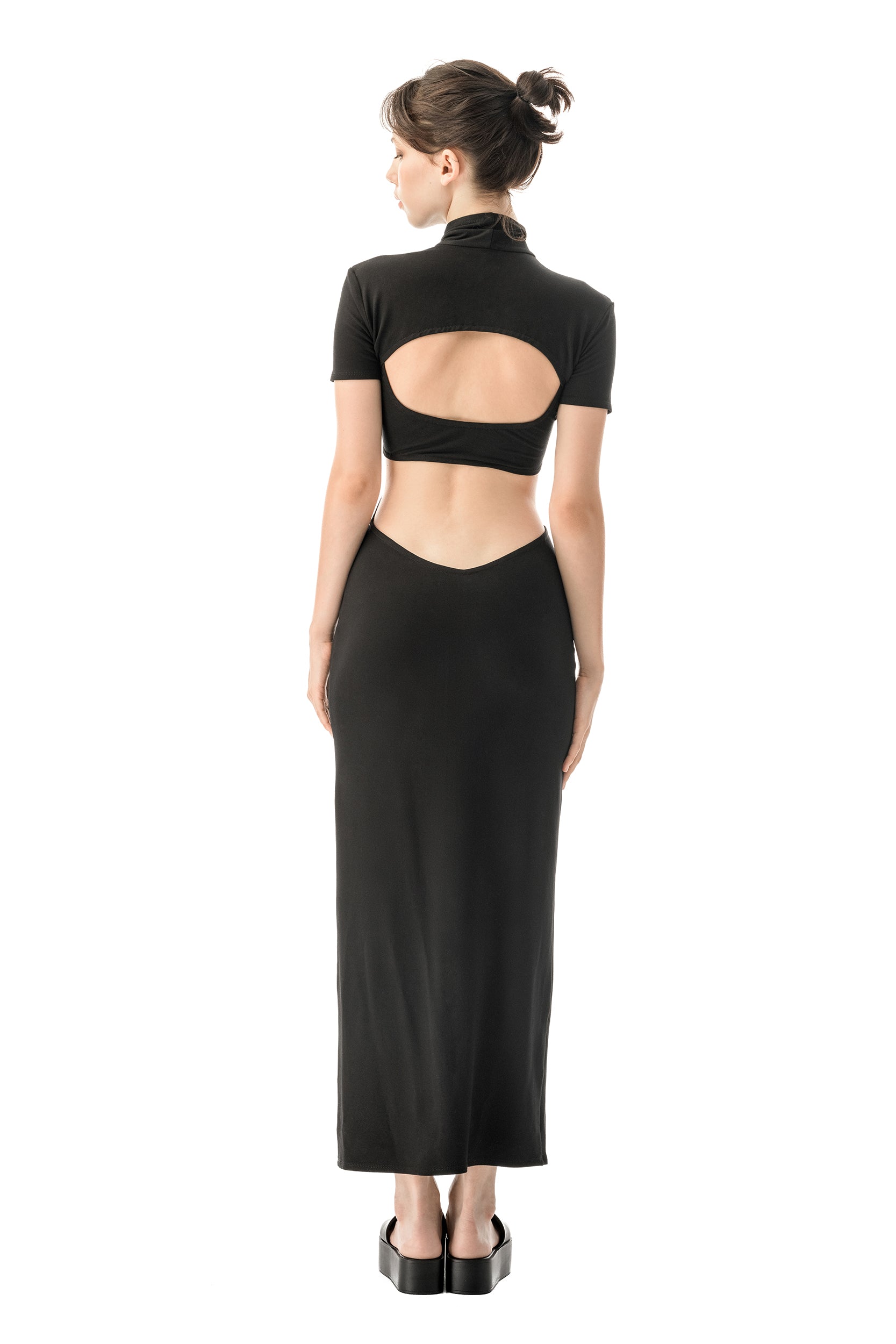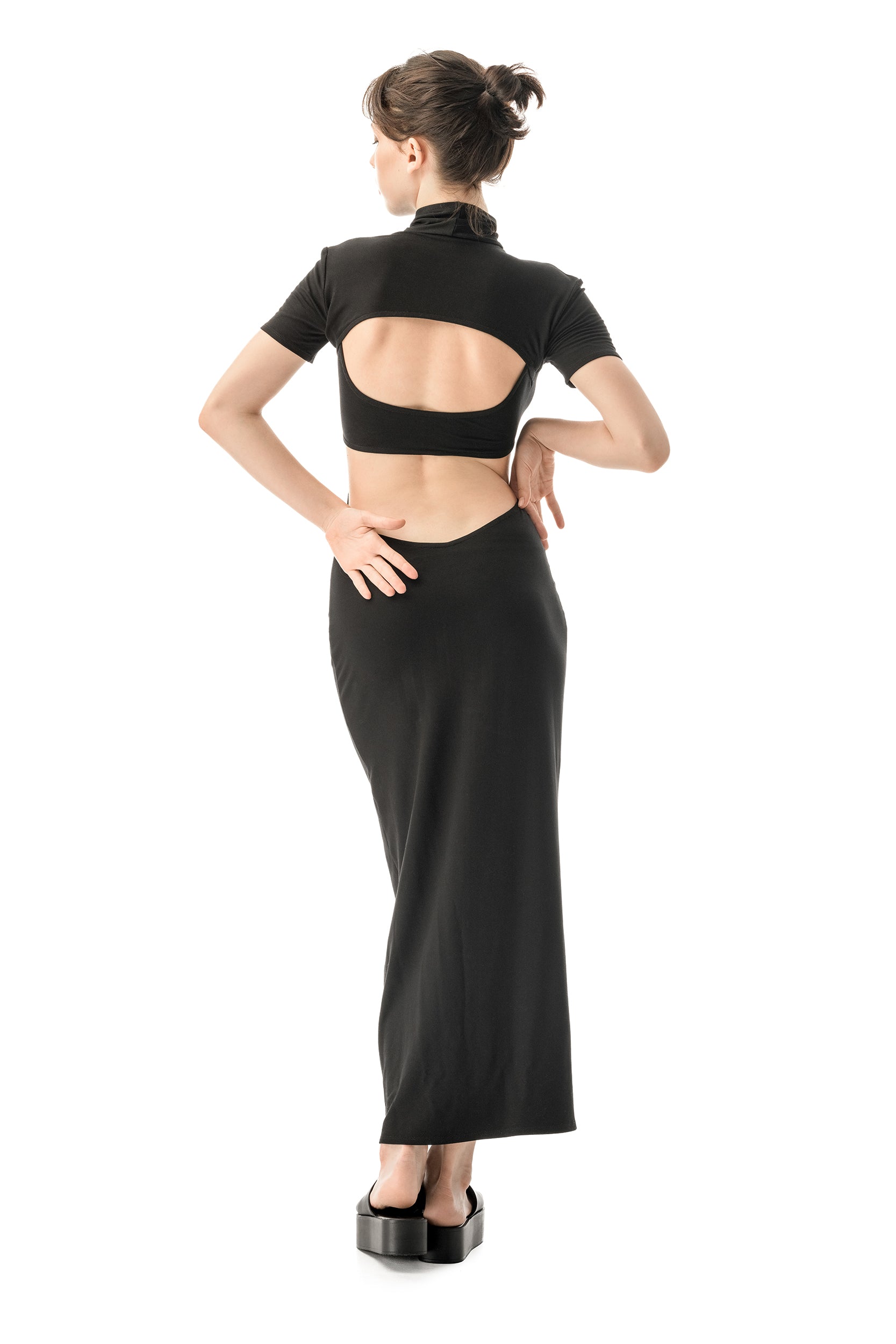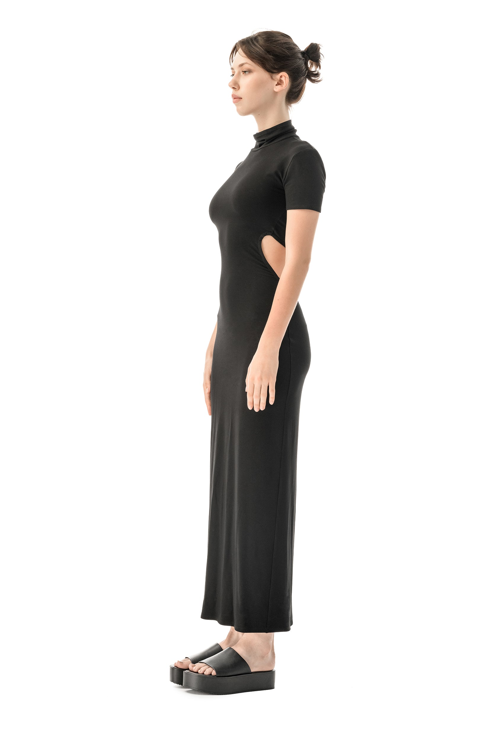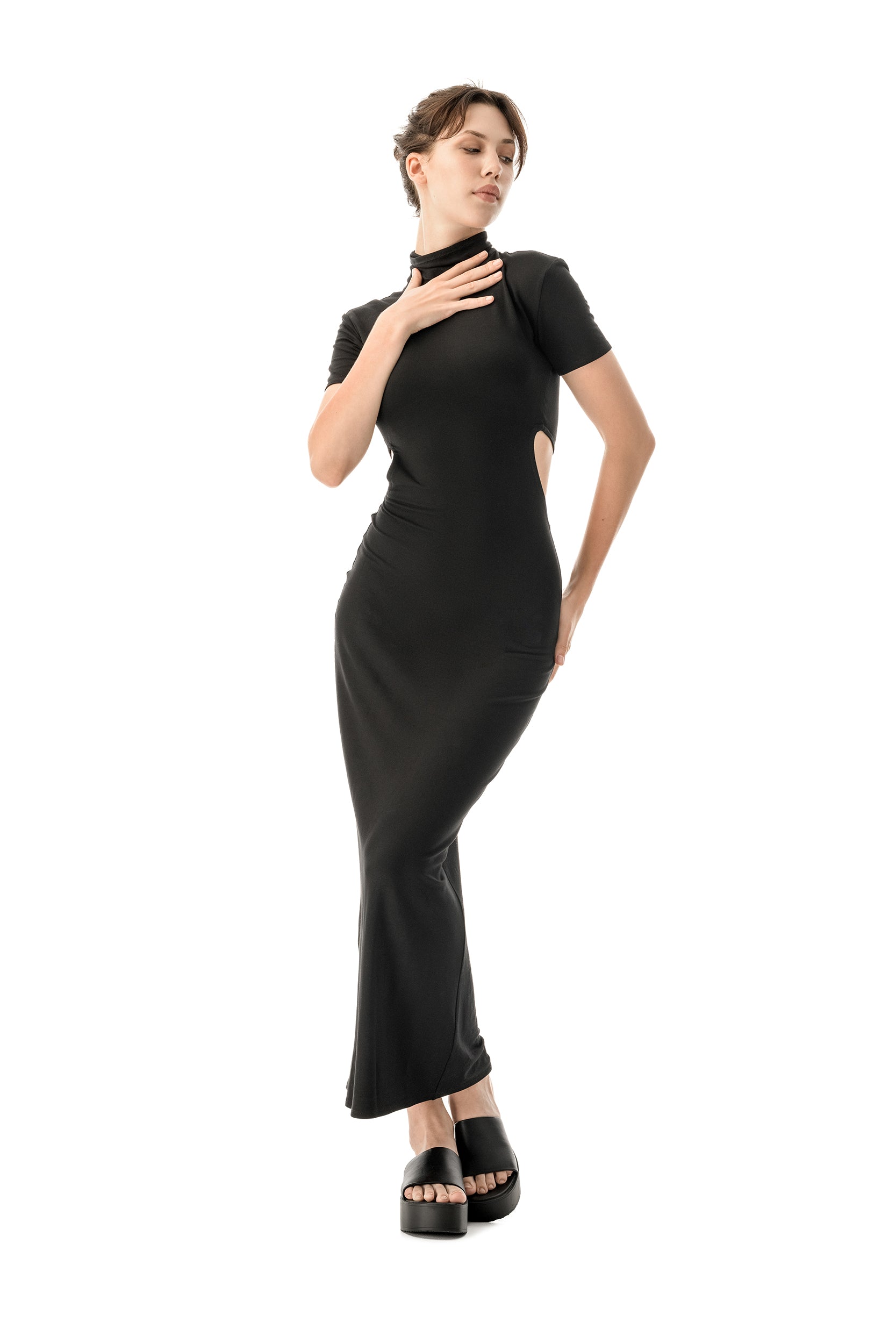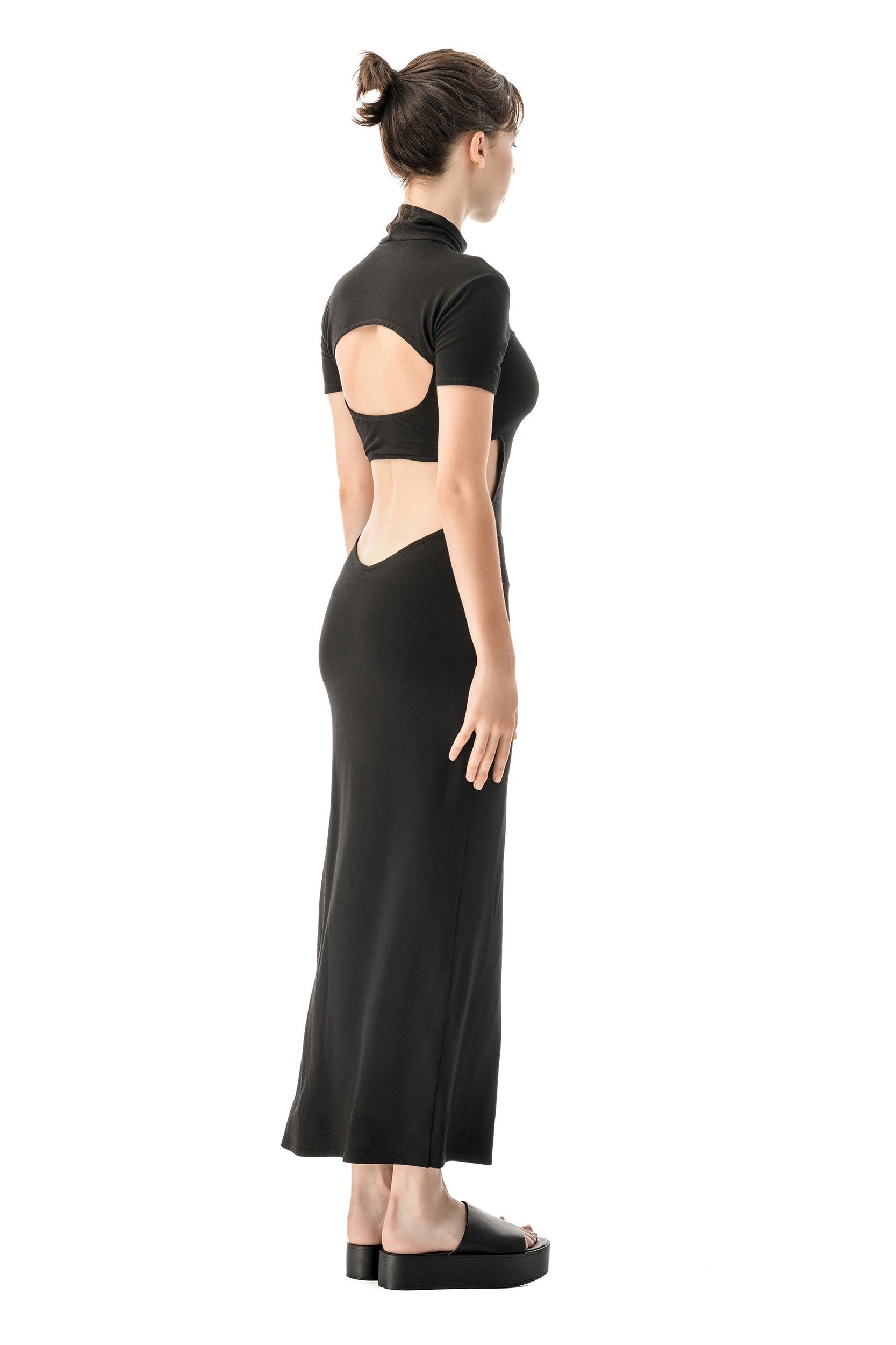 Allure is an elegant black dress featuring bold cutouts for a striking and classy look, making it the perfect alternative to the classic little black dress. Crafted from soft jersey viscose, it offers comfort while hugging the body with a slim fit that extends to ankle length.Made in Europe.