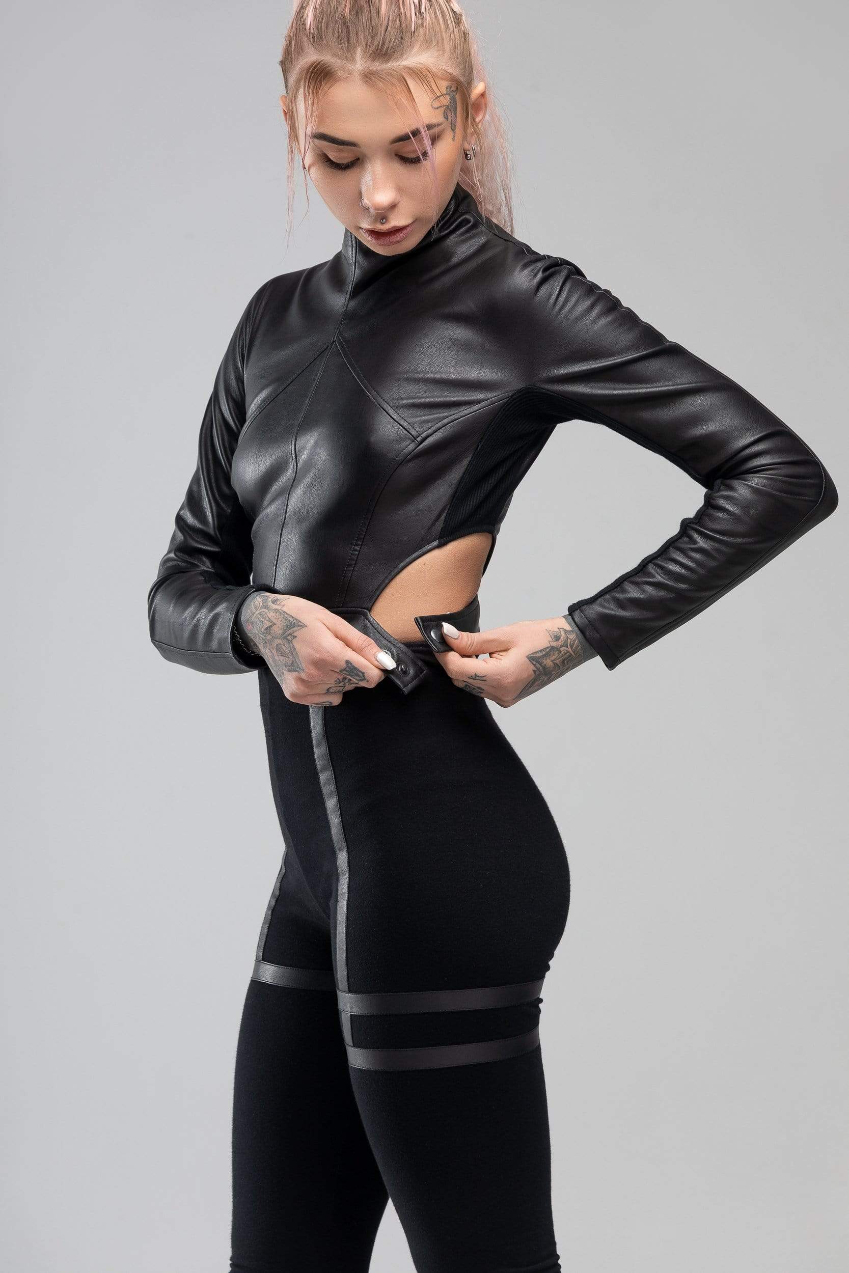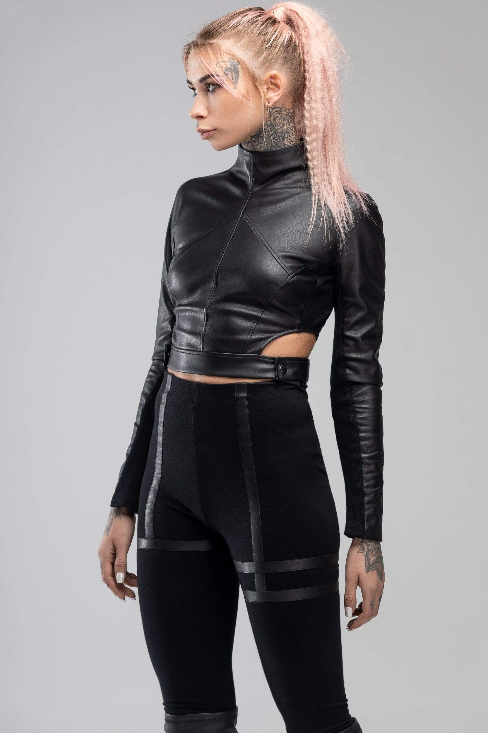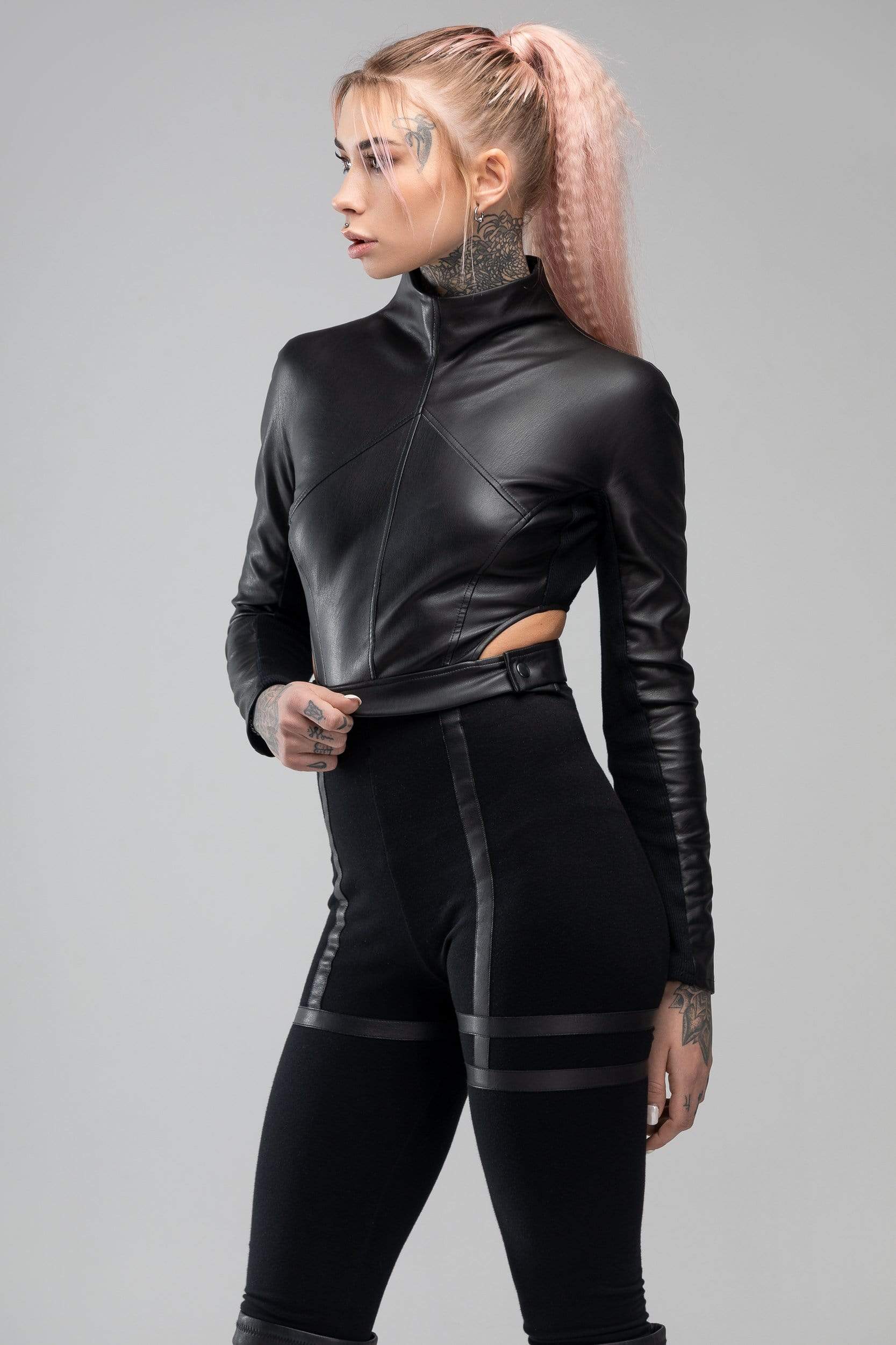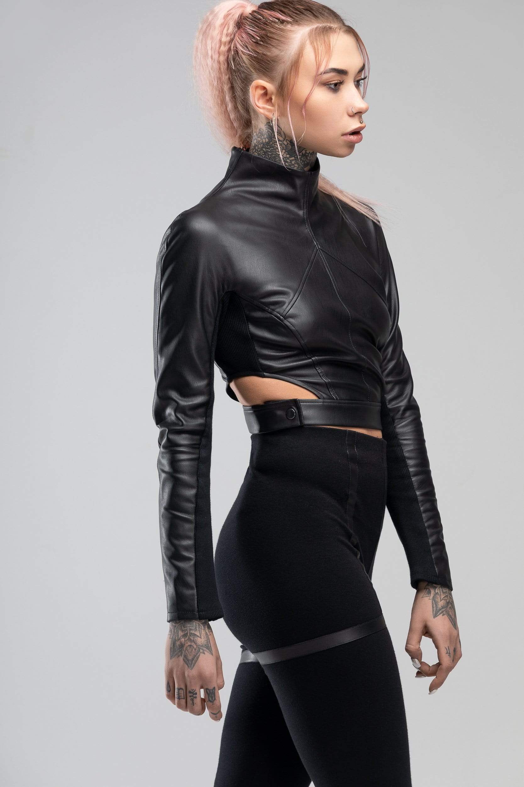 Looking for something really special? Our leather top might be the very thing you're after! This unconventional garment is sure to make you stand out in a crowd! Though the top is quite minimalistic, it has subtle details that make it look exotic and maybe even futuristic. The unusual placement of the zipper might not be the first thing to catch your eye, but it makes your look that much more interesting. The lower part of the top is firmly clasped with a button, creating the appearance of a belt, which also adds to the overall appeal of your outfit. Finally, the shape itself is quite interesting, revealing a tasteful amount of skin. The black color of this garment further improves on the minimalistic style and makes all the small details stand out even more, which in turn makes you look like you're something special yourself!