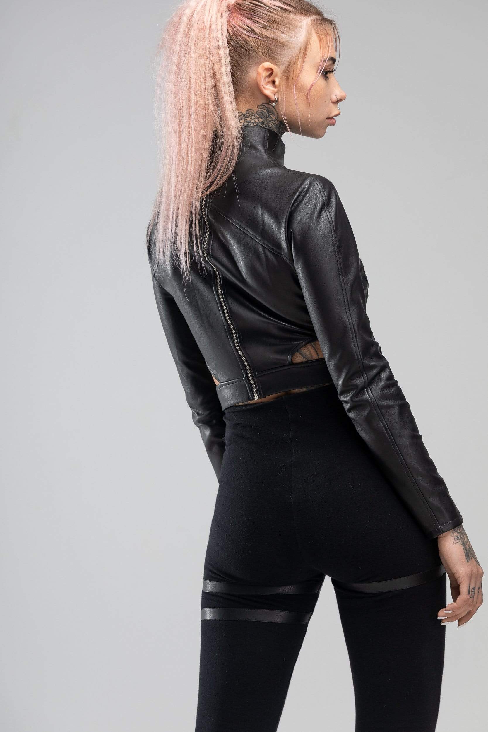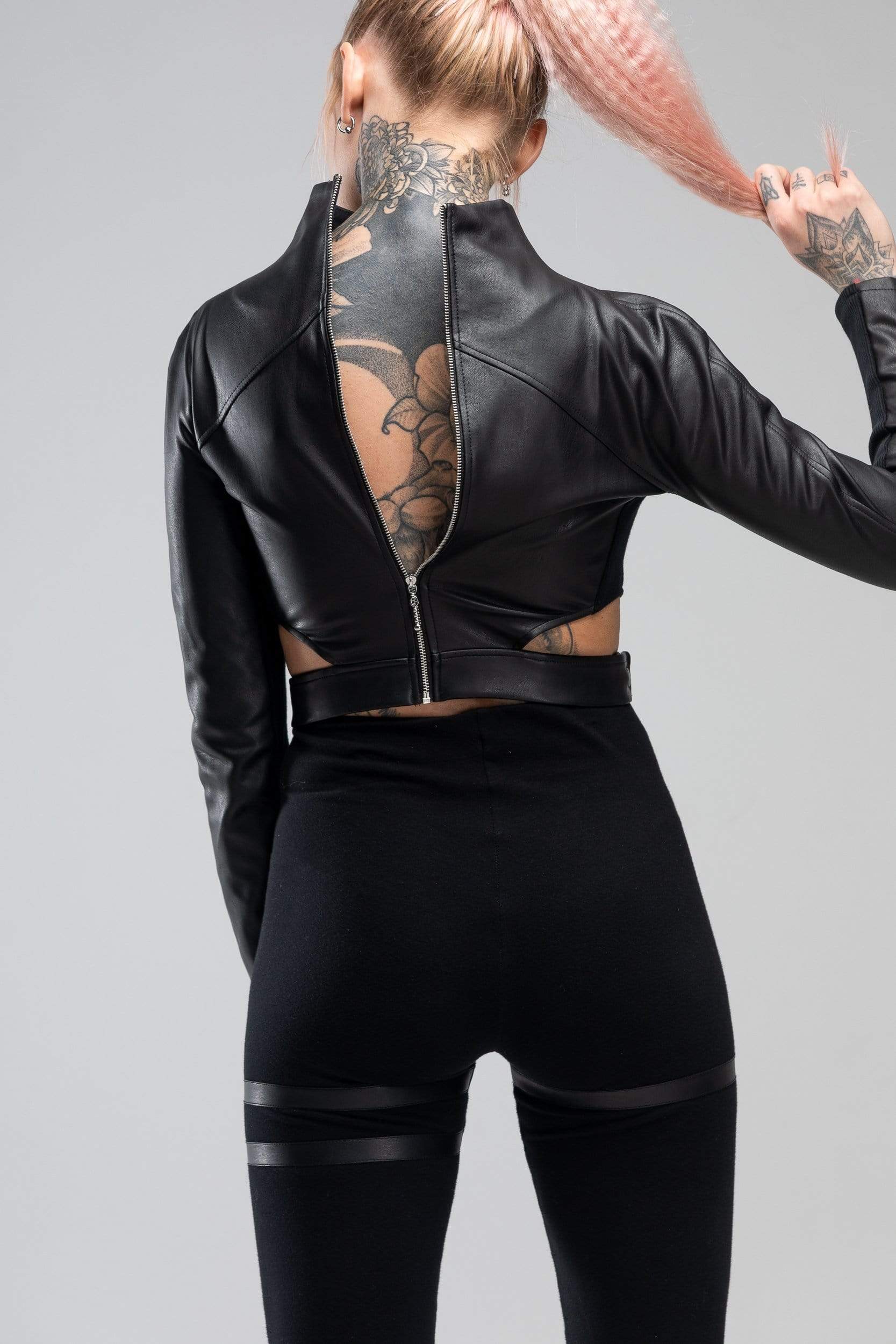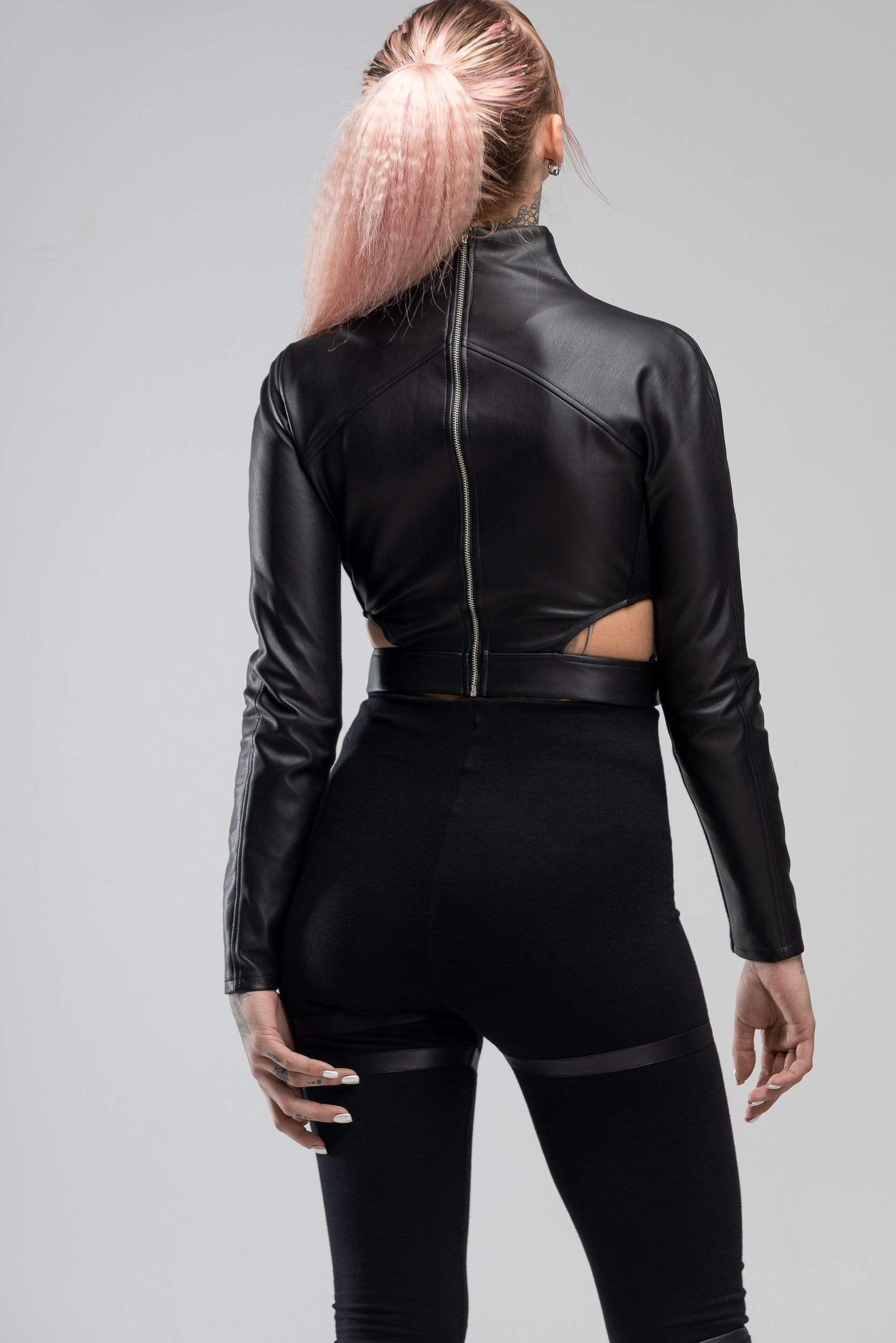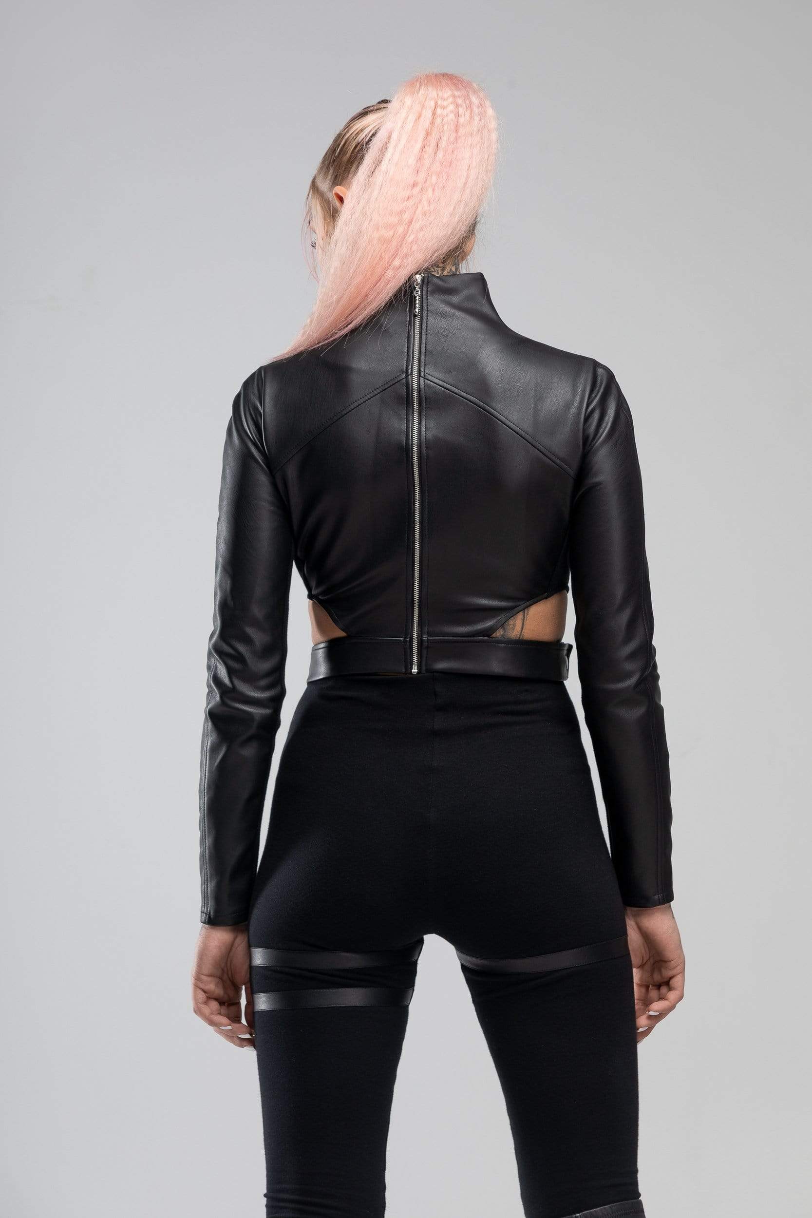 Looking for something really special? Our leather top might be the very thing you're after! This unconventional garment is sure to make you stand out in a crowd! Though the top is quite minimalistic, it has subtle details that make it look exotic and maybe even futuristic. The unusual placement of the zipper might not be the first thing to catch your eye, but it makes your look that much more interesting. The lower part of the top is firmly clasped with a button, creating the appearance of a belt, which also adds to the overall appeal of your outfit. Finally, the shape itself is quite interesting, revealing a tasteful amount of skin. The black color of this garment further improves on the minimalistic style and makes all the small details stand out even more, which in turn makes you look like you're something special yourself!