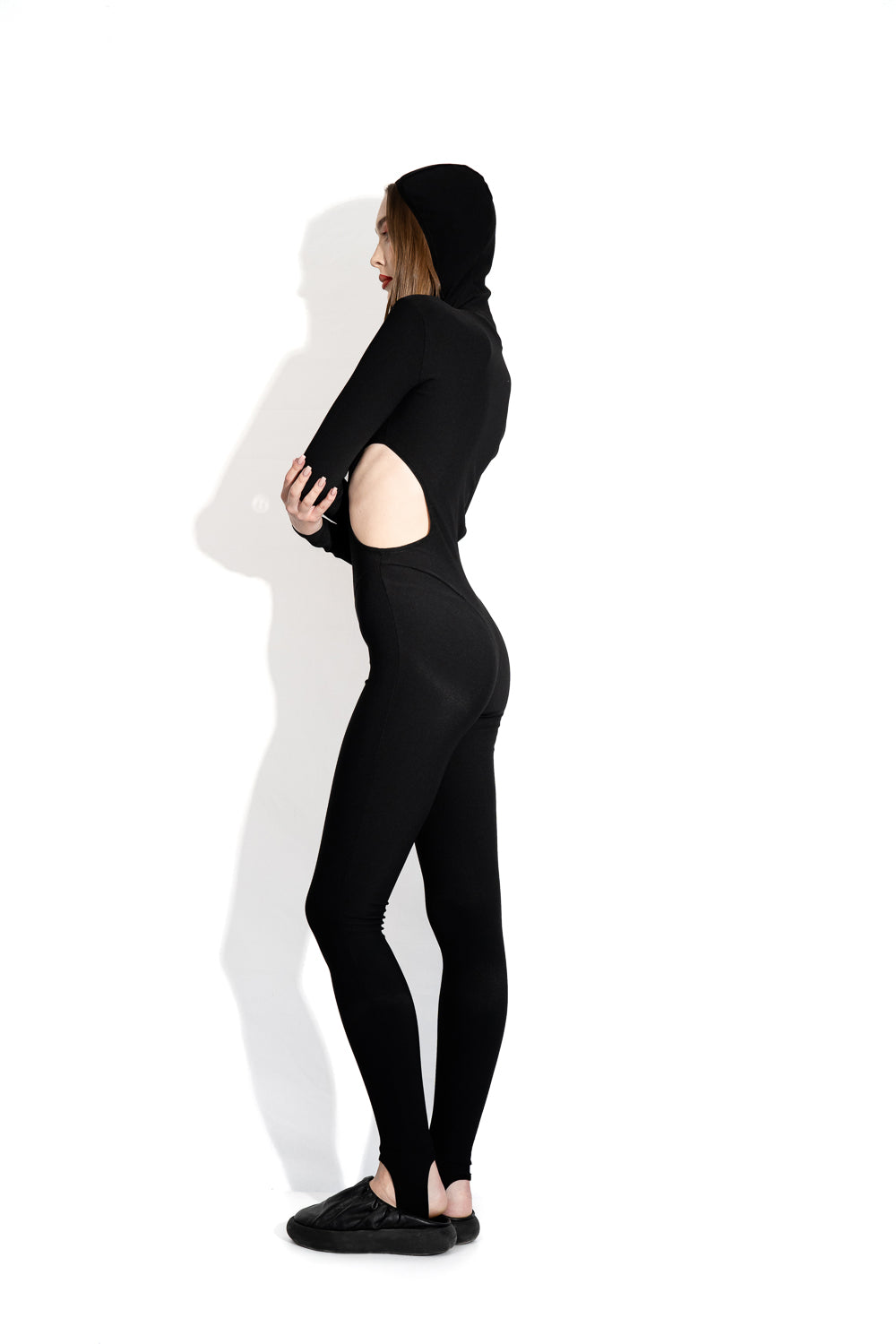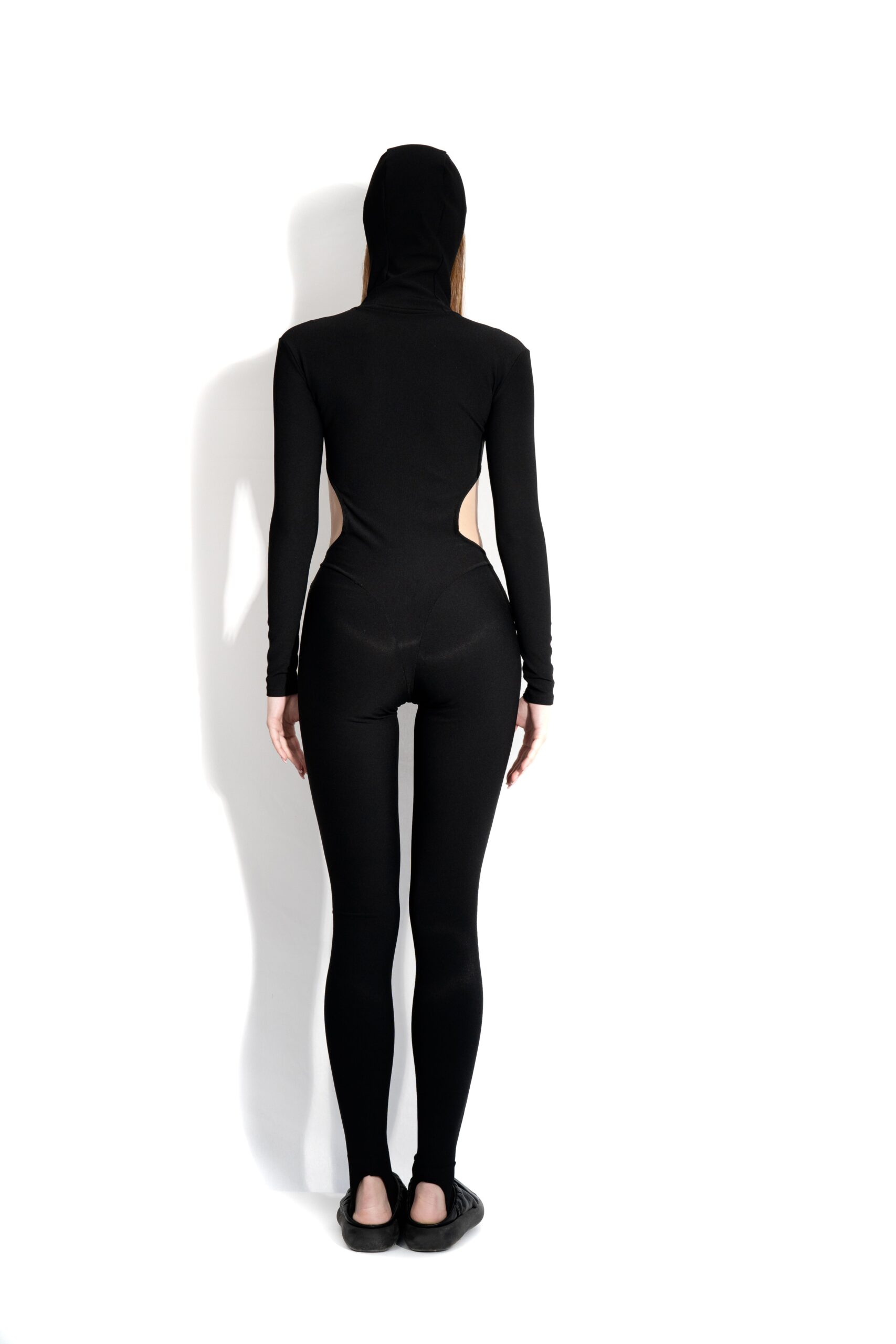 This fitted bodysuit, crafted from enveloping biflex viscose fabric, features a hood, side cutouts, and a front zip closure. Wear it fully zipped for a sleek, streamlined look, or unzip it to reveal a seductive plunging neckline.
