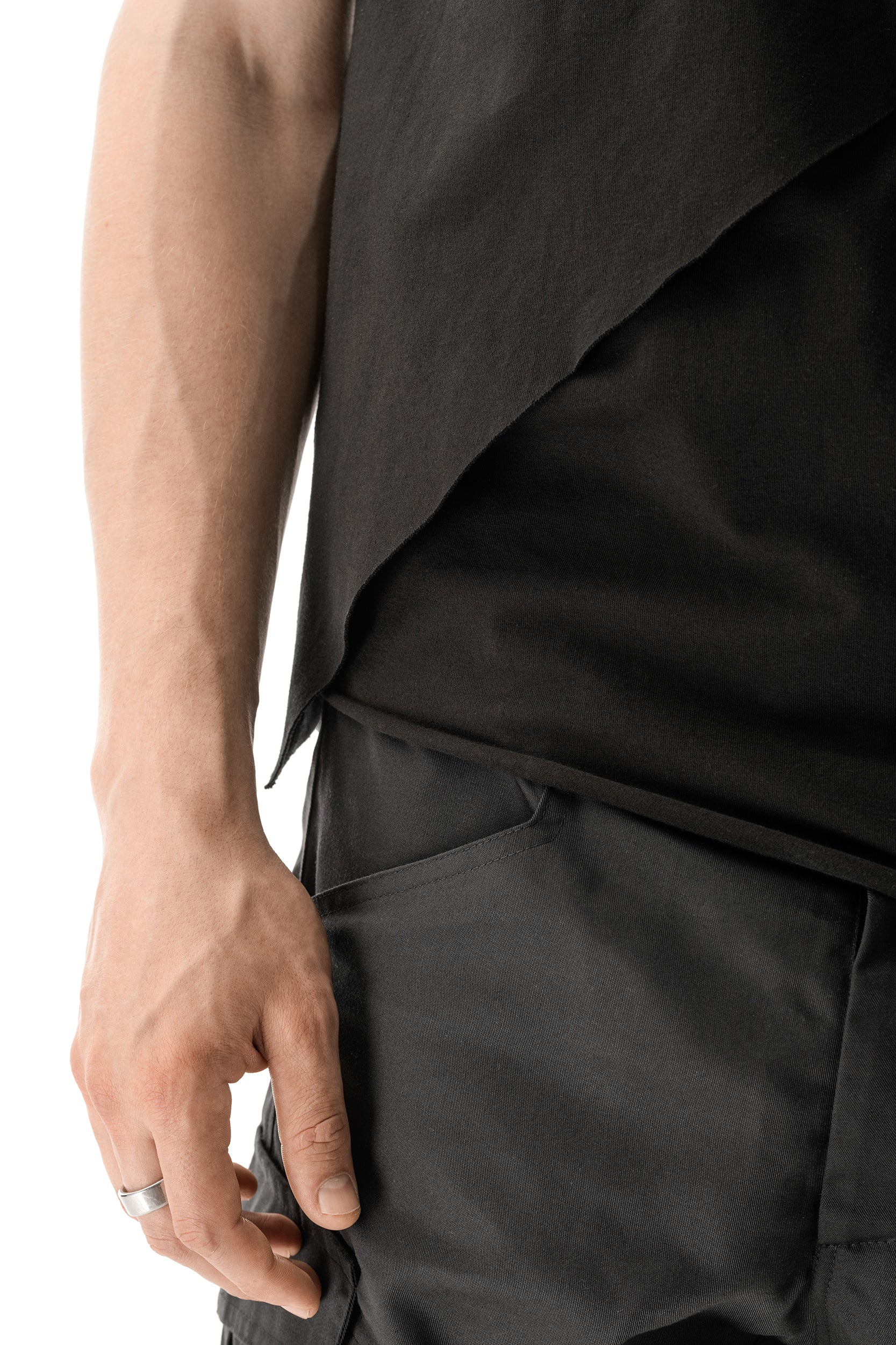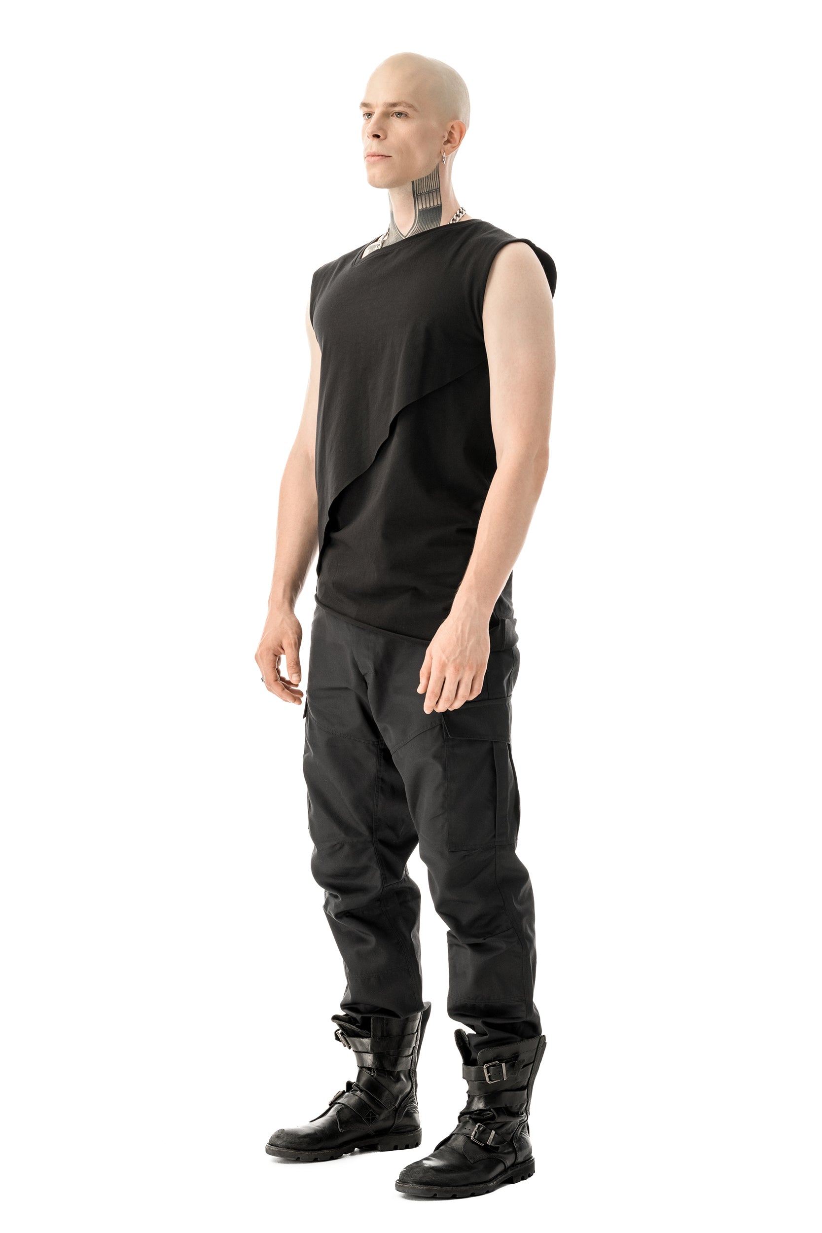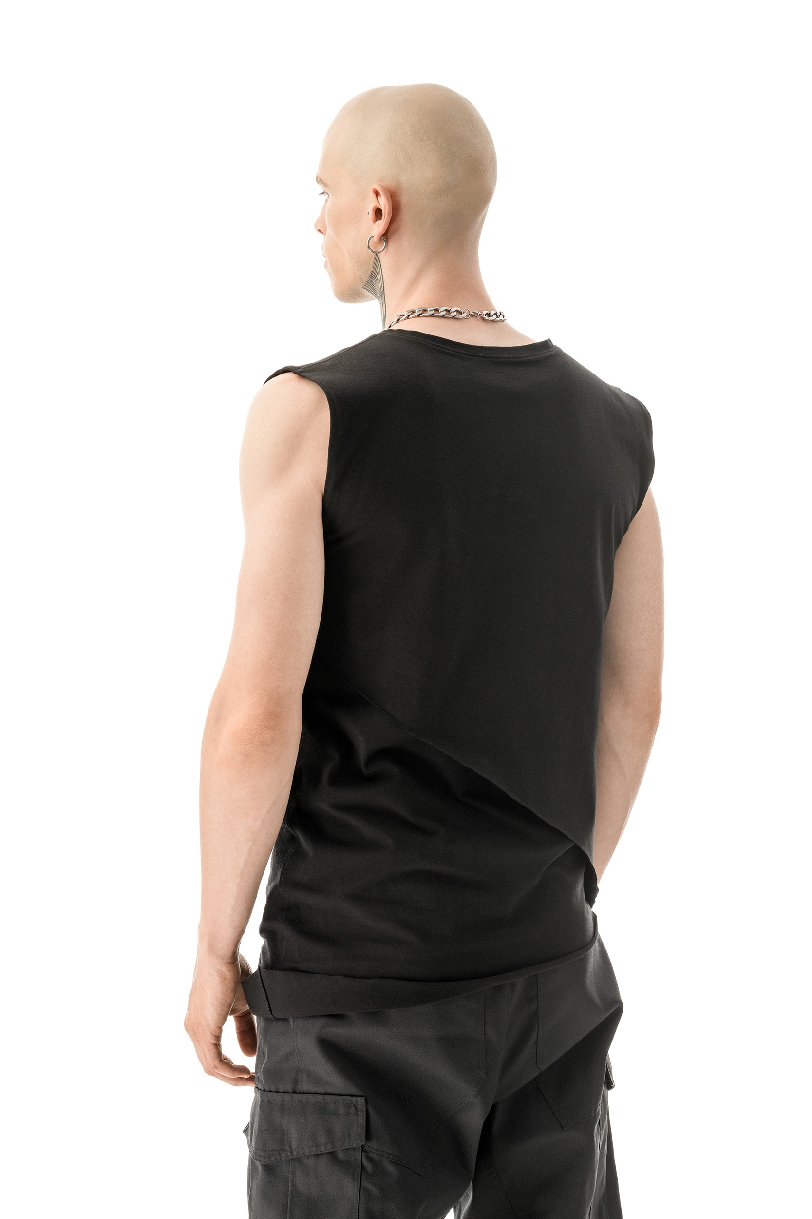 Brief is the perfect t-shirt to showcase your inner confidence, whether you're heading to a club or layering for everyday wear. This double-layered sleeveless top features an atypical neckline and geometric lines, adding an edgy touch to your look.