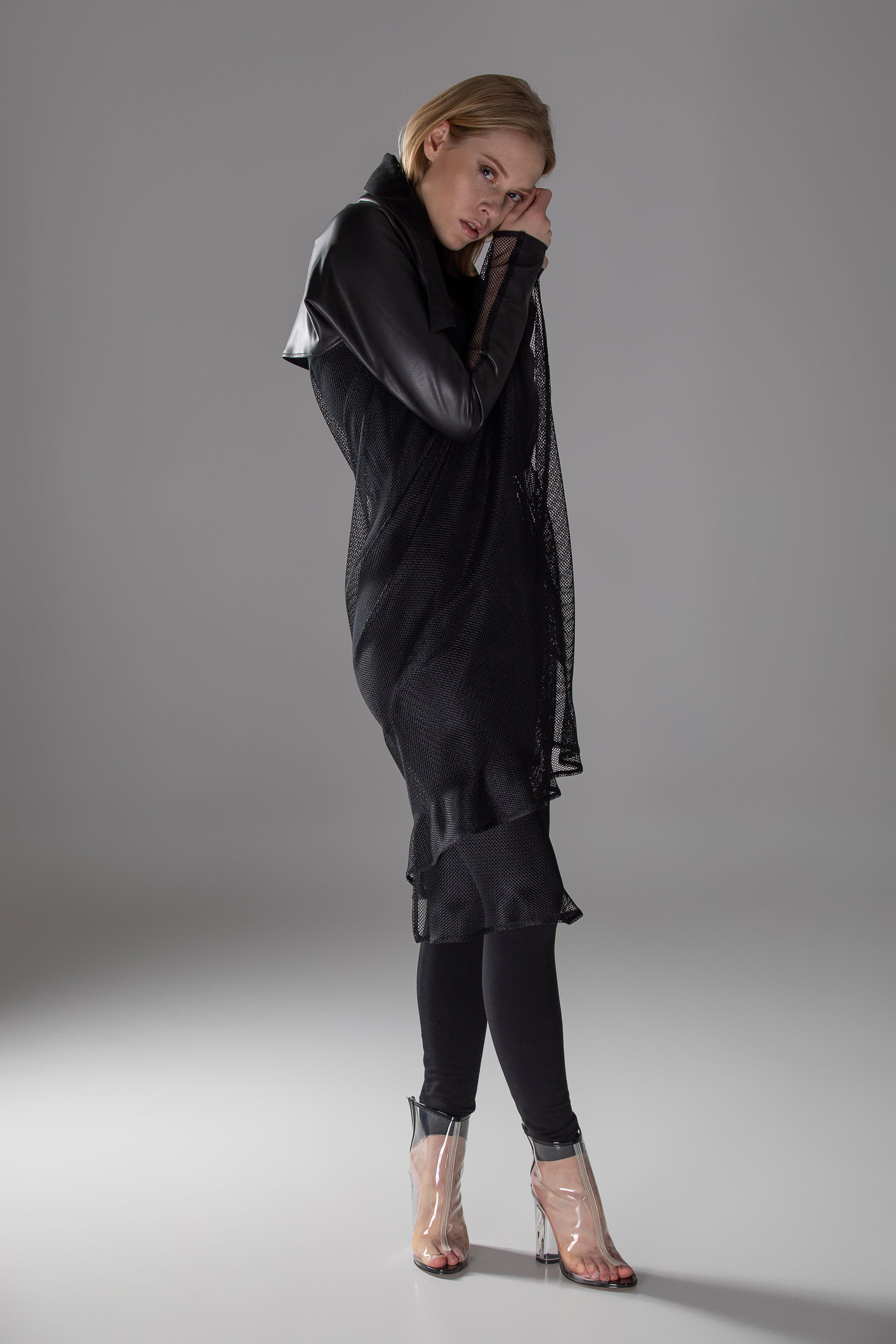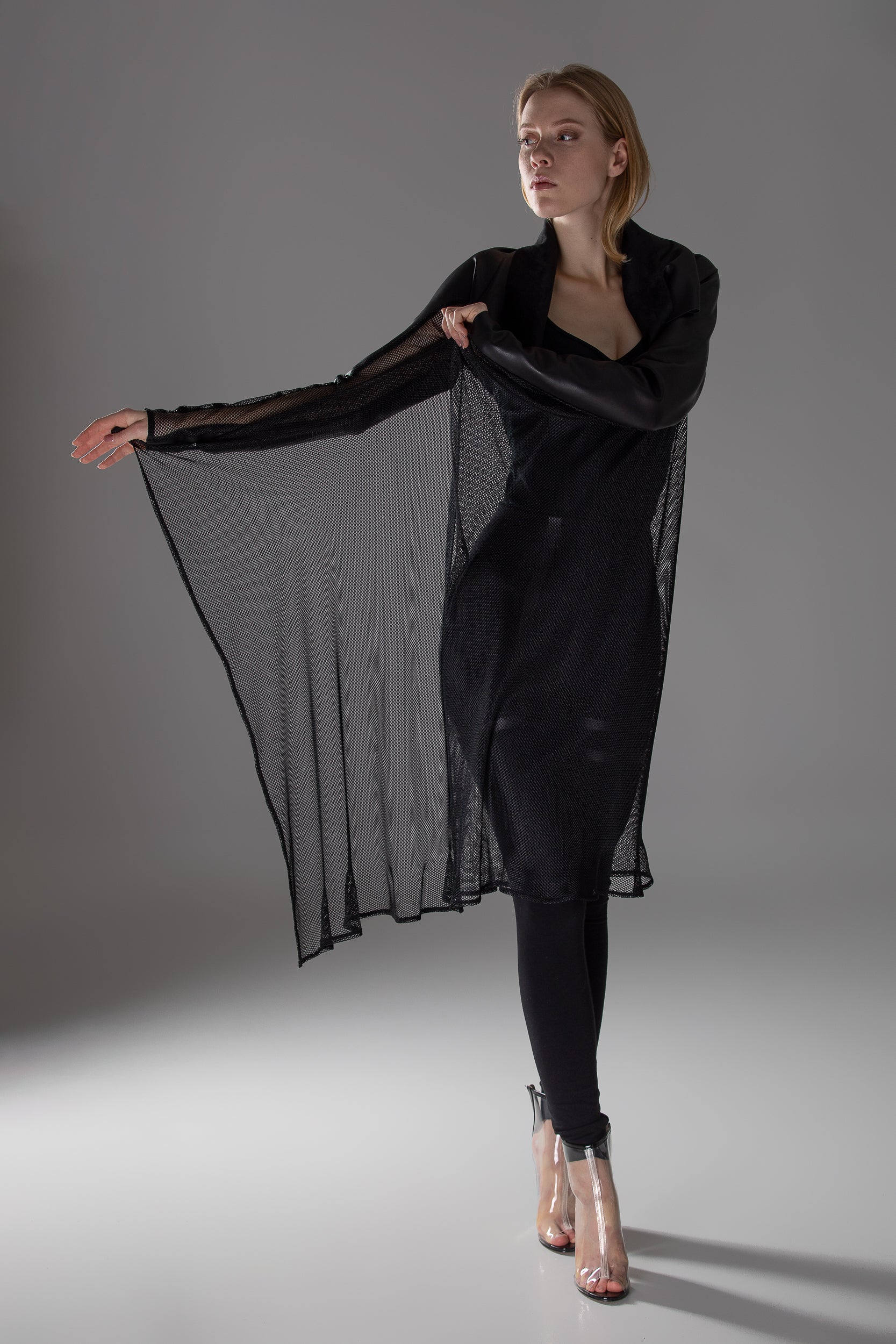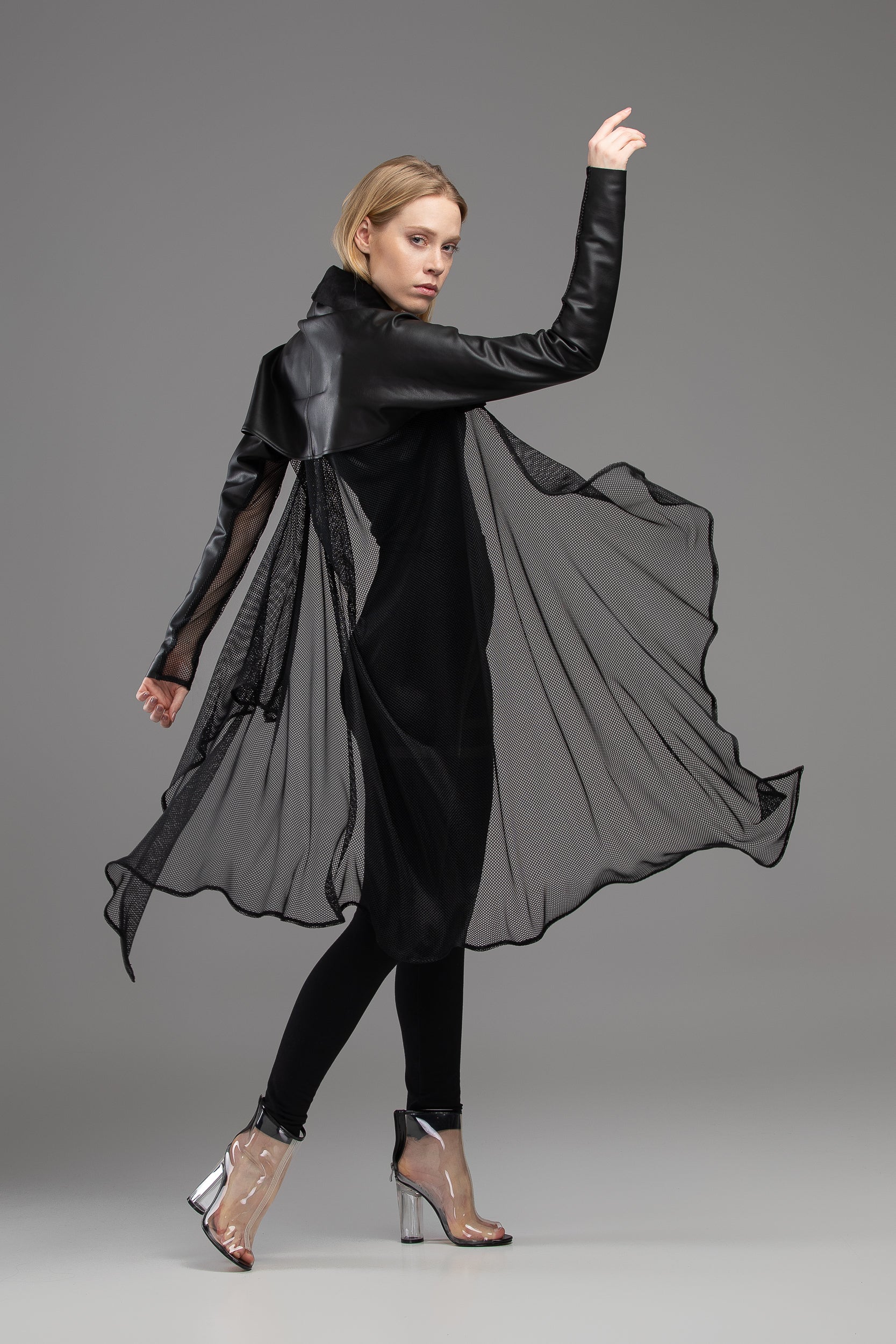 There are garments that are able to single-handedly enhance your everyday look, making it really stand out, even when paired with the most ordinary clothes. Not to say that you should, but this item will really shine when combined with other unique, minimalistic clothes. This jacket/cape is one of them. The top of it looks just like a normal eco leather jacket, but then it transitions into the fabric mesh cape. The result is a truly unconventional and unique look that is certain to turn some heads!
