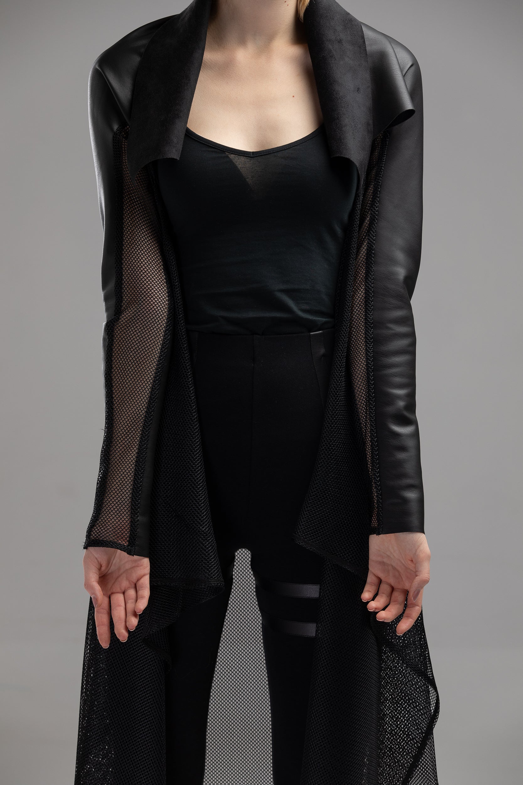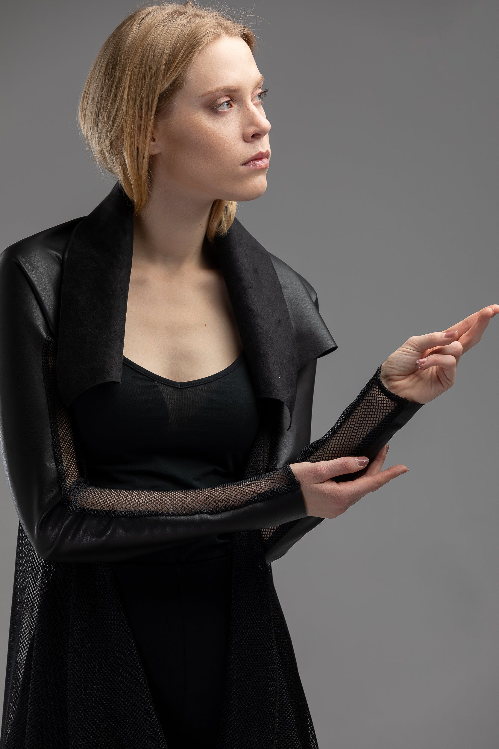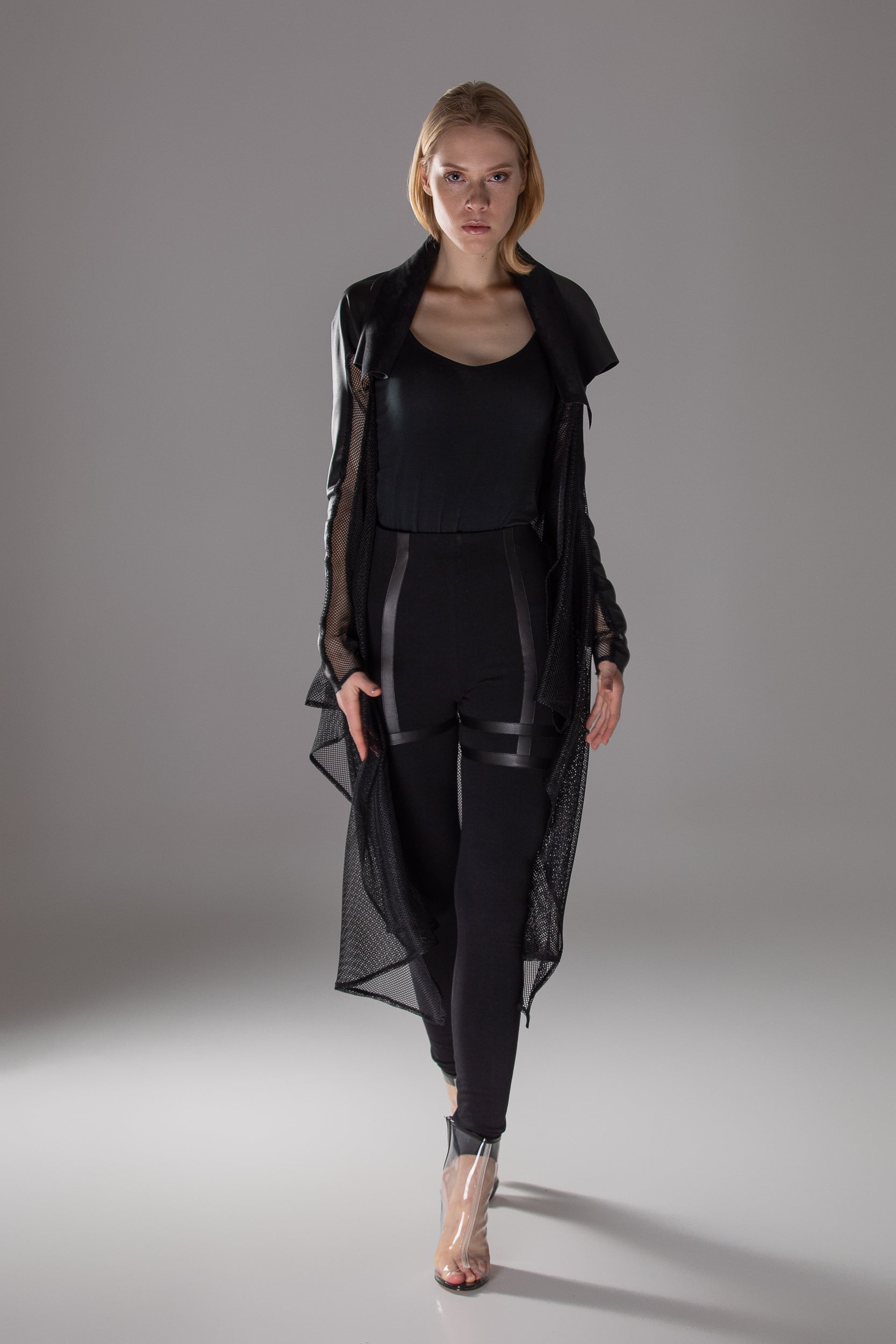 There are garments that are able to single-handedly enhance your everyday look, making it really stand out, even when paired with the most ordinary clothes. Not to say that you should, but this item will really shine when combined with other unique, minimalistic clothes. This jacket/cape is one of them. The top of it looks just like a normal eco leather jacket, but then it transitions into the fabric mesh cape. The result is a truly unconventional and unique look that is certain to turn some heads!