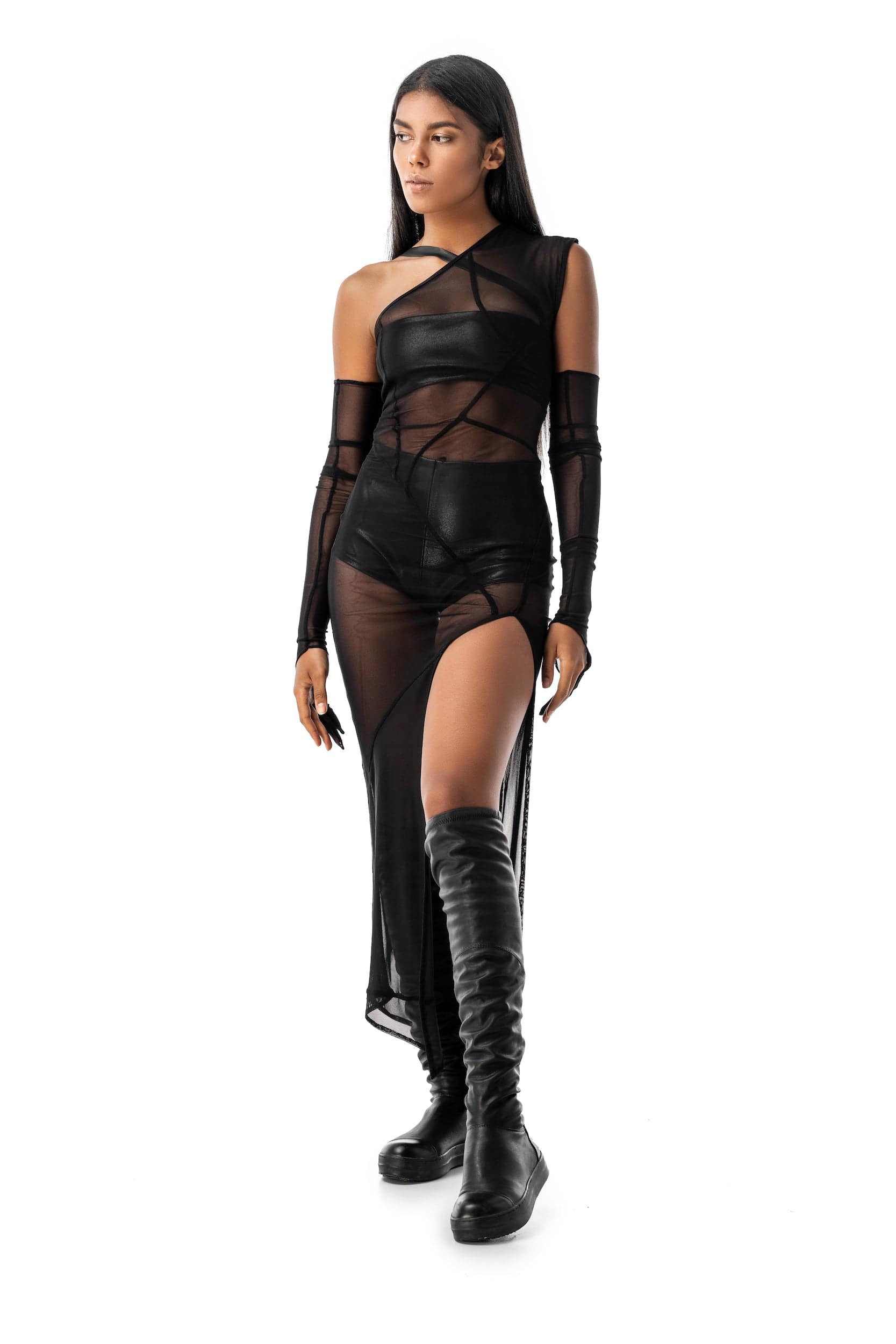 The fabric follows the natural body line to the high-thigh level where it splits to allow larger freedom of movement while staying true to its overall seductive essence.