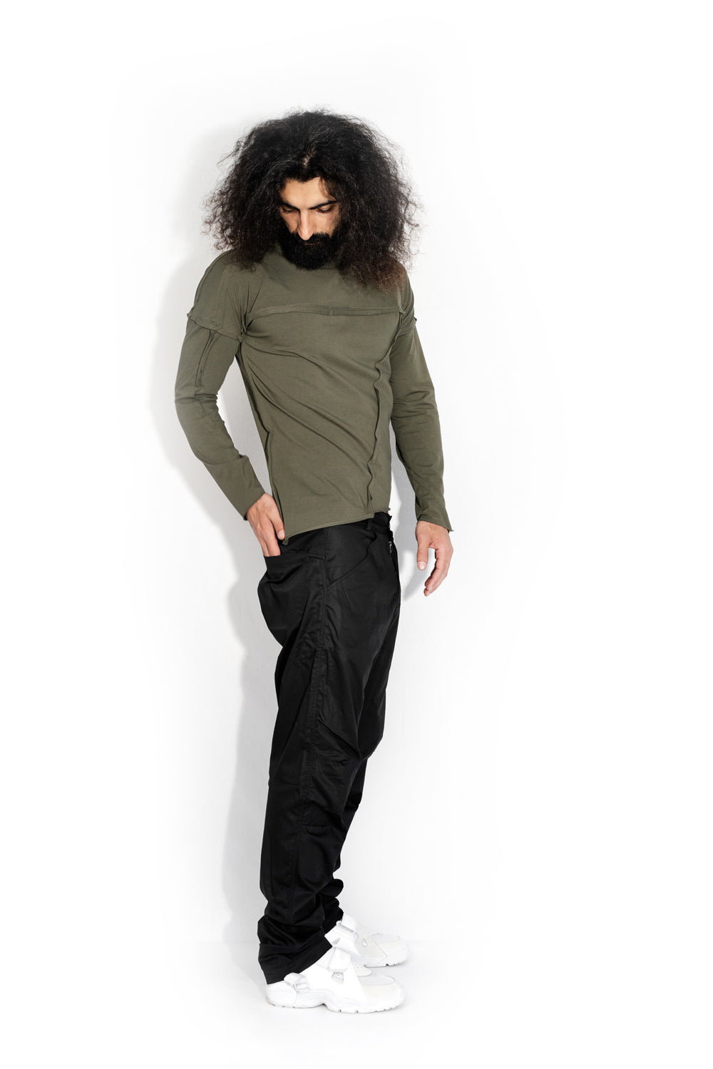 This long-sleeve shirt is made for the ones who tend to have a playful desire to question and explore and is meant to show their individual character. A collection of imaginative ideas and views on a modern world is translated into this diving shirt marked by a high degree of detail. The shirt's structure is distorted and intertwined to bring peculiar beauty and mirror your personality. Using soft cotton jersey fabric, we have constructed seam allowance outside the garment that crosses the chest and spreads around the slim fit body of the shirt. With dropped shoulders and asymmetric hem longer on the right side, the back is further accentuated with a triangle application.