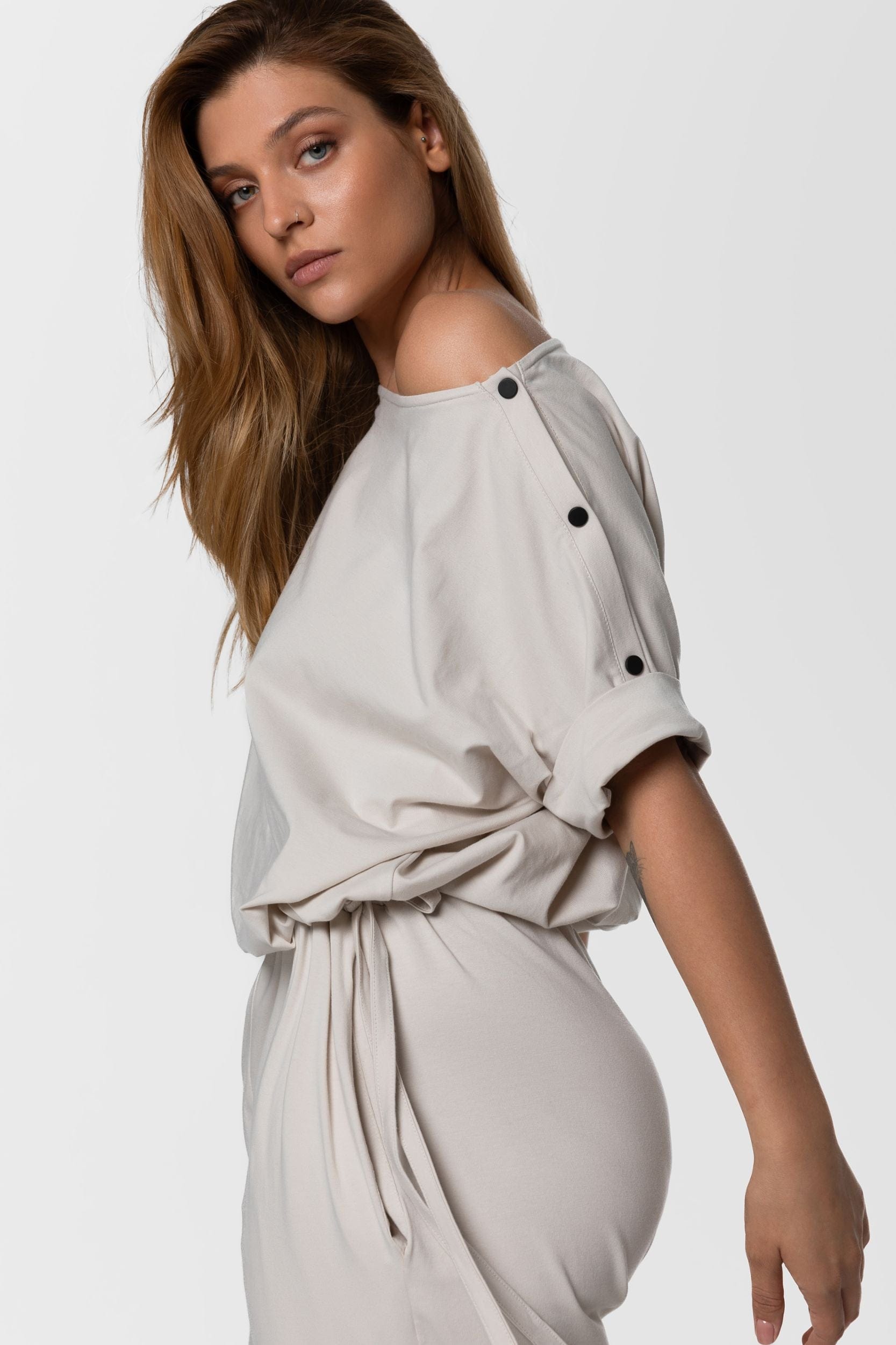 This jumpsuit stands out with its elegant appearance and comfortable feel. It comes equipped with drawstrings at the waist, allowing you to adjust it for a personalized fit. Whether you choose to cinch it or untighten it, you can embrace a sense of freedom and confidence in your style. Additionally, it boasts a wide neck, spacious pockets, and a smart button closure on the shoulder, bringing together all the details for an elegant and practical design.