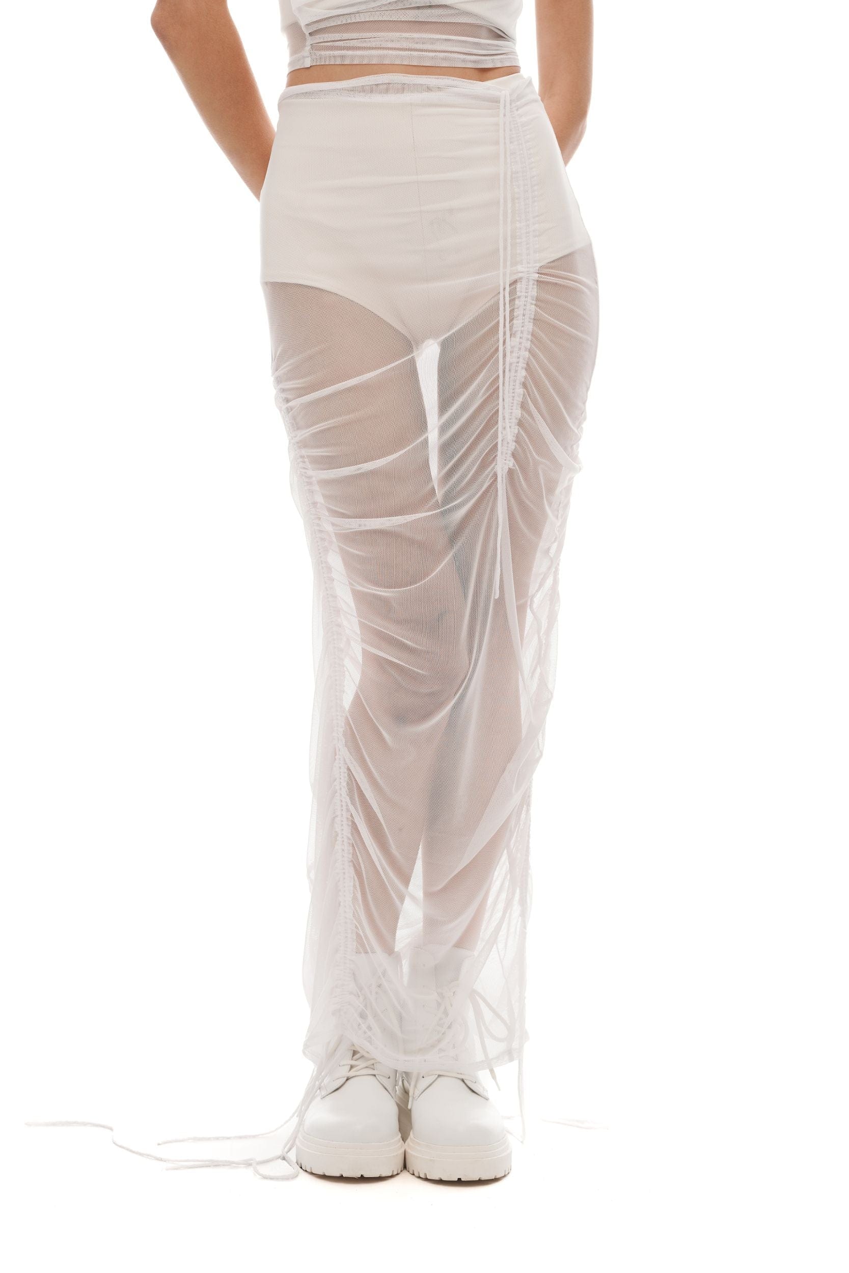 Made from lightweight mesh knit in white, the skirt goes up to the waist and sketches a transparent construction that effortlessly envelops your frame and communicates a nonchalant temper.