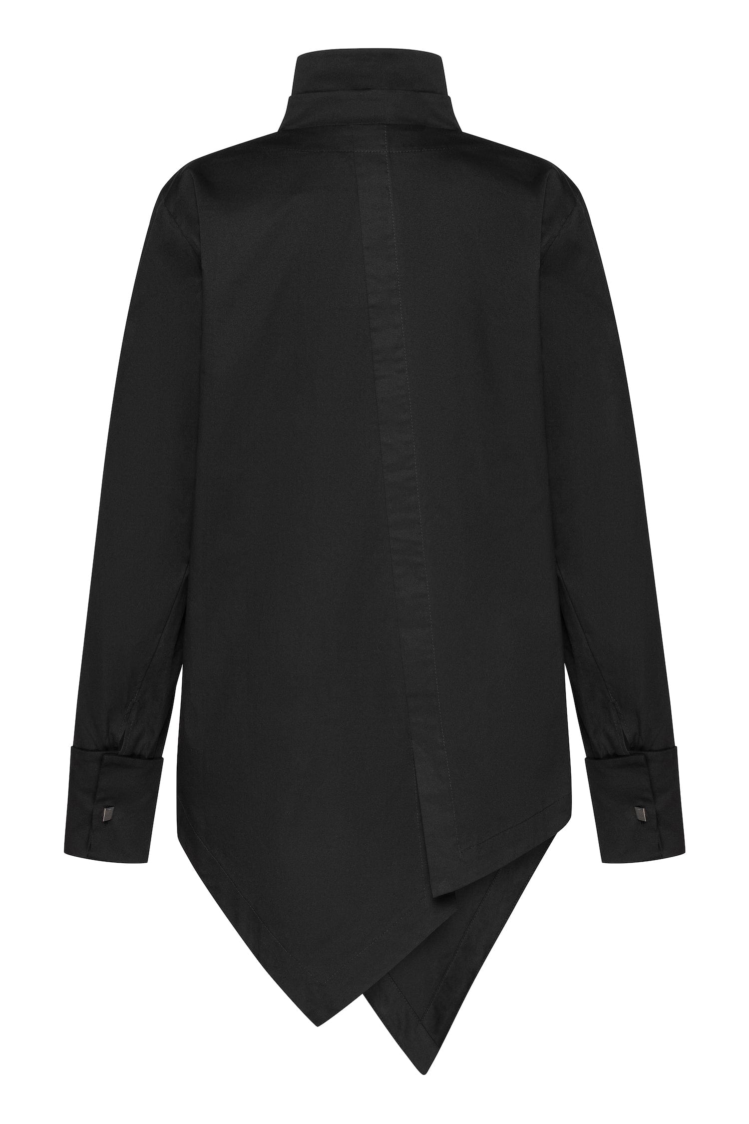 The shirt has a straight movable form and is enhanced with an unbalanced double collar that presents its sharp corners.