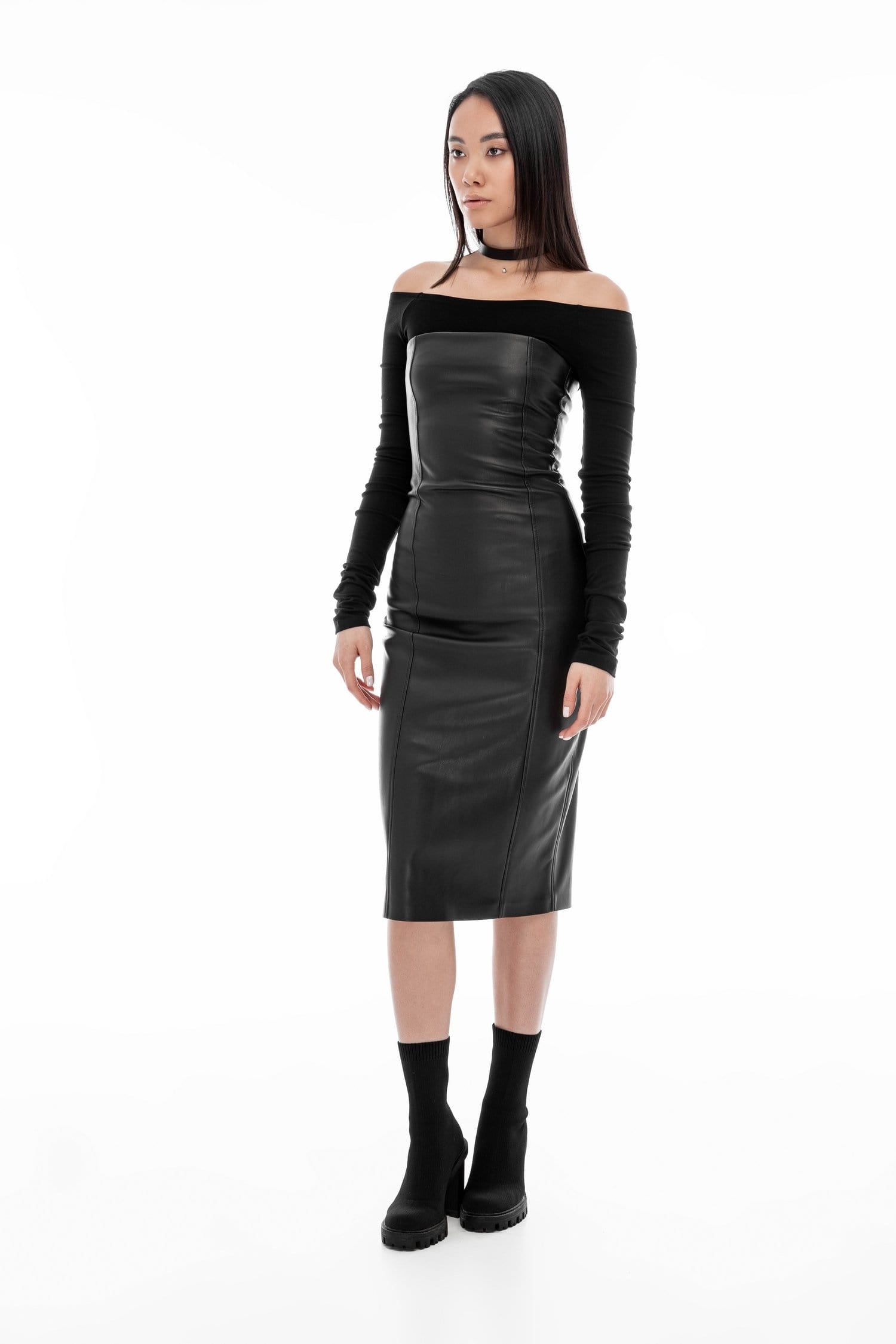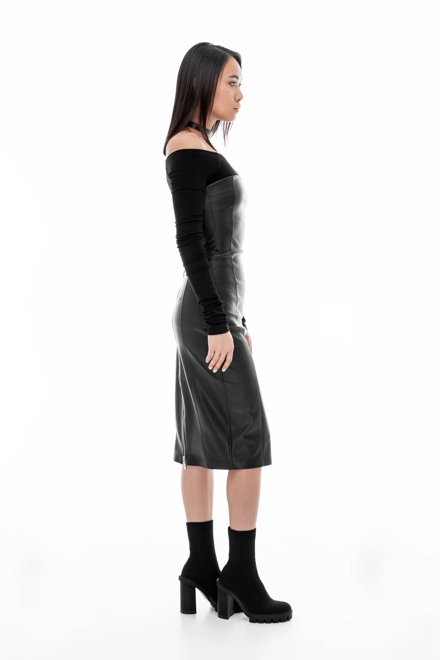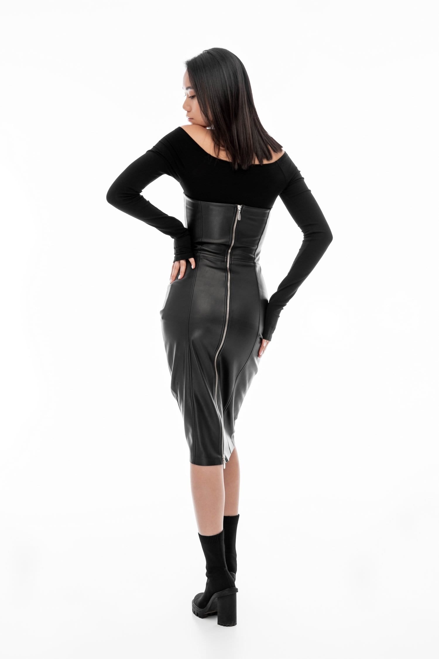 A seductive symphony of elegance and charm, Gori-ka midi dress is cut from panels of smooth eco-leather vertically arranged to create a silhouette that effortlessly moulds to every curve of the body.