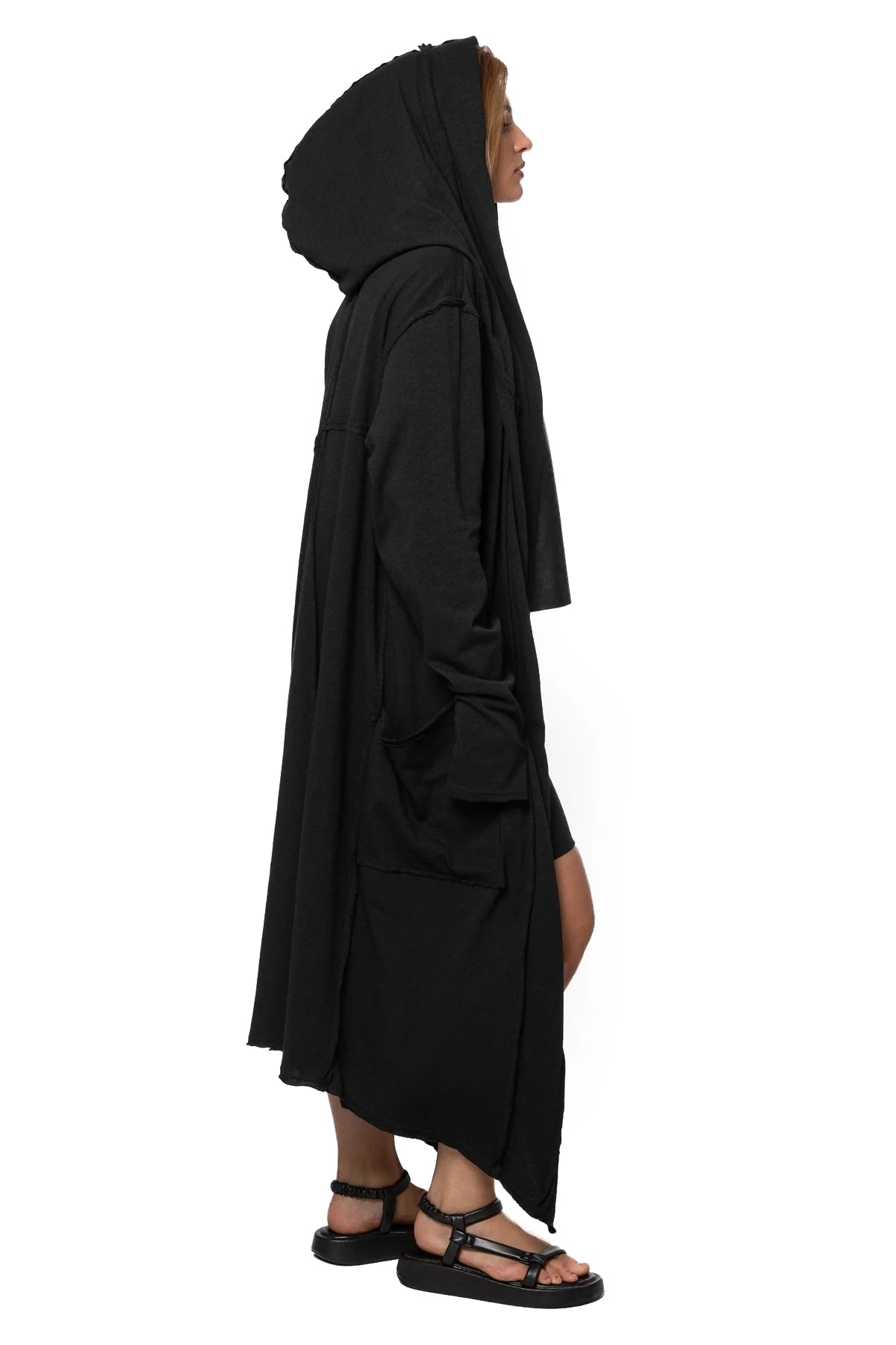 Introducing our revamped lighter version of the iconic mantle. This lightweight buttonless cardigan features a relaxed silhouette, signature oversized hood, roomy pockets, and asymmetric hemline. What sets it apart is the exposed seams, lending it a touch of raw finish. Perfect for warm summers but adaptable beyond the season. Pair it with anything, though we like pairing it with shorts and delicate tops to create a striking contrast.