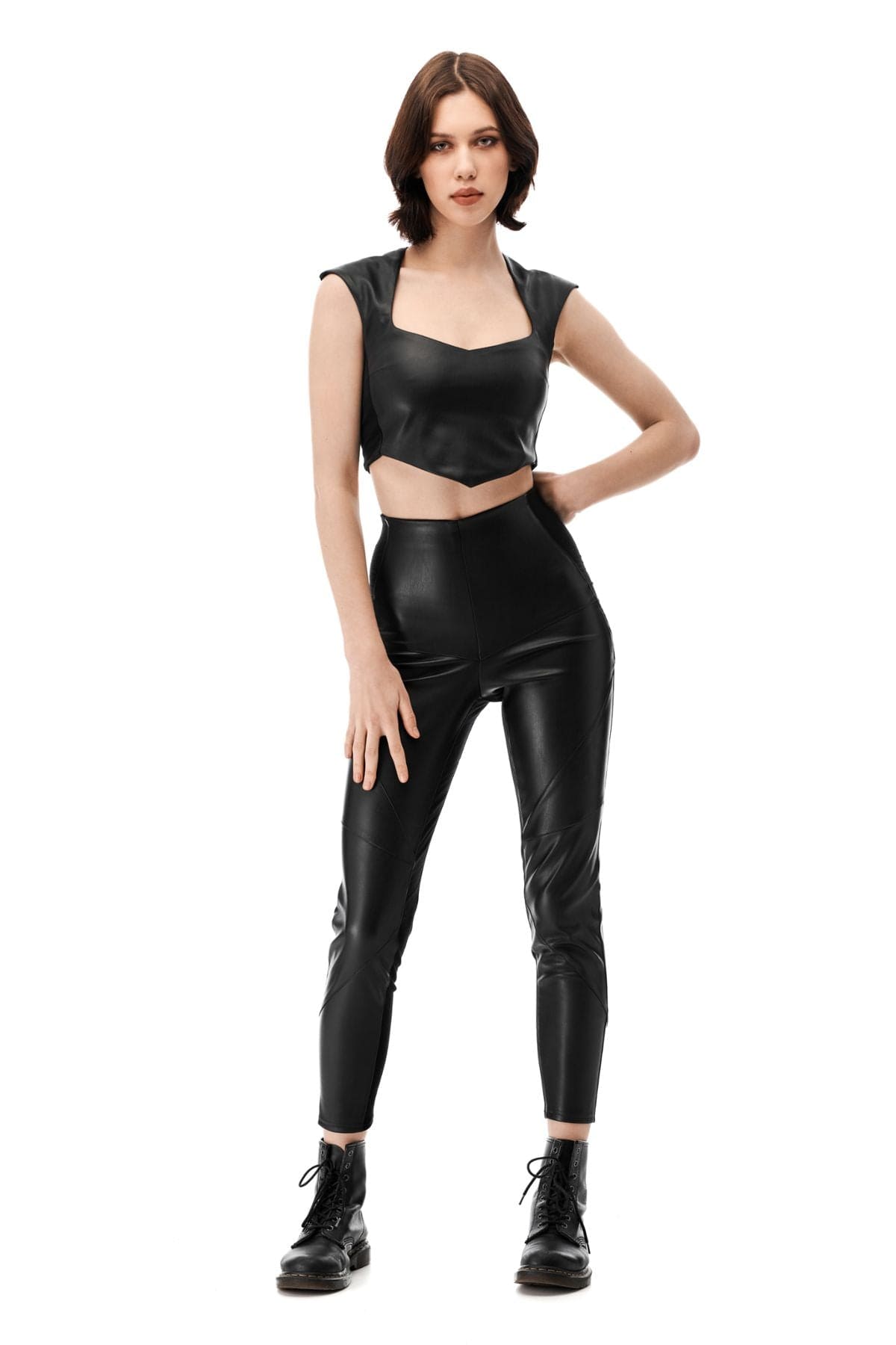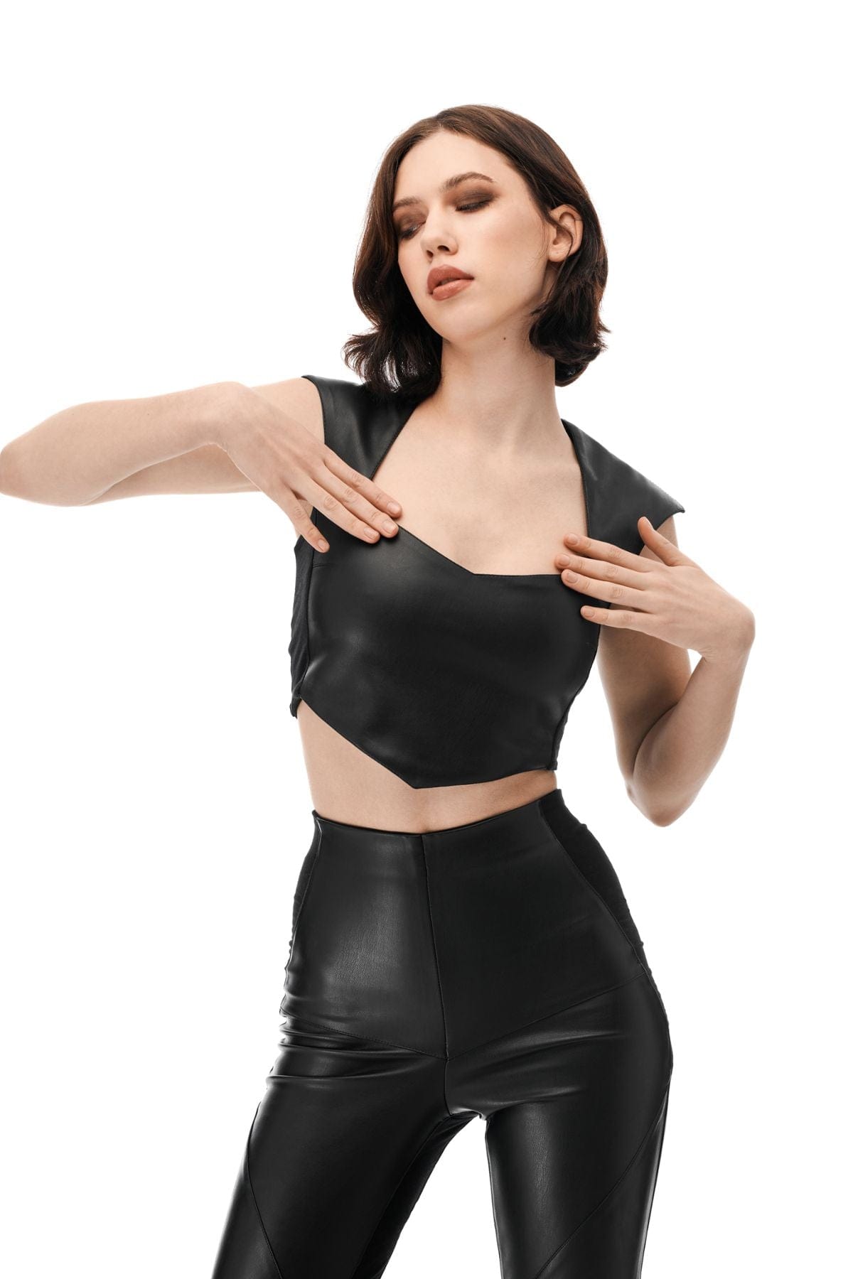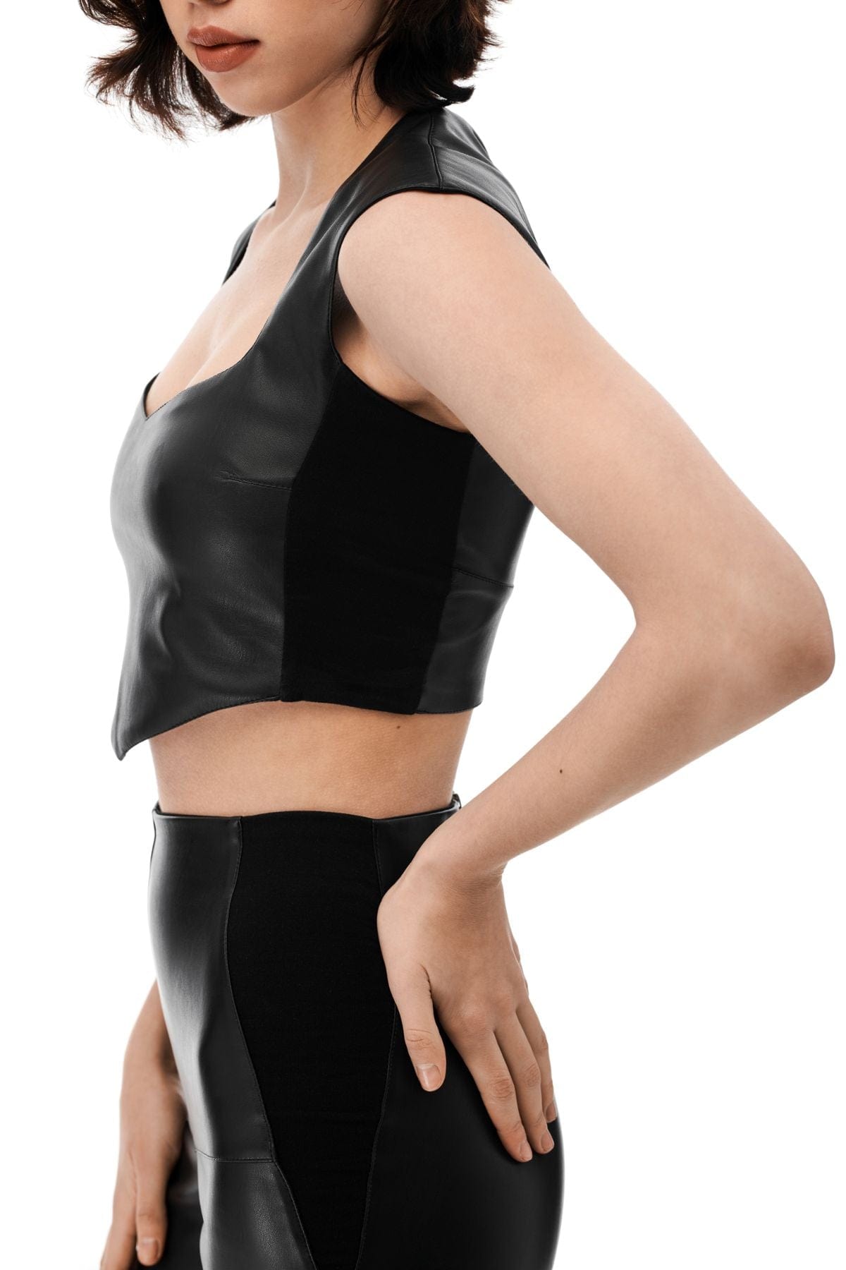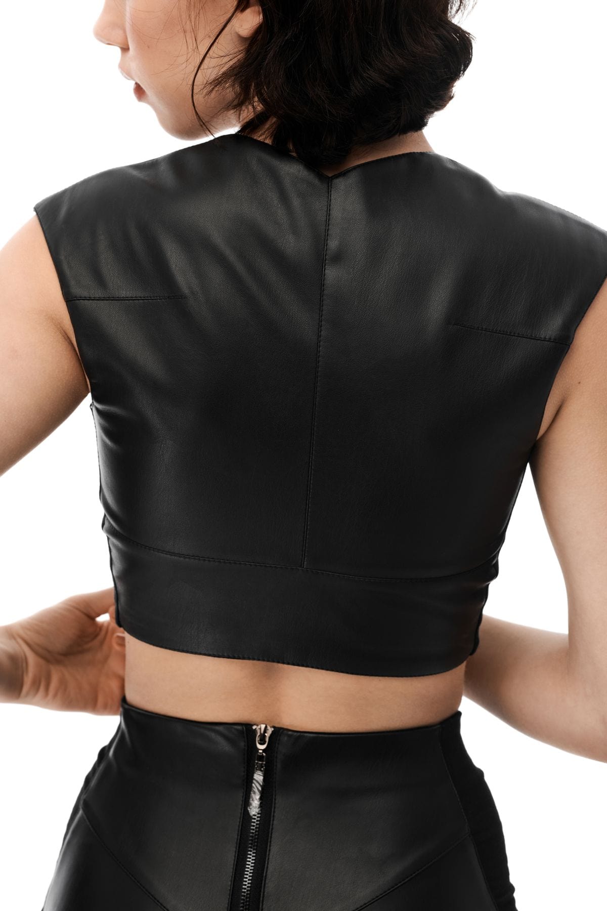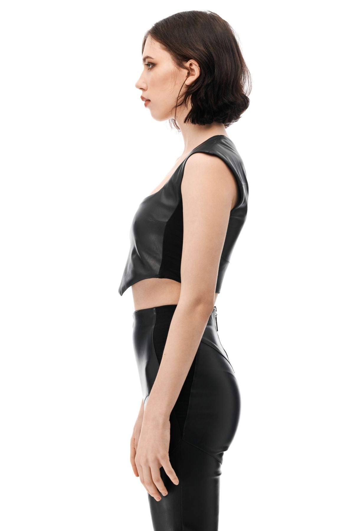 This crop top is sure to add an edgy twist to your look. Crafted from luxe eco-leather, it boasts wide angular shoulders and decorative seams on the back to create a powerful silhouette, while the jersey inserts on the sides provide comfort. The neckline is accentuated for a flattering finish. Wear it with any high-waisted bottoms for a fashion-forward look.