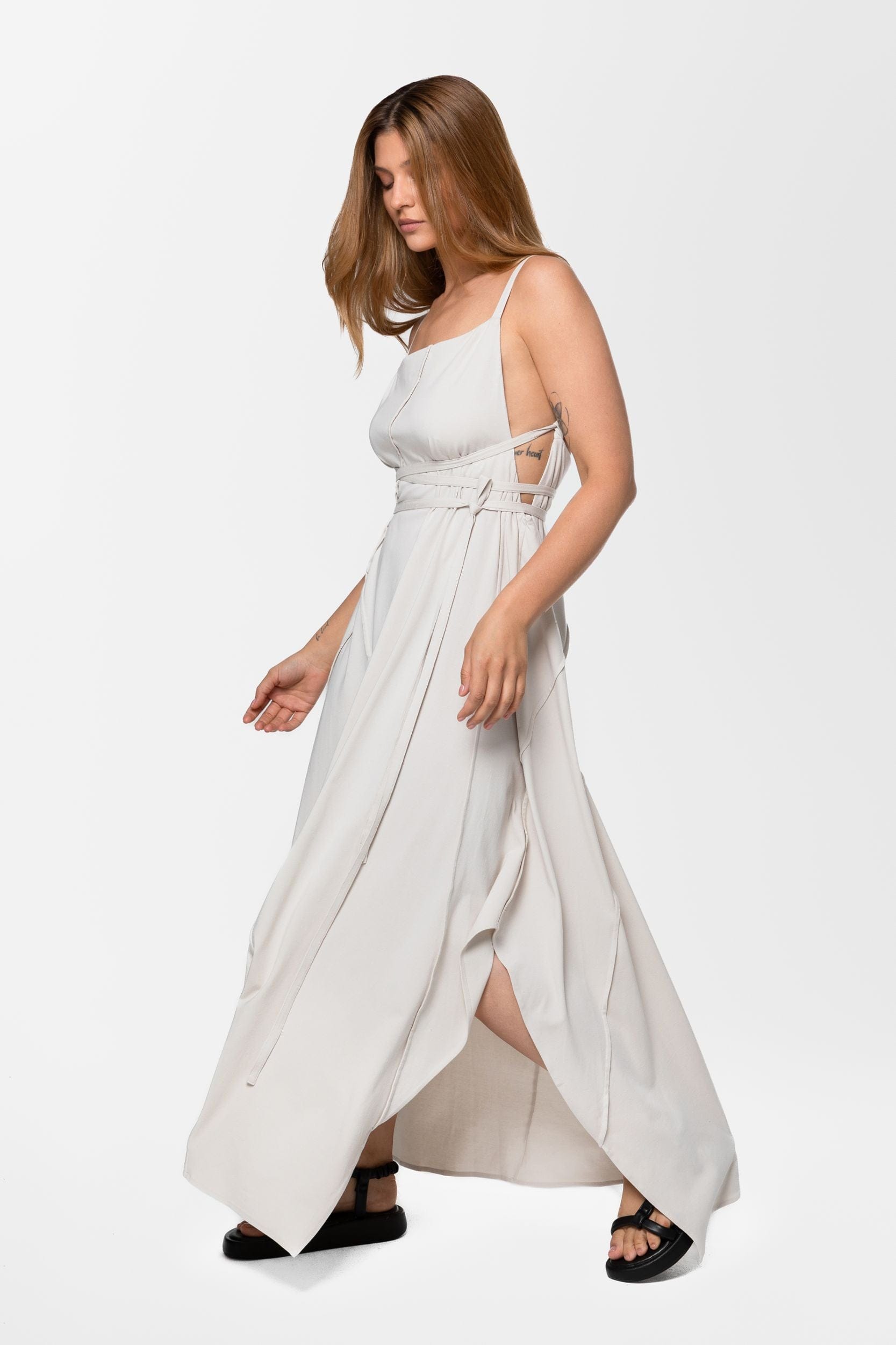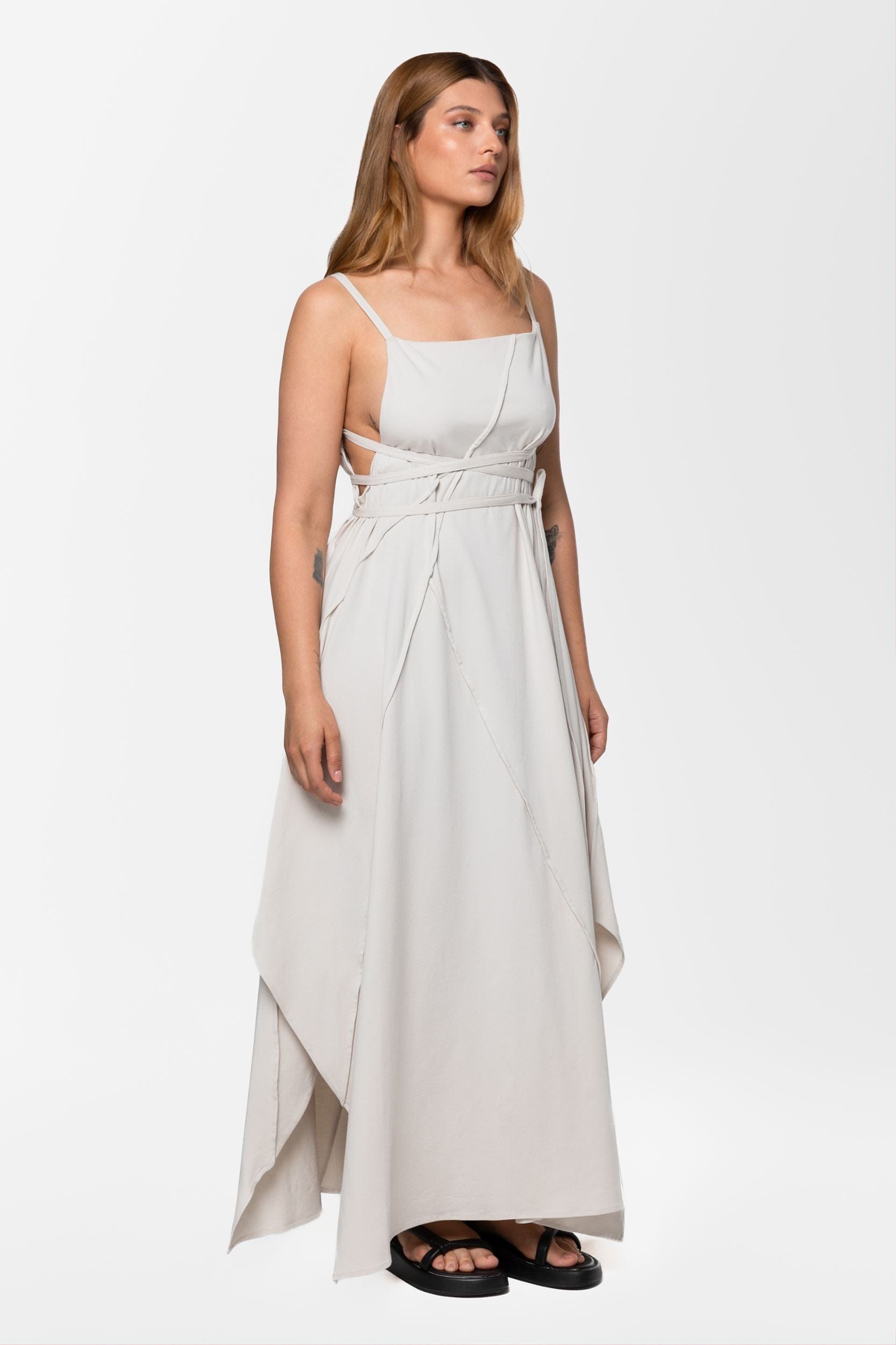 Kaze strappy cotton jersey dress is lightweight, textured, and comes in a dune beige color. This updated piece is made from a single jersey and has a smoother fluid silhouette than the linen version. Playful adjustable straps can be fixed on the back or wrapped around the waist to serve as a delicate belt. A square neckline, asymmetric seams, and side slits manifest the geometric aesthetic of this piece. The dress's elastic material provides complete front coverage, making it more suitable to be worn without a top.