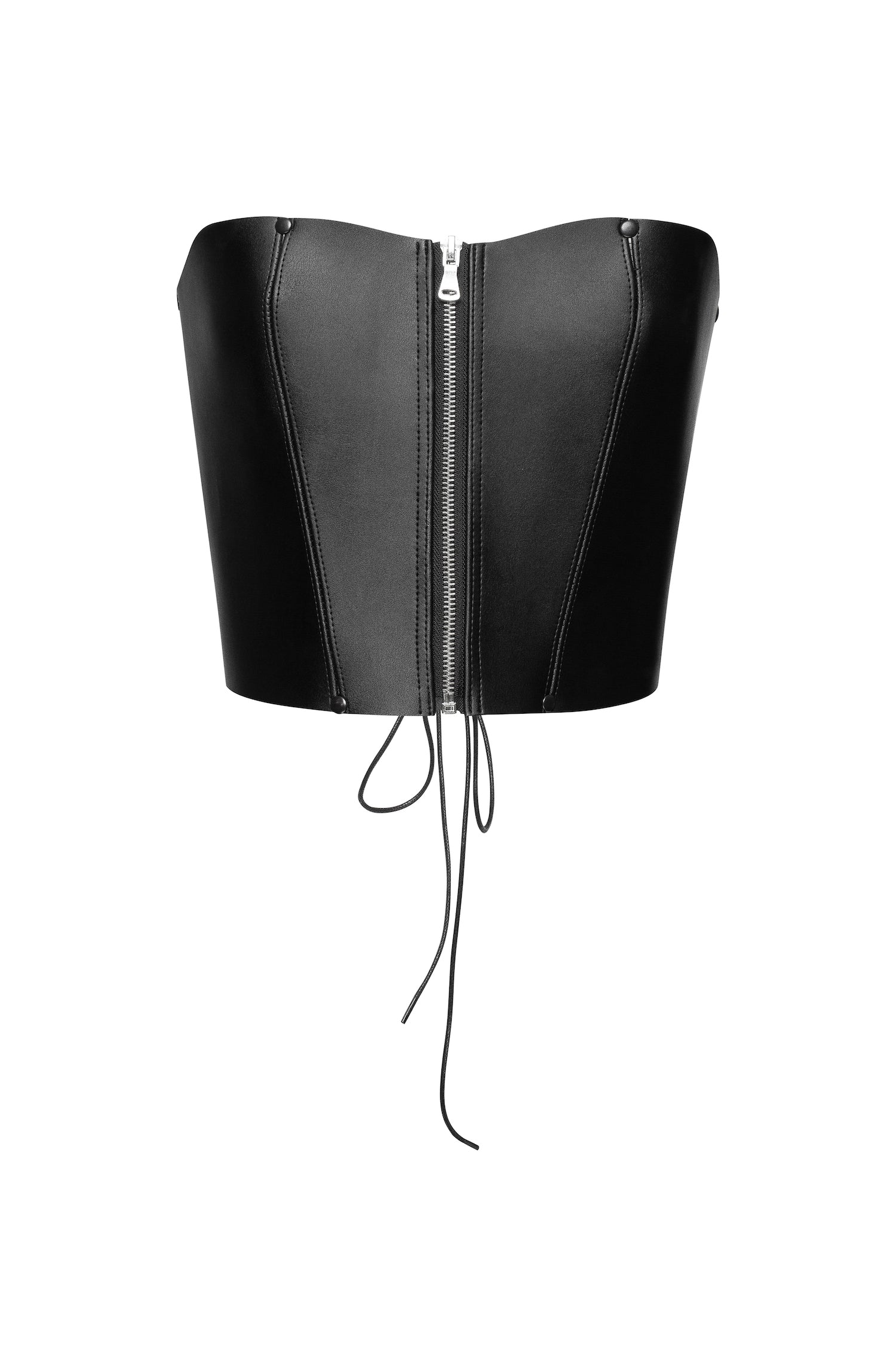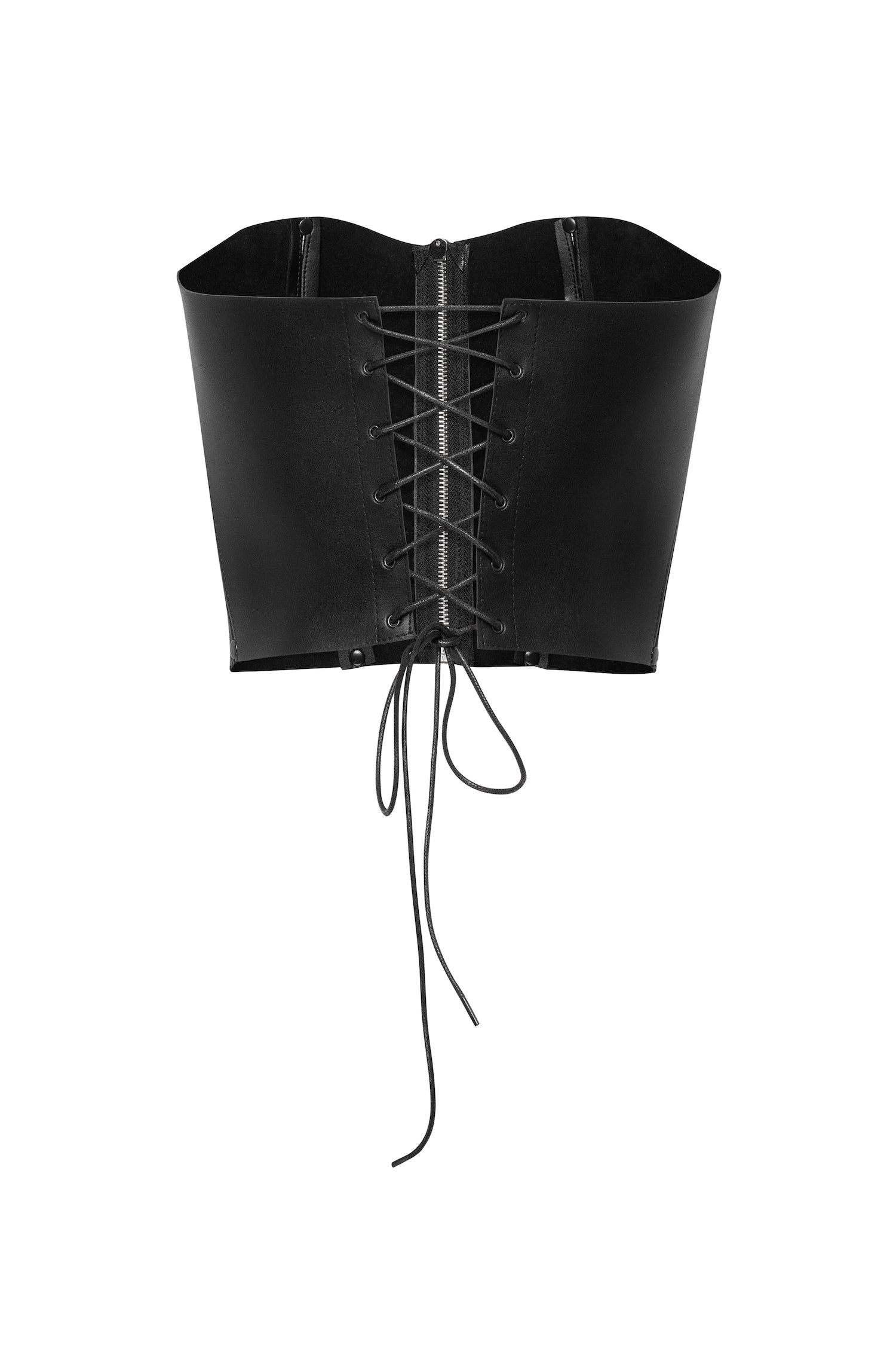 This luxurious eco-leather lacing corset offers the ultimate in modern minimalism. Its soft material hugs your body with a comfortable fit, a sweetheart neckline, and decorative seams on the front finishing with a central zipper closure.
