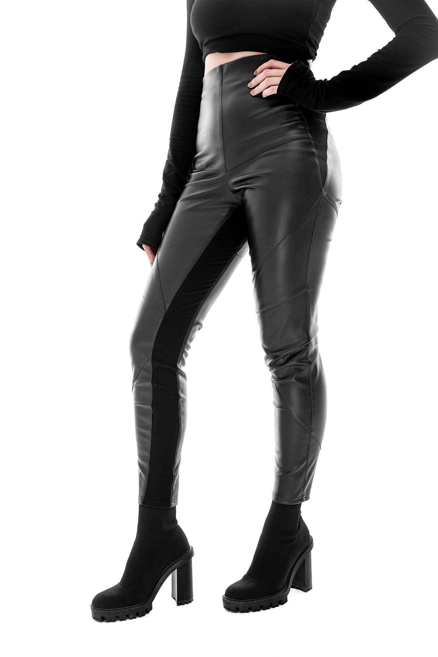 Created to become your compliment magnet, Sollers is the name given to these high waist leggings that wouldn’t look out of place on a date, in the office, or at a party - just name the occasion. Formed from white soft eco-leather, it includes an elasticated high-placed waistband that keeps the tummy flat and a trendy and practical metal zipper on the back. Sporting jersey inserts placed strategically high on the sides and inside the leg, this legging includes explicit geometrical seam details that run throughout the piece and bring attention to a covered leg to another level.