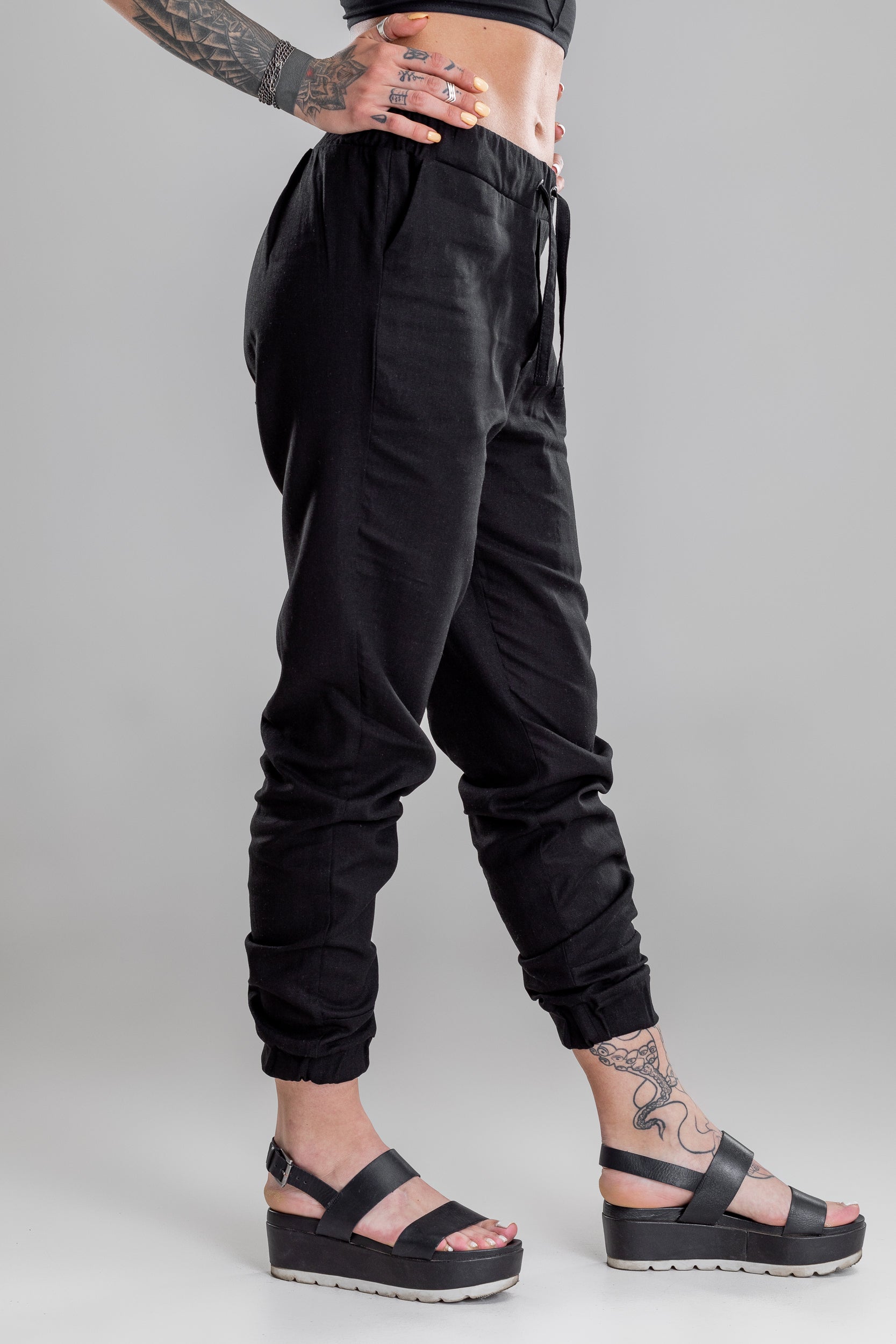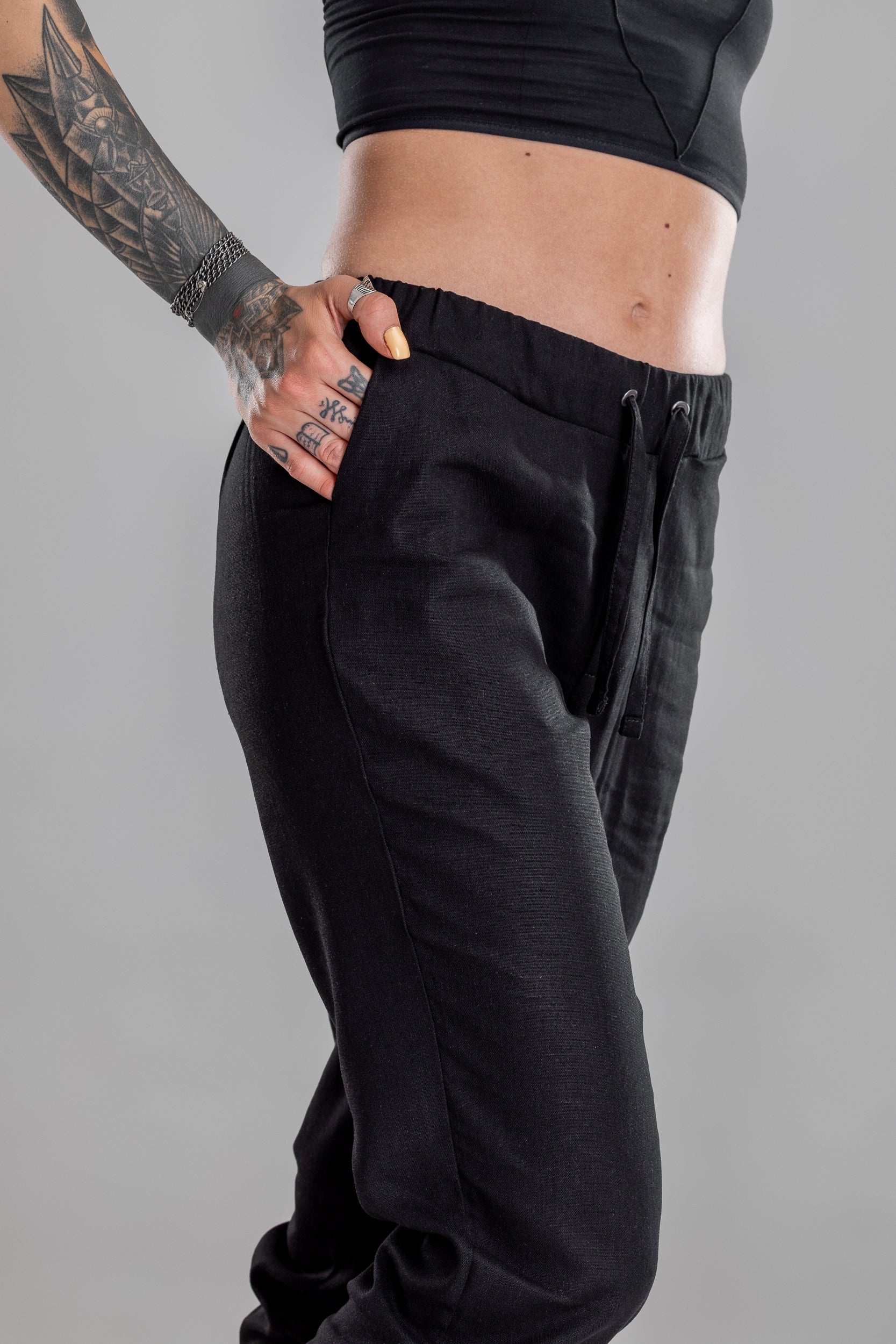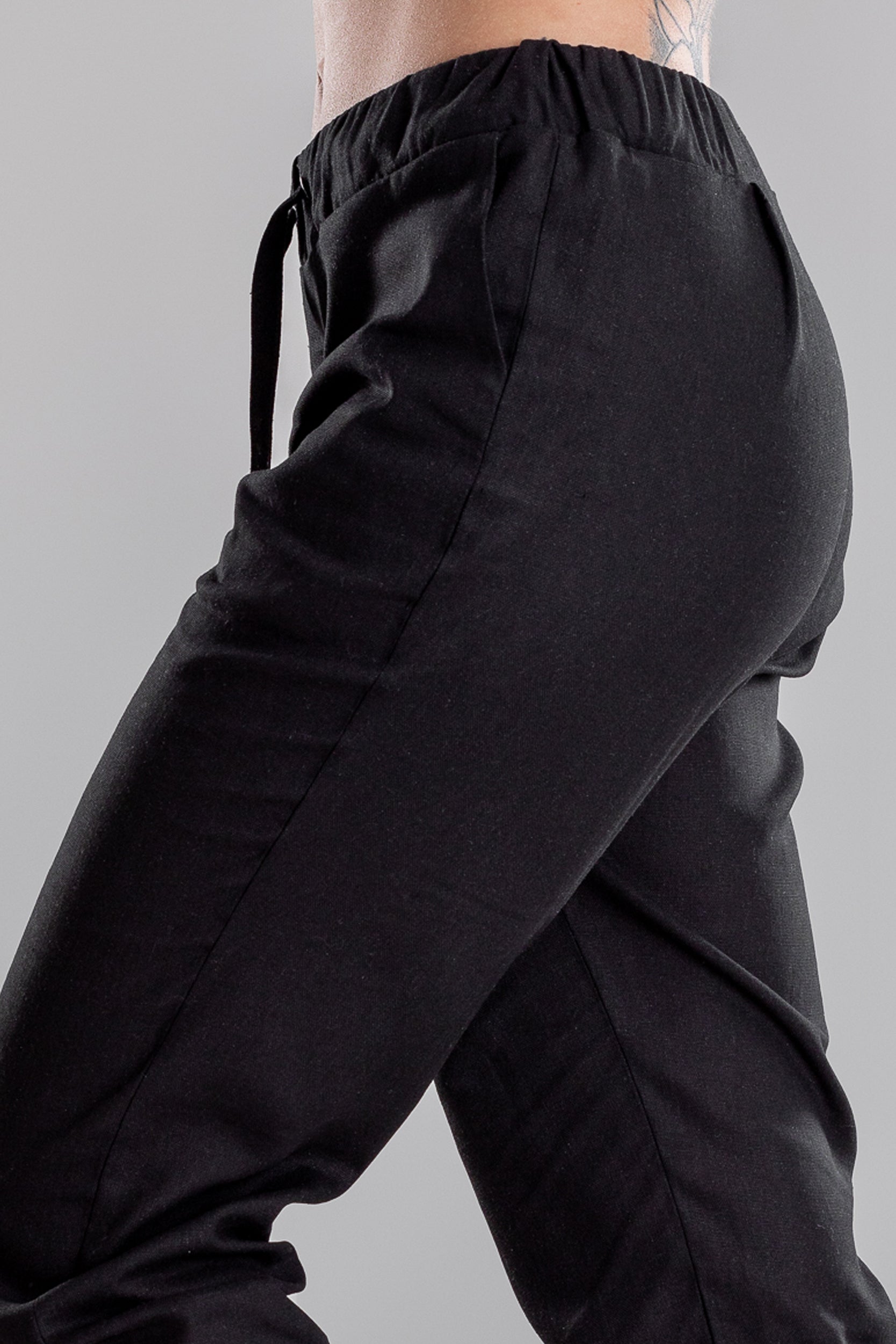 Stylish clothes shouldn’t necessarily be bright and attention-grabbing. Often, simple and minimalistic clothes can look better than over-the-top ones. This pair of dark gray women’s pants is a great example of that. They are simple, yet they manage to avoid being boring. The design is sleek and stylish, and the material used helps with that. These pants are made from linen fabric, which has a visible texture, is durable, and comfortable. Overall, this is a great pair of stylish, minimalistic pants!