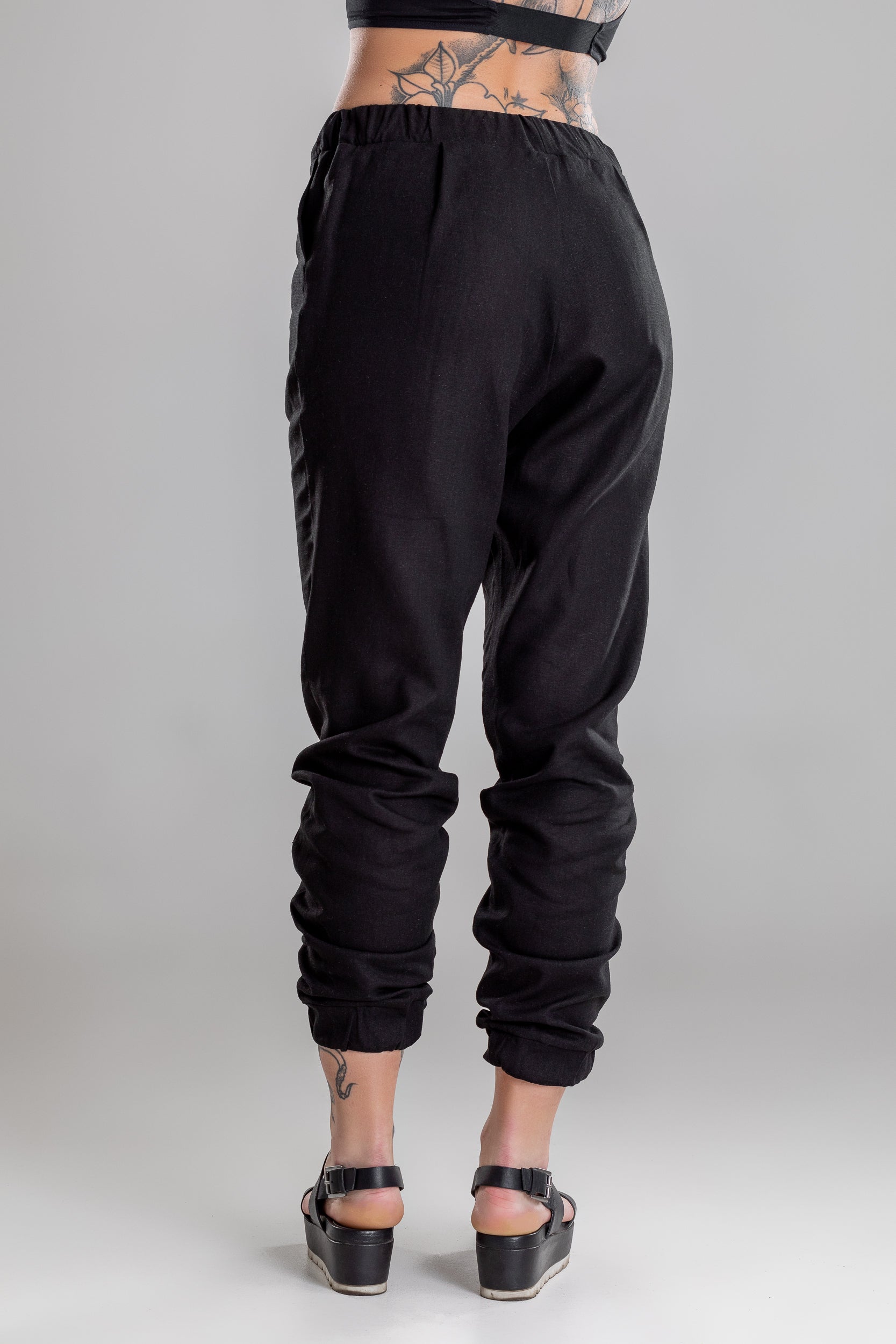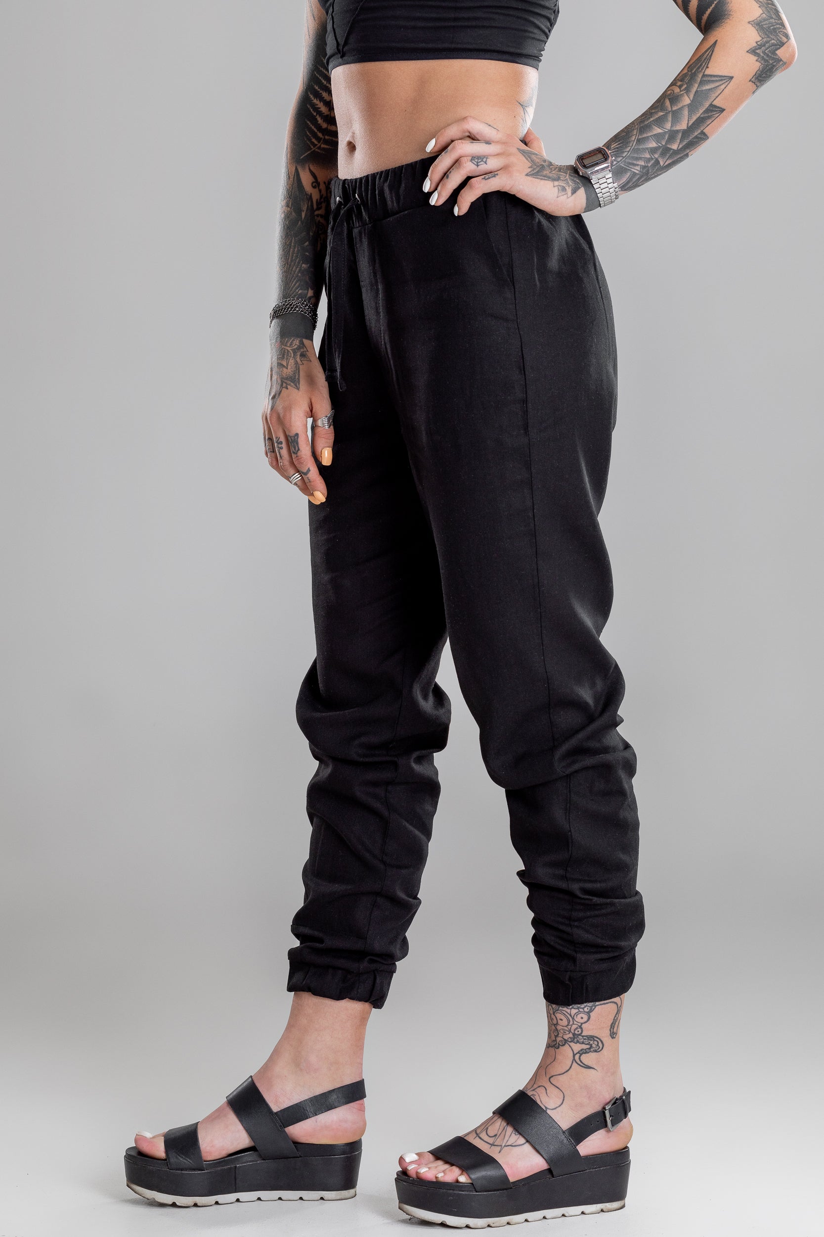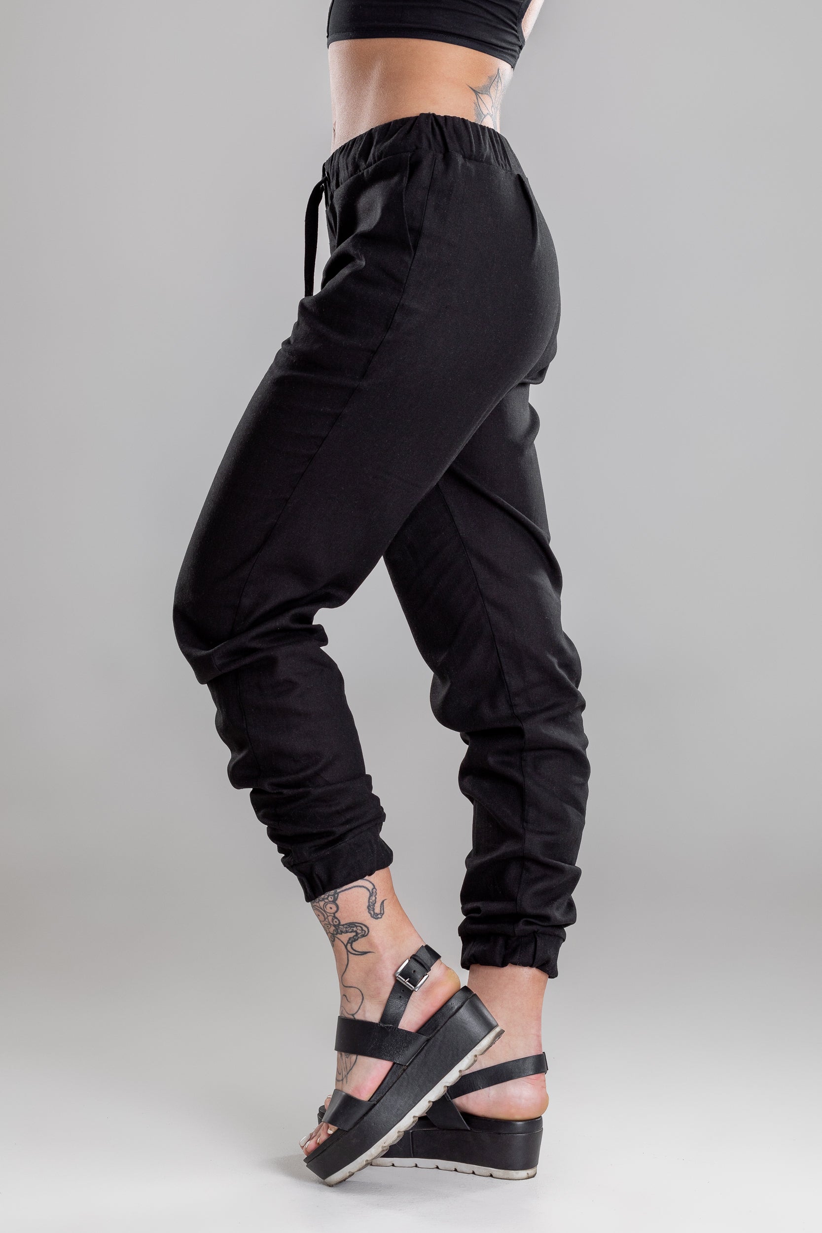 Stylish clothes shouldn’t necessarily be bright and attention-grabbing. Often, simple and minimalistic clothes can look better than over-the-top ones. This pair of dark gray women’s pants is a great example of that. They are simple, yet they manage to avoid being boring. The design is sleek and stylish, and the material used helps with that. These pants are made from linen fabric, which has a visible texture, is durable, and comfortable. Overall, this is a great pair of stylish, minimalistic pants!