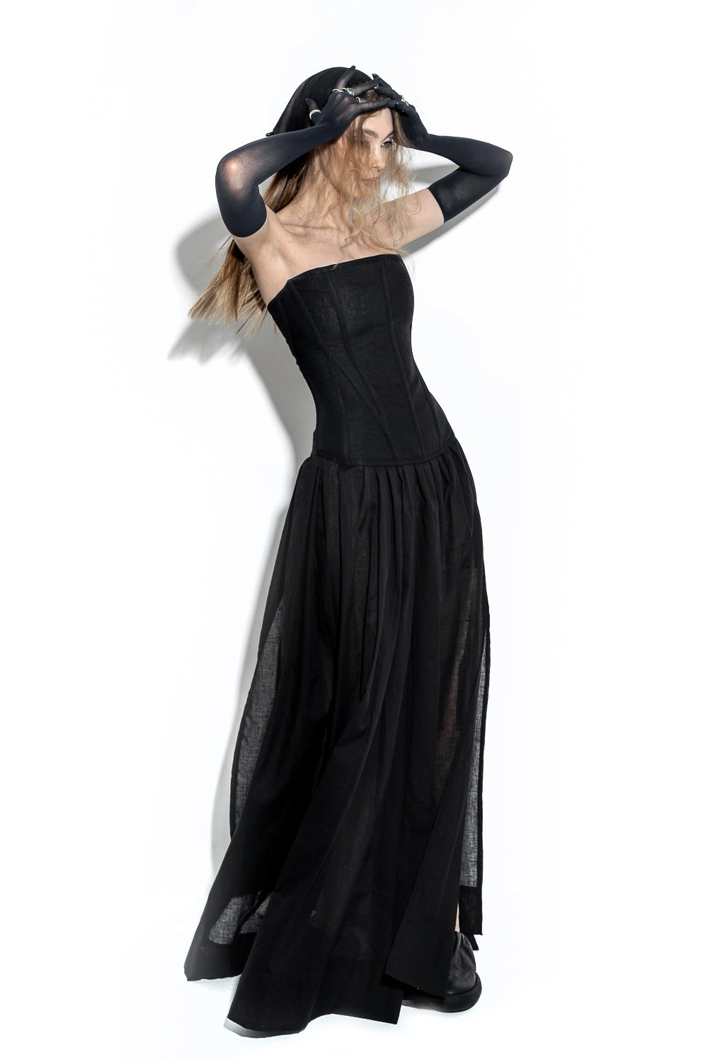 This floor-length skirt is crafted from pure linen and features an elasticated waistband with a pair of side slits for comfort and a flirtatious leg-revealing look. Pair it with this corset.