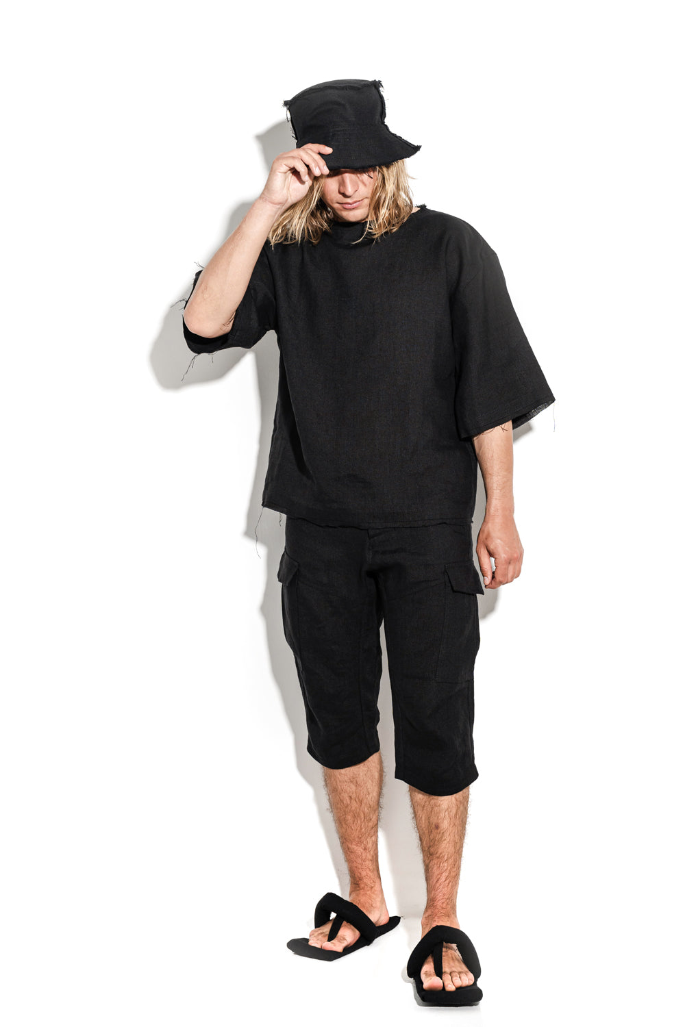 Crafted from fine heavyweight linen, this T-shirt has raglan shoulders and wide sleeves, finished with raw edges and textured decorative stitches.