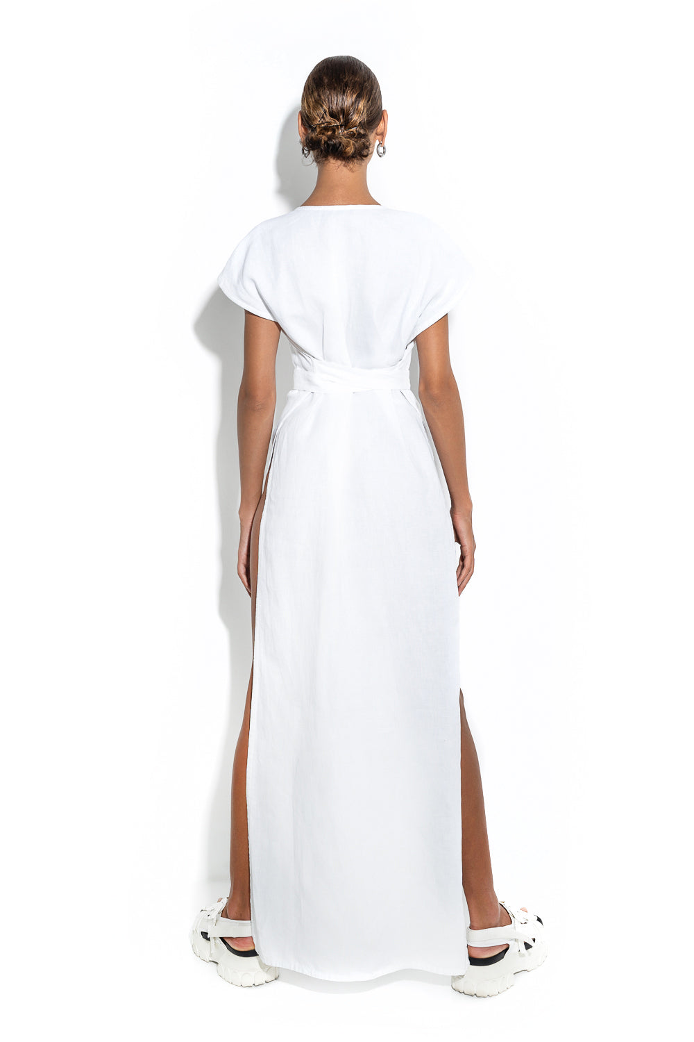 Maxi linen tunic dress with daring high slits and a same-fabric belt. No side seams. Dress it up or down with the addition of accessories.