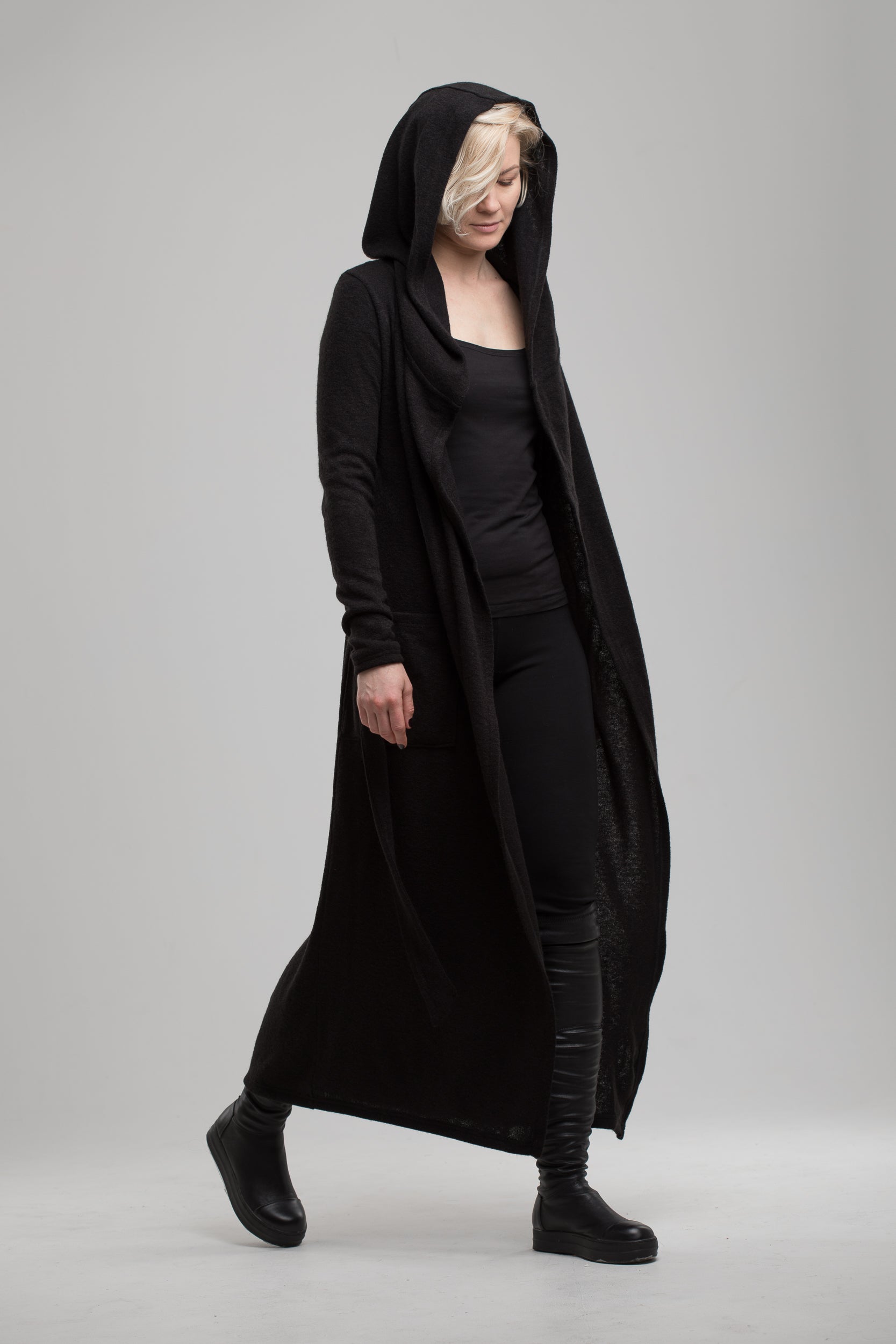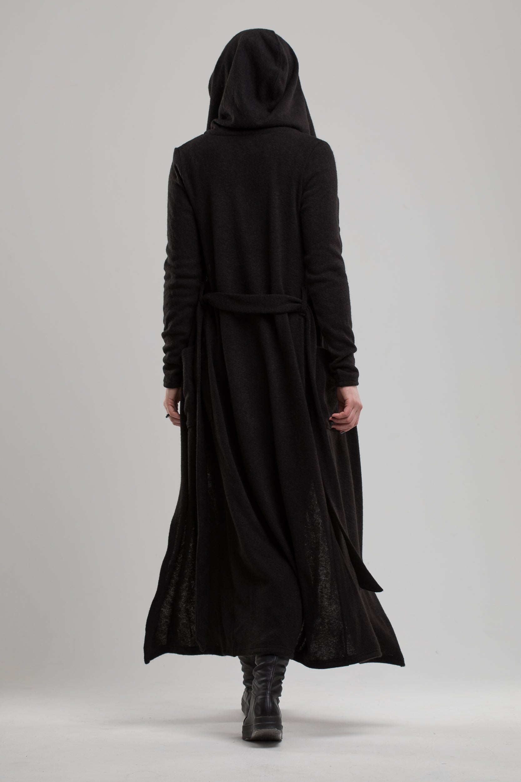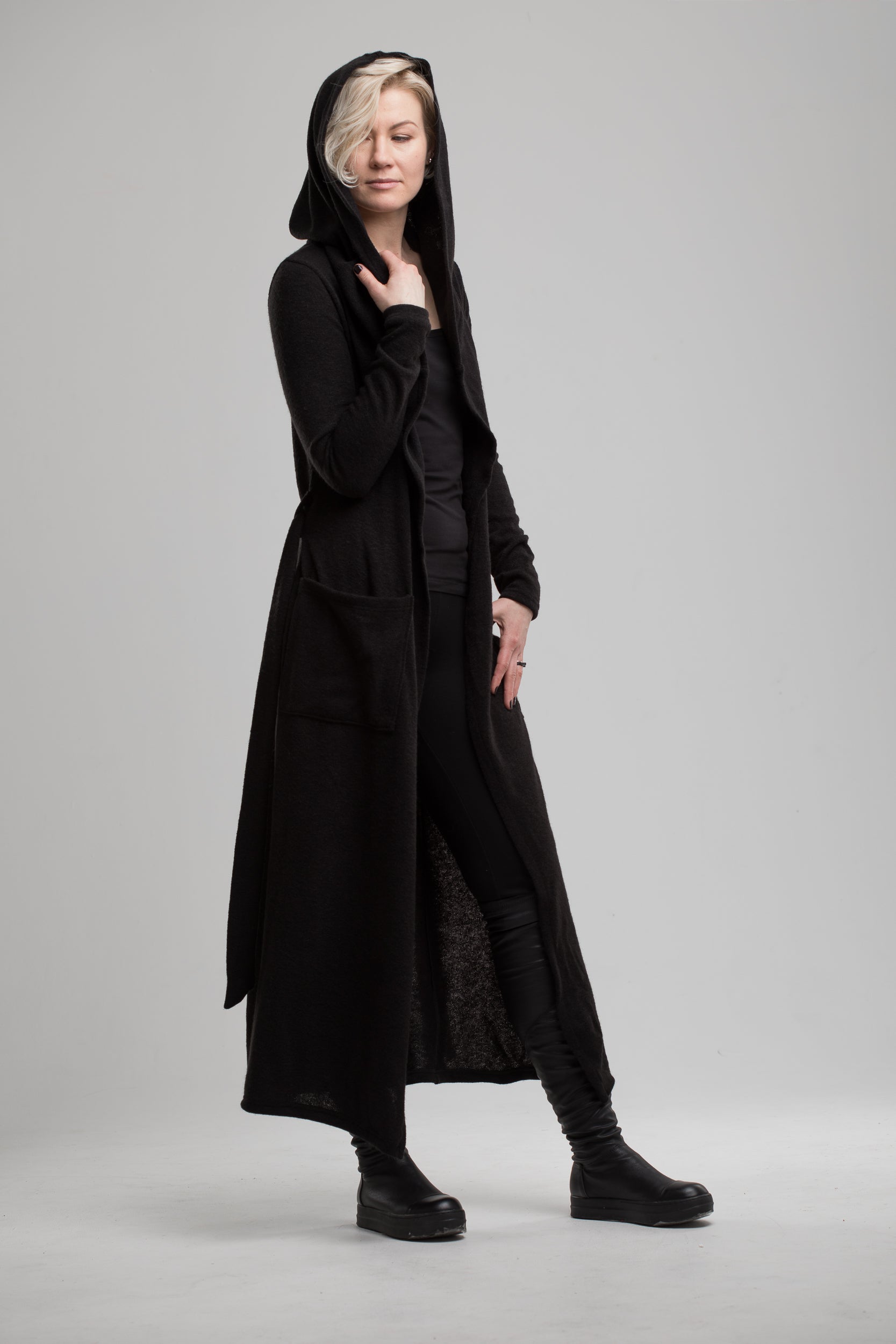 So baffling and magical, this long dipped in black cardigan whispers to anyone who looks at it and takes it under its spell so no one can truly escape from it. The mixture of mind-altering thought and abundance in quality texture manifests in this intense cardigan that extends to the floor and appeals to diverse creative outlooks. Let it communicate your views. The cardigan is long-sleeved and hooded so you can wear it as a statement outerwear piece on a chillier night or outdoor rave and enjoy yourself without restraints. It displays a buttonless, open front in a tie-waist style that will spare you fastening and includes front pockets for further comfort.