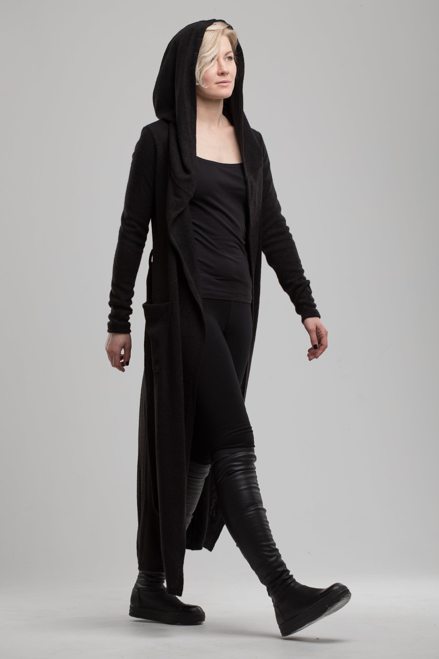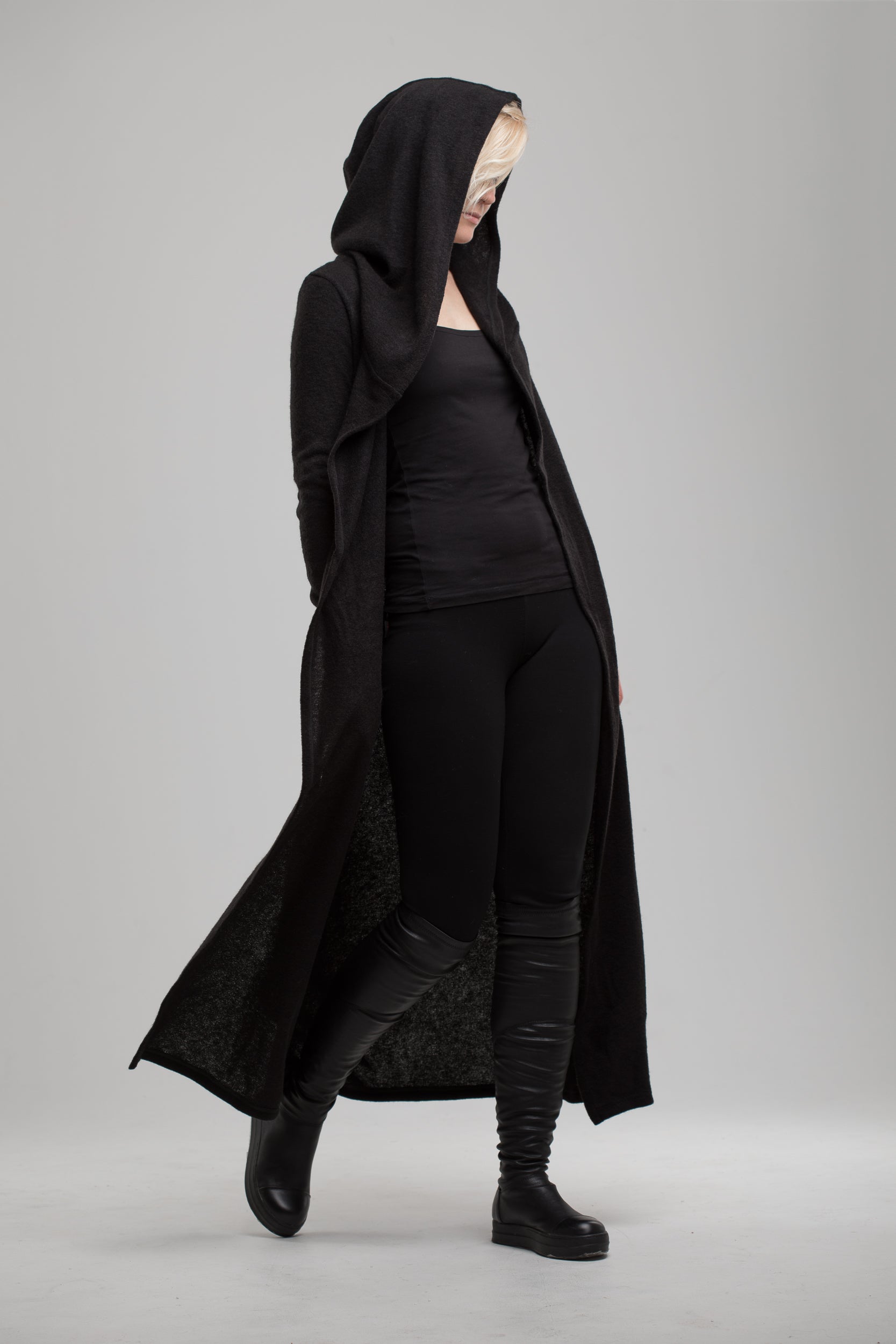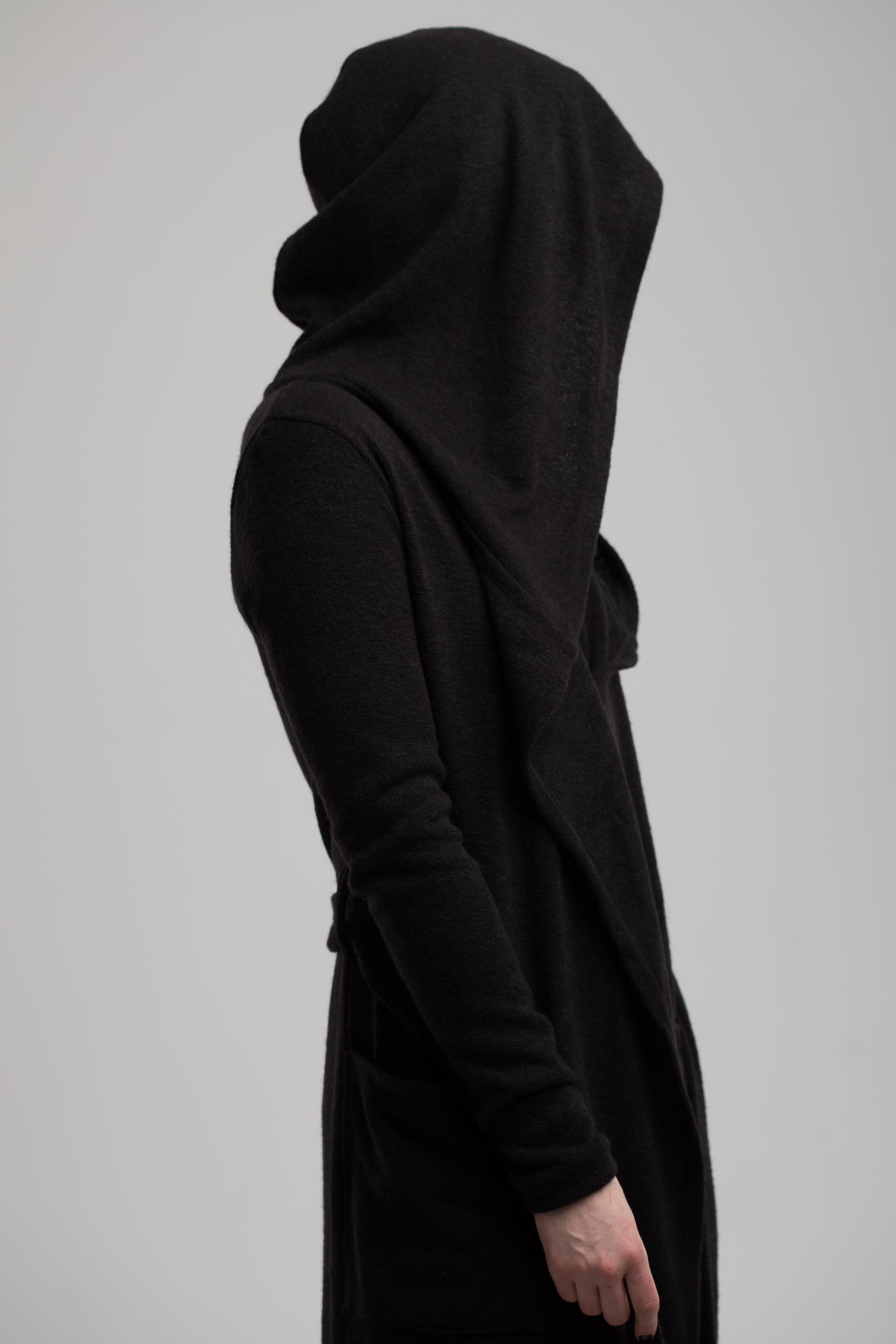 So baffling and magical, this long dipped in black cardigan whispers to anyone who looks at it and takes it under its spell so no one can truly escape from it. The mixture of mind-altering thought and abundance in quality texture manifests in this intense cardigan that extends to the floor and appeals to diverse creative outlooks. Let it communicate your views. The cardigan is long-sleeved and hooded so you can wear it as a statement outerwear piece on a chillier night or outdoor rave and enjoy yourself without restraints. It displays a buttonless, open front in a tie-waist style that will spare you fastening and includes front pockets for further comfort.