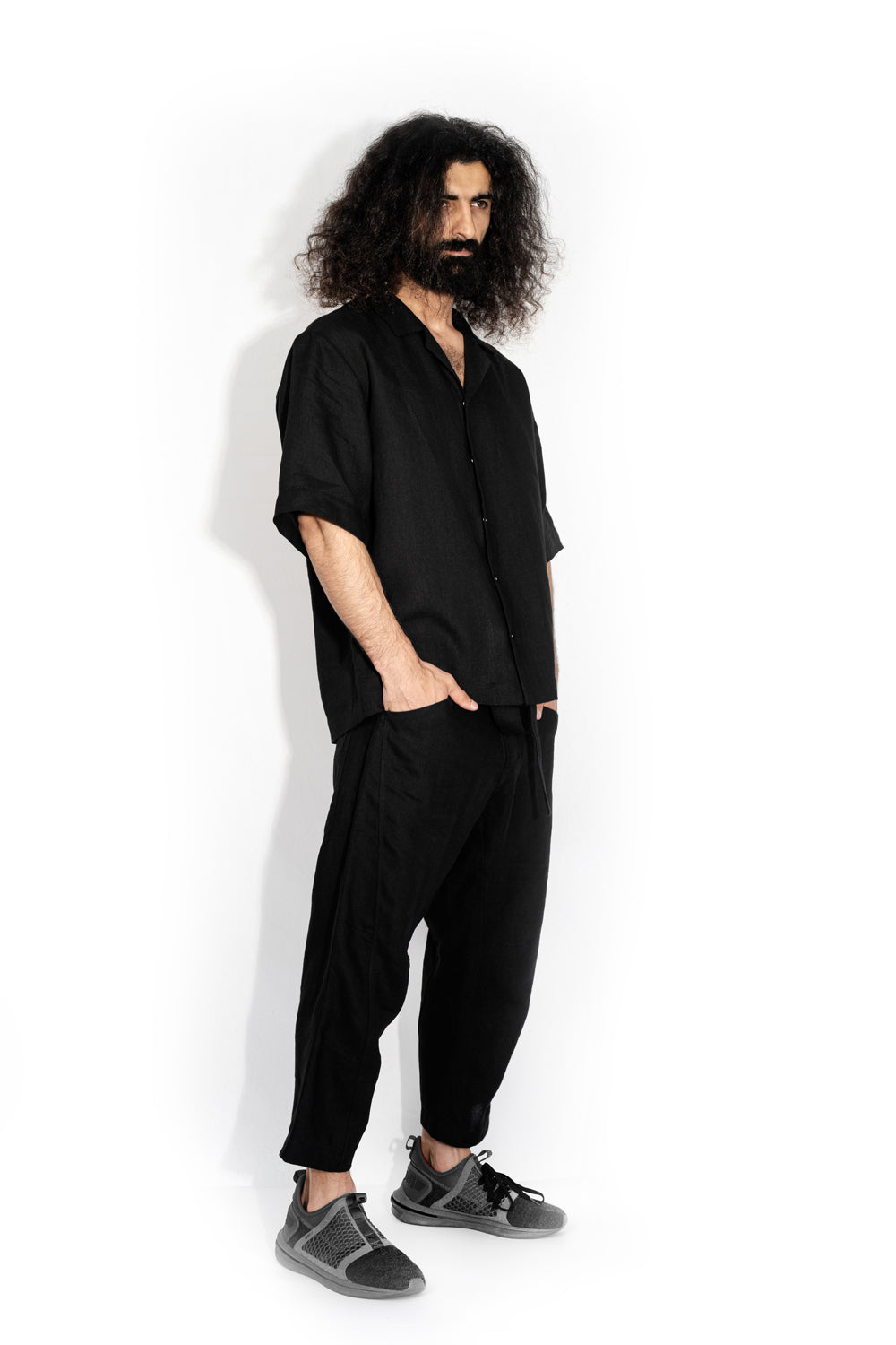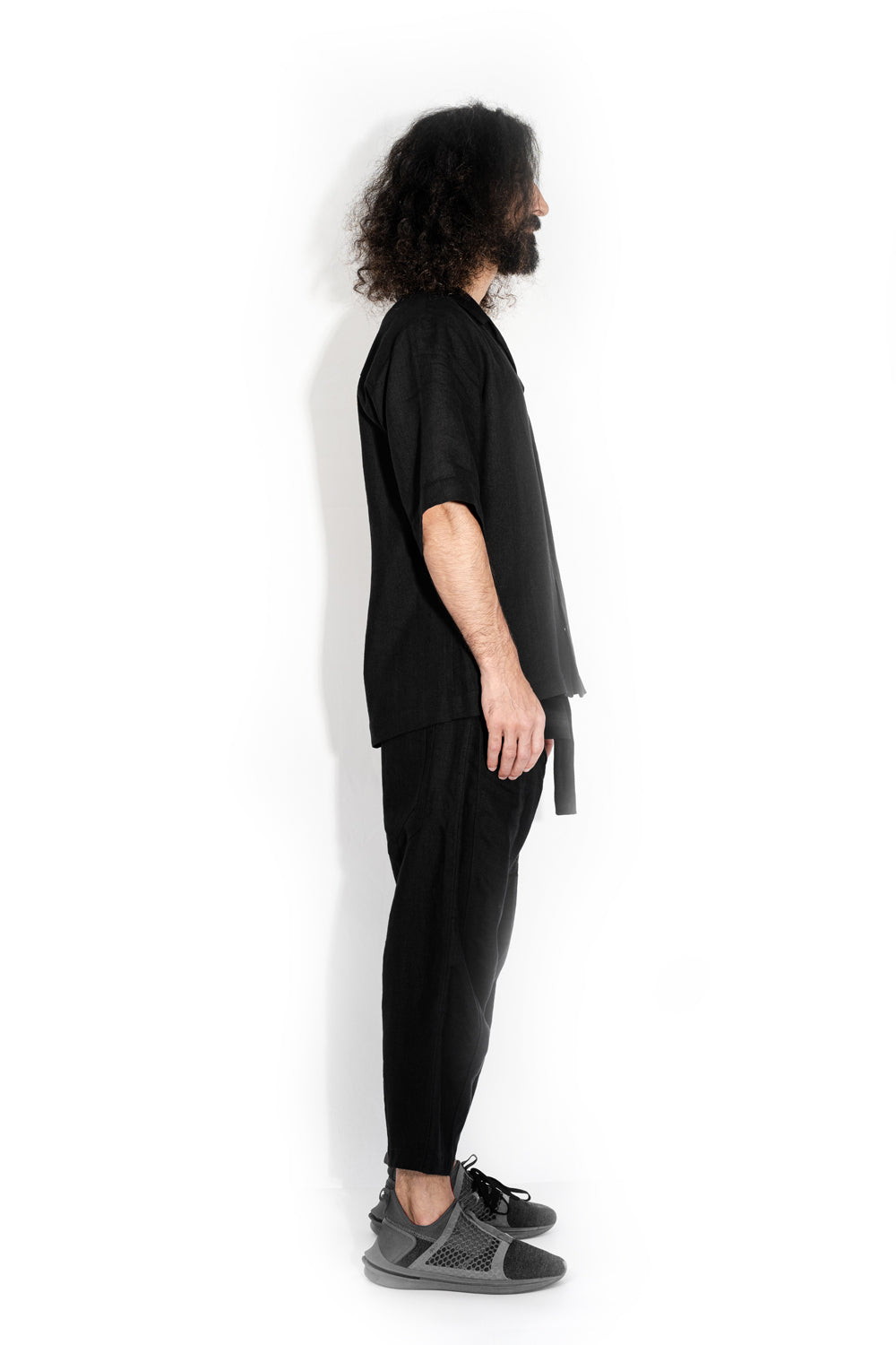 Below-knee linen shorts with a dropped crotch and matching fabric belt. They feature edgy patch pockets on the back and a textured construction.