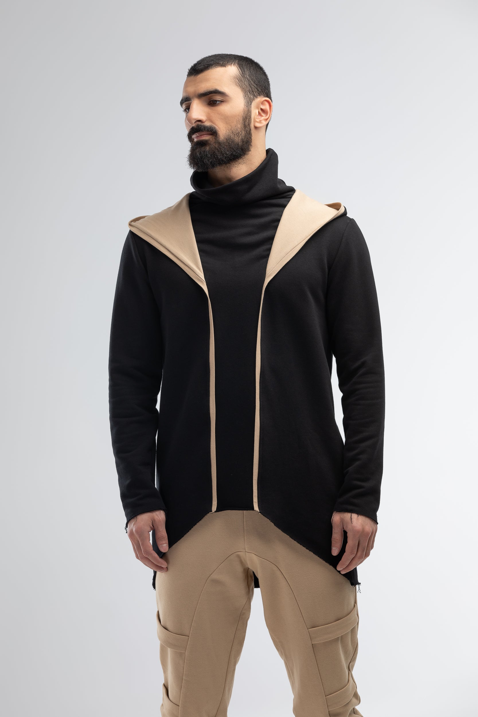 Casual clothes often lack that bit of identity that every great outfit needs - something to set the wearer apart from the others. Our shop has multiple garments to remedy that problem. Just take a look at this hoodie - in most aspects, it's the same as a regular one that you can find in any store, but its few distinct details, like the asymmetrical shape, interesting minimalistic patterns, and a cloth neck guard, all make it look unusual and attract attention to it. The dark tone also plays a big role in this item's look - there's no flashing colors jumping out at you, only the subtle touches that really make this hoodie unique.