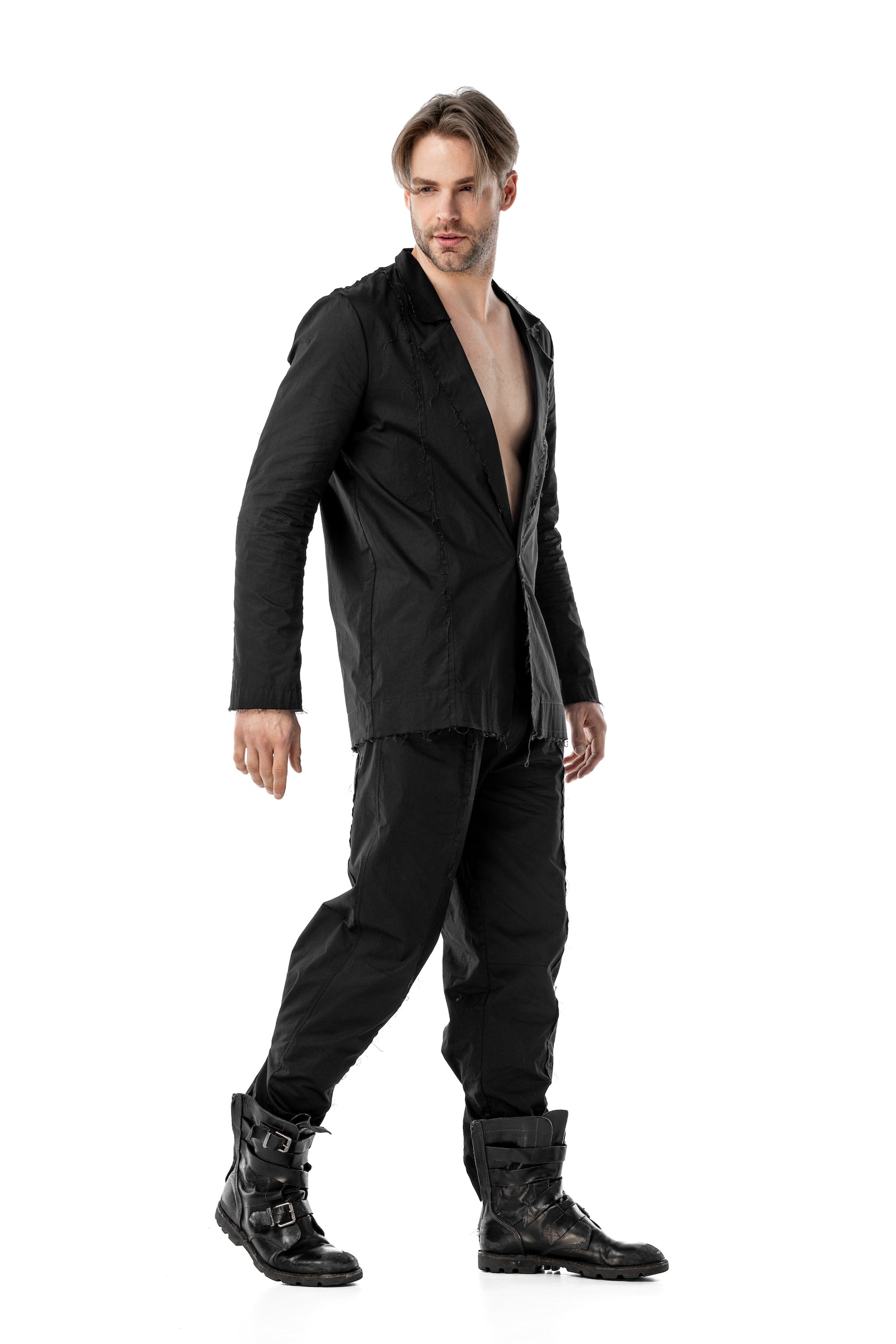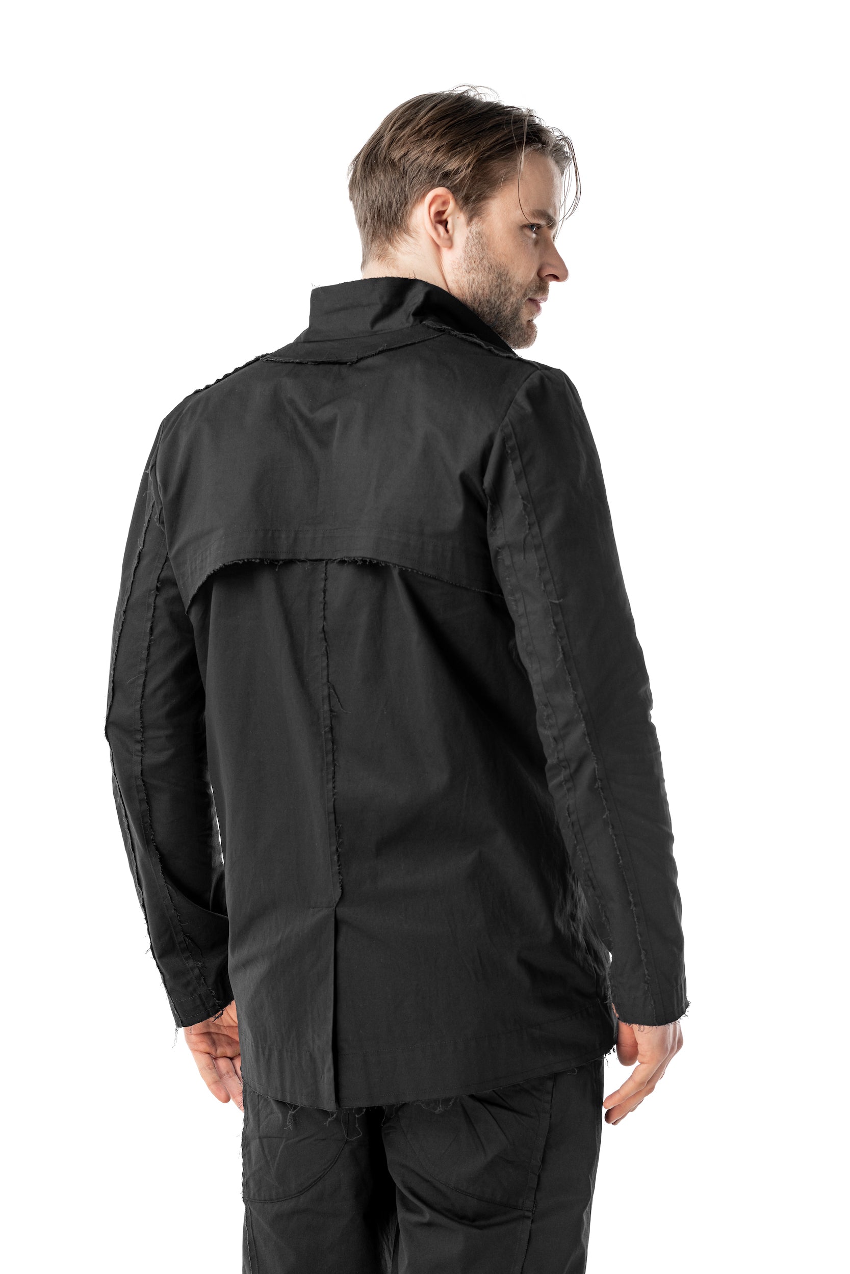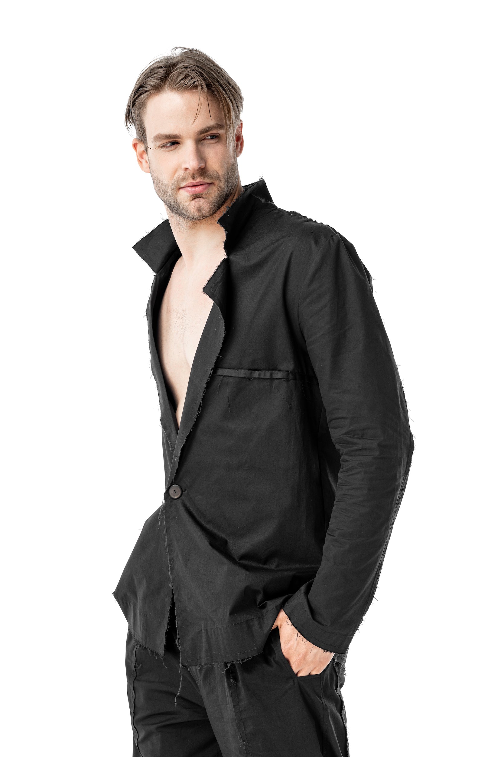 For a contemporary twist, the Unbreacable men’s jacket features open seams along the edges and a thin collar framing the upper body. The back is designed with a flap outlined by decorative open seams, adding to its unique character.