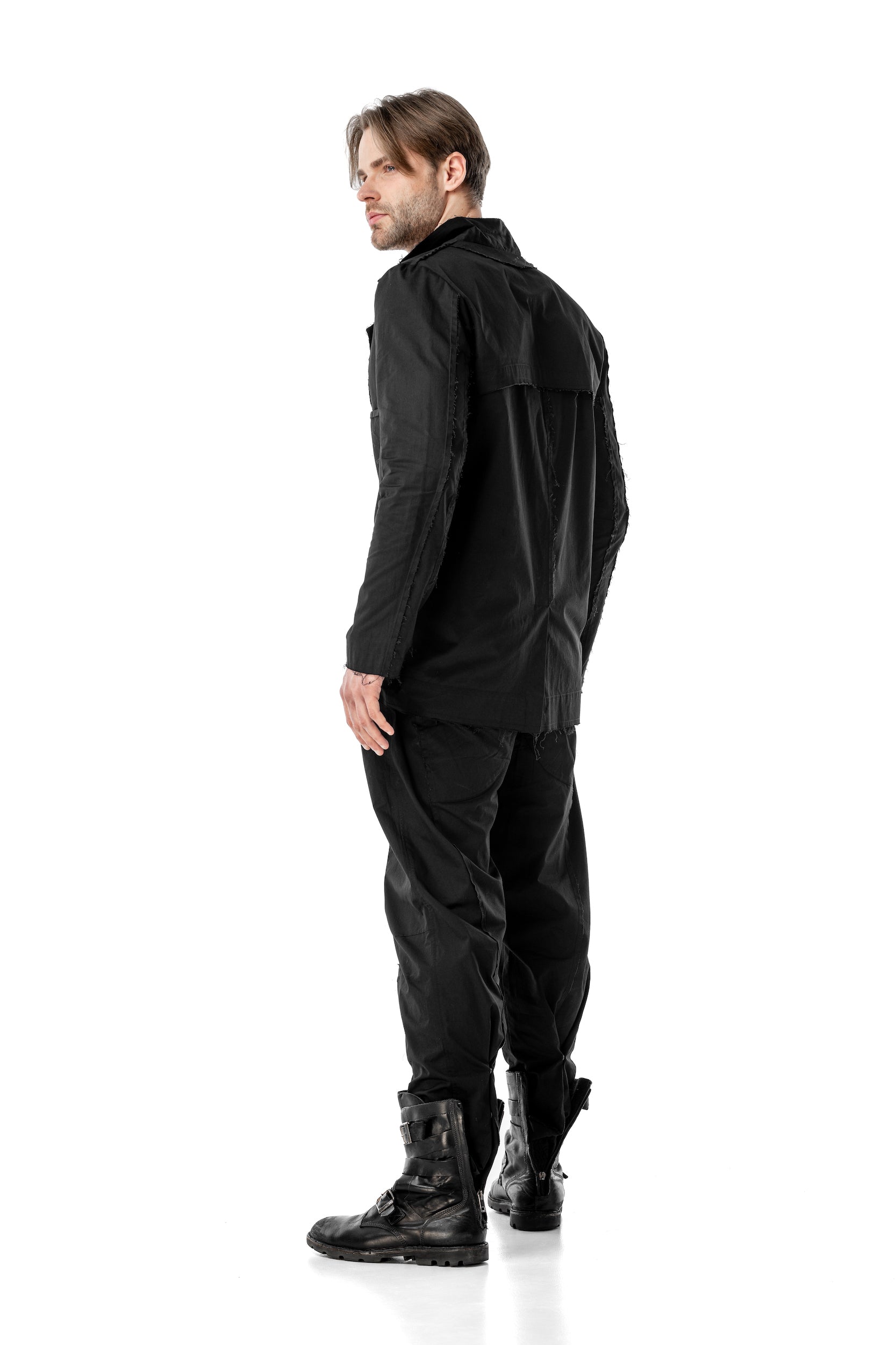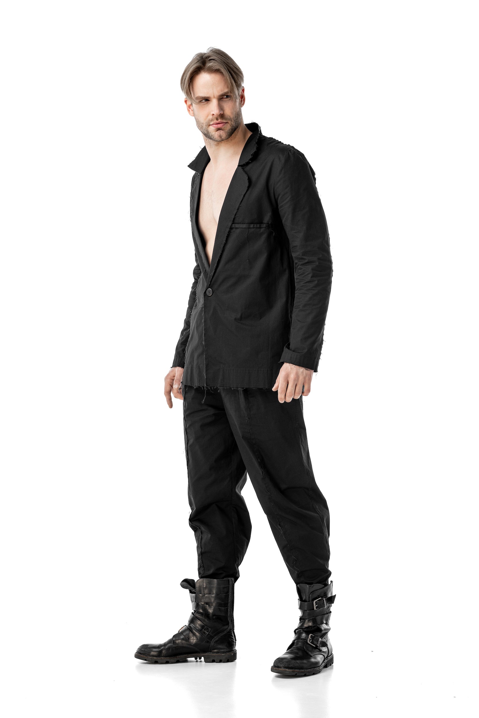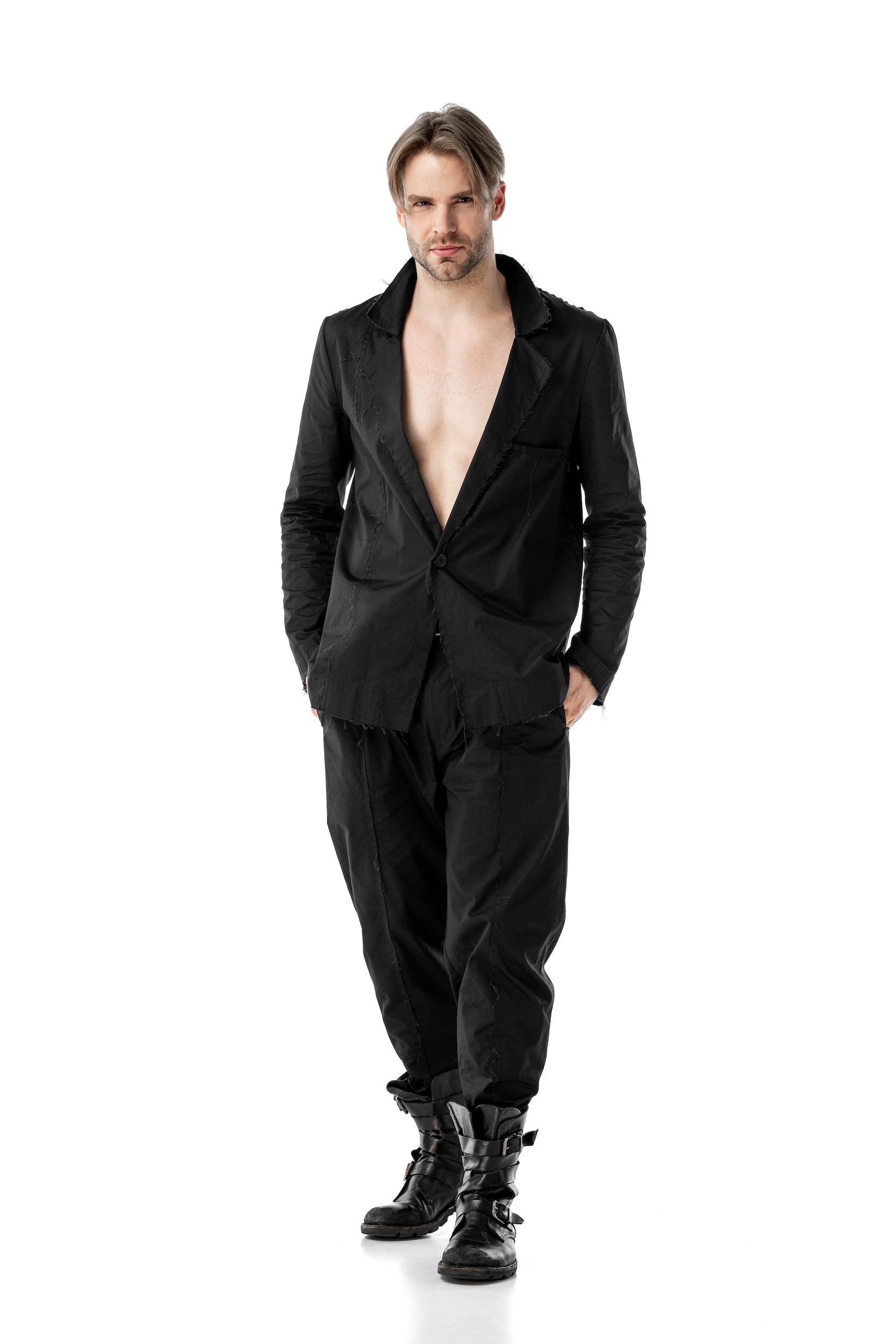 For a contemporary twist, the Unbreacable men’s jacket features open seams along the edges and a thin collar framing the upper body. The back is designed with a flap outlined by decorative open seams, adding to its unique character.
