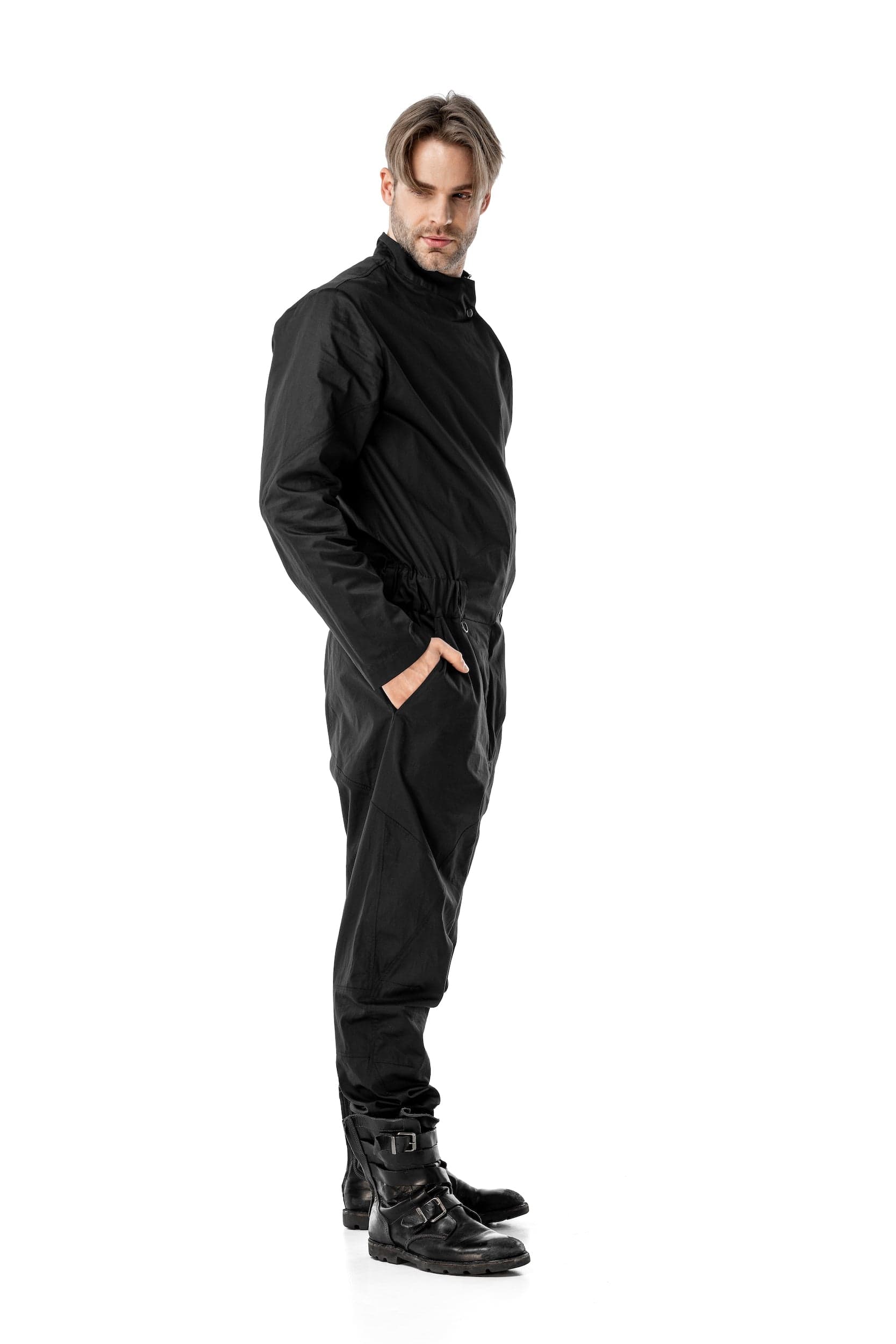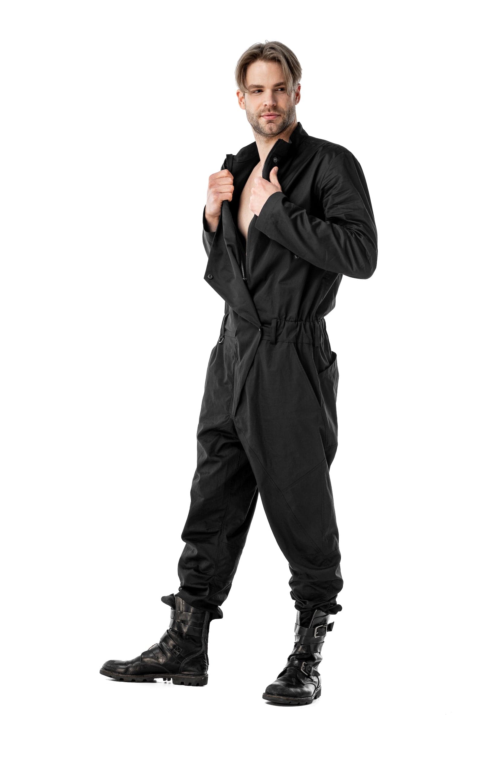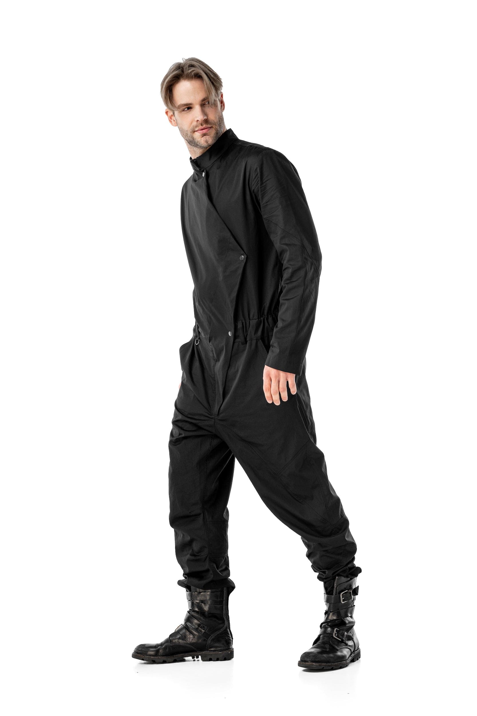 Zehat jumpsuit is here presented in a black edition and features a coverall loose design that is completed with masculine touches by utilizing geometric lines and muted hardware.