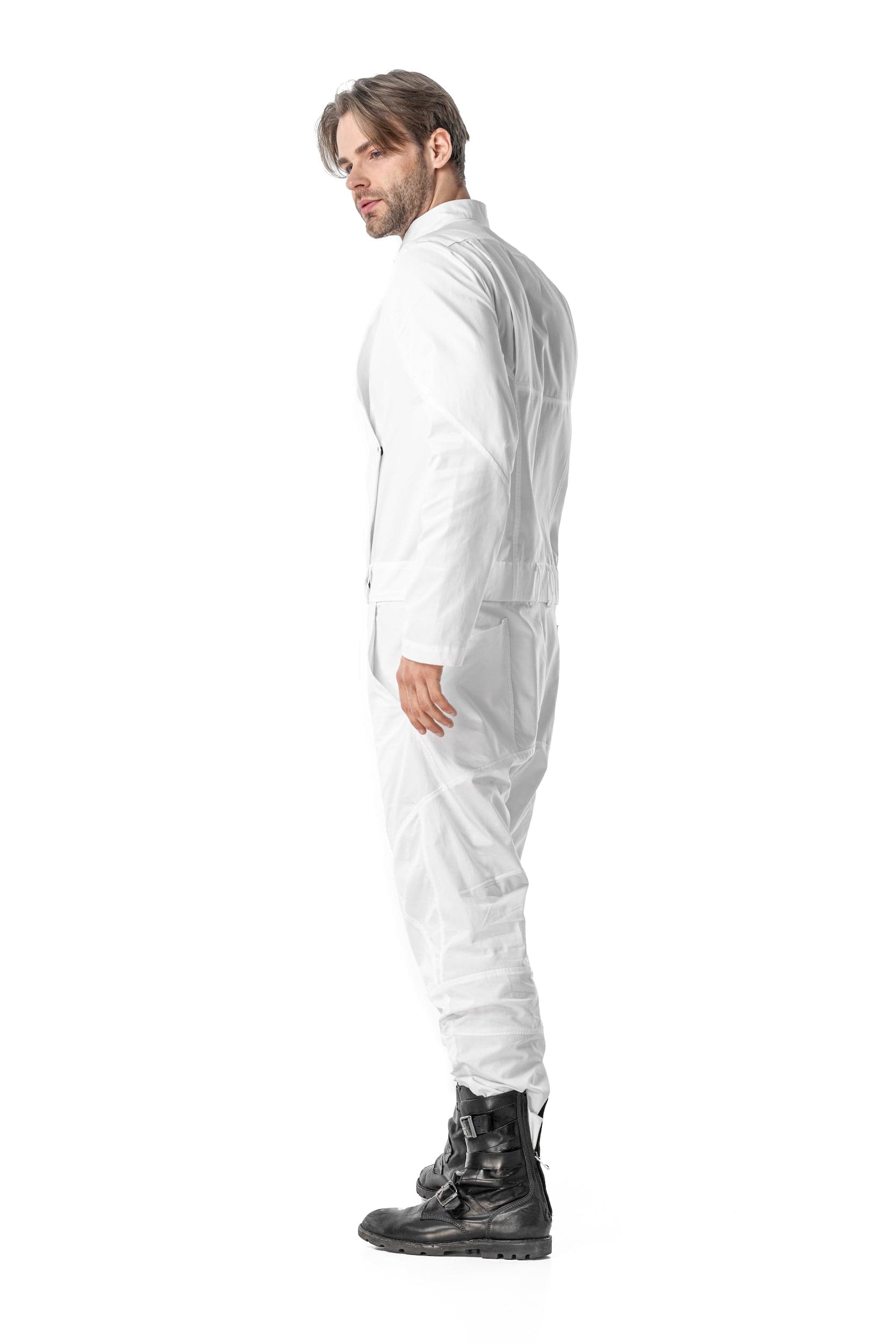Zehat comes in white and features a stand collar, a long, hidden zipper and reinforces the closure with additional press studs that outline the geometric flap.