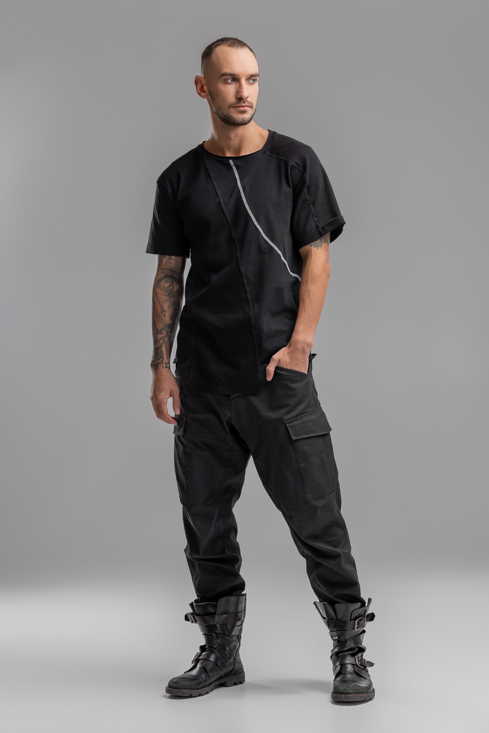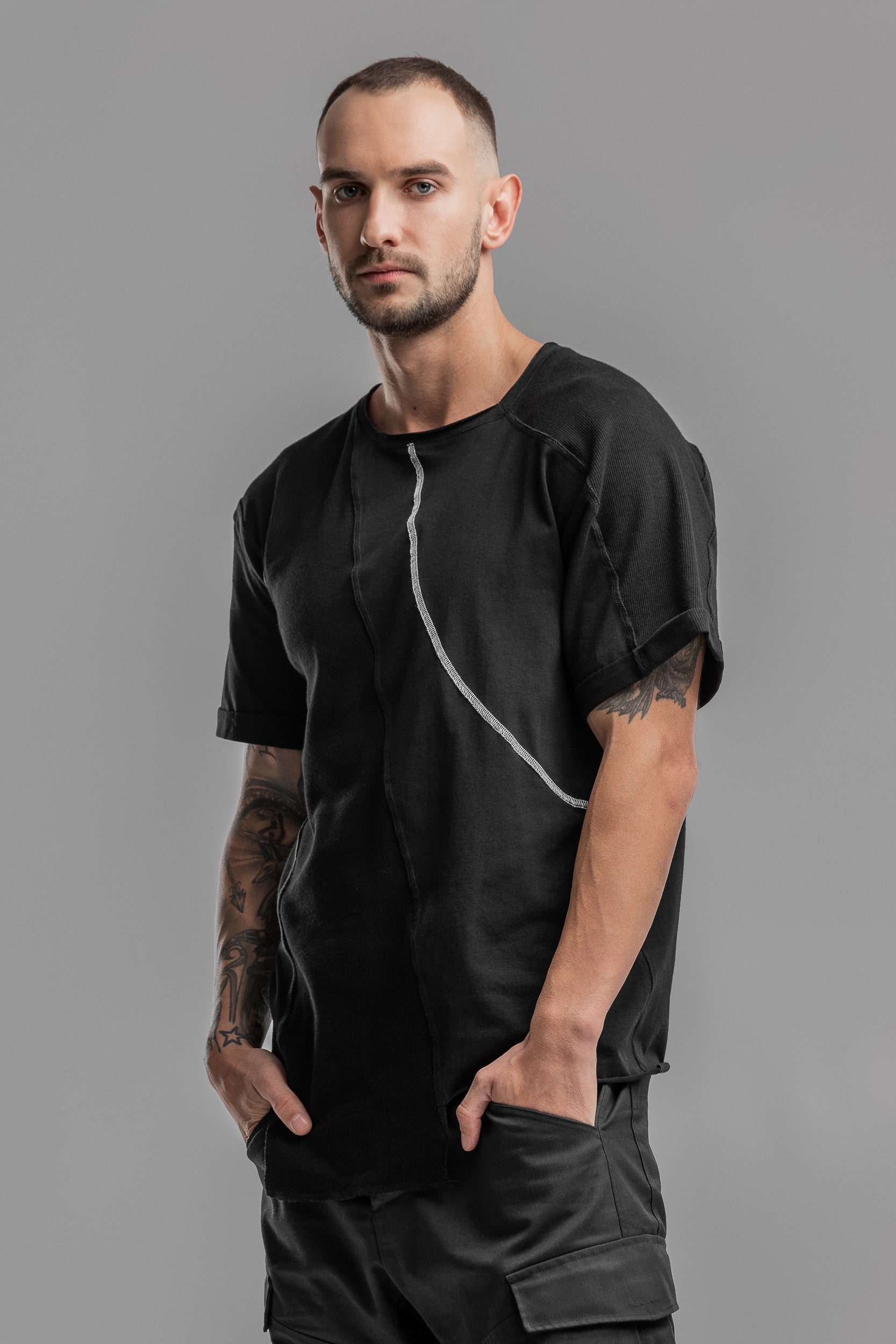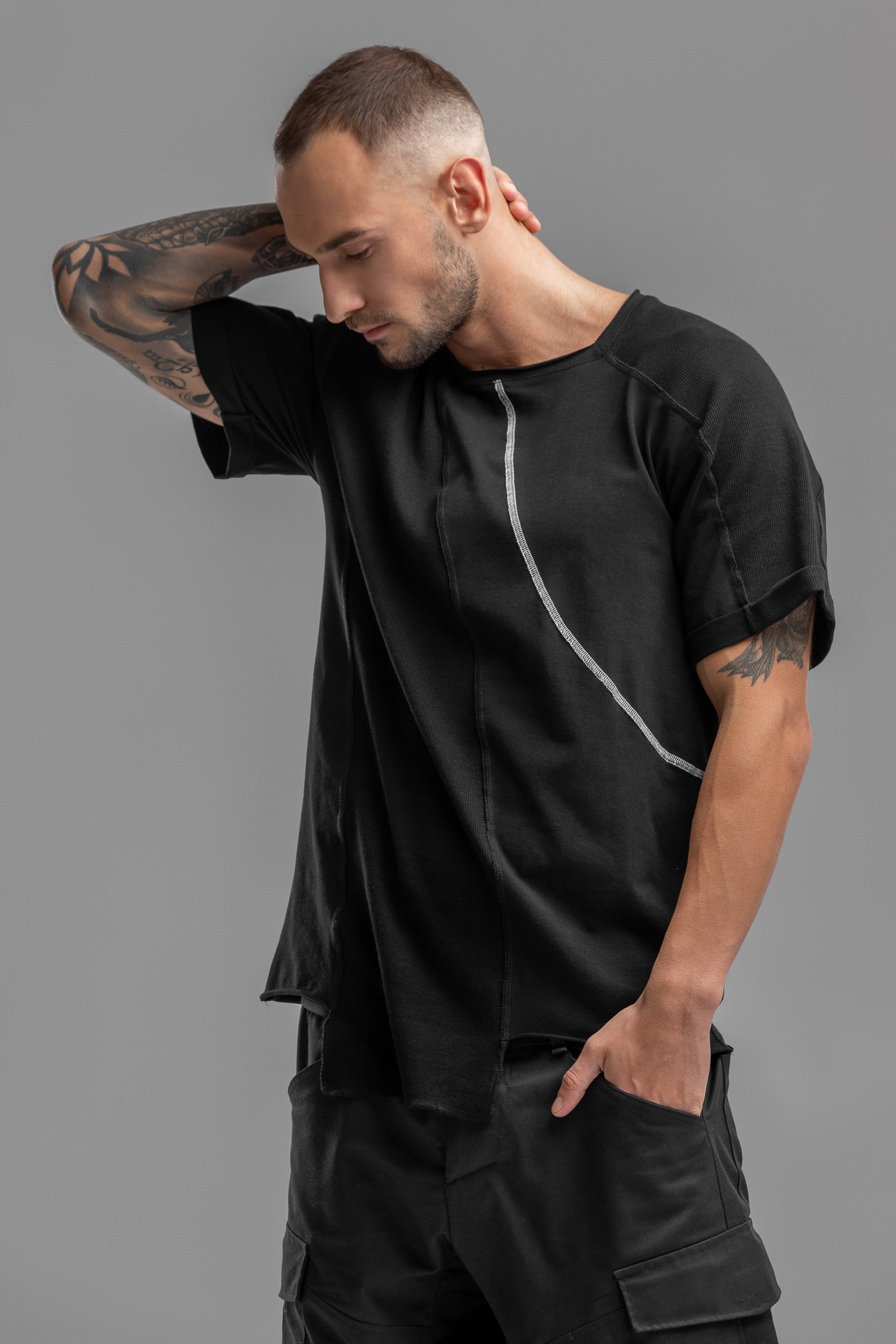 Tired of the same old t-shirt routine? Our black asymmetric tee is here to shake things up and solve all your styling dilemmas. A fresh and improved take on our popular white asymmetric t-shirt, this loose yet refined top is designed to provide a comfortable fit without sacrificing style. The unique cut ensures a slim drape that embraces your silhouette perfectly.