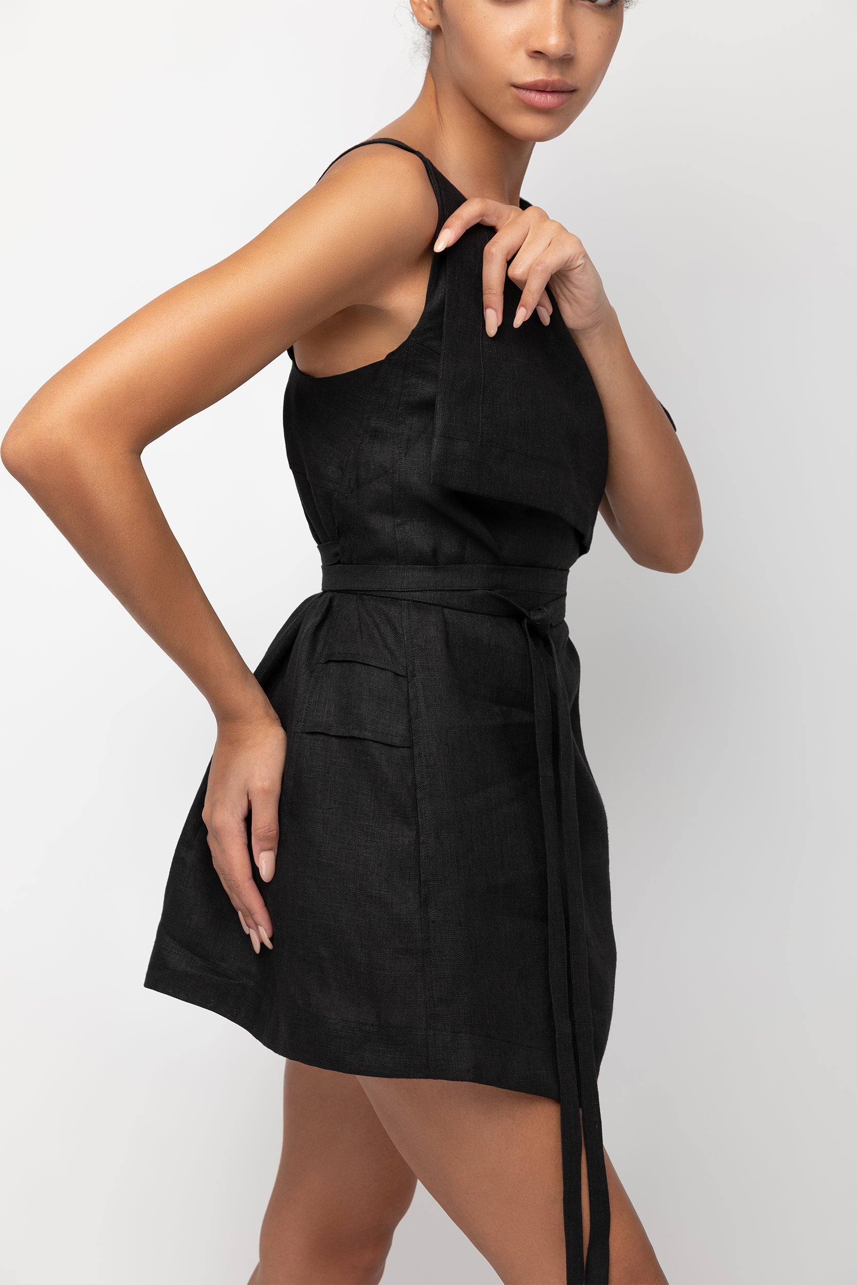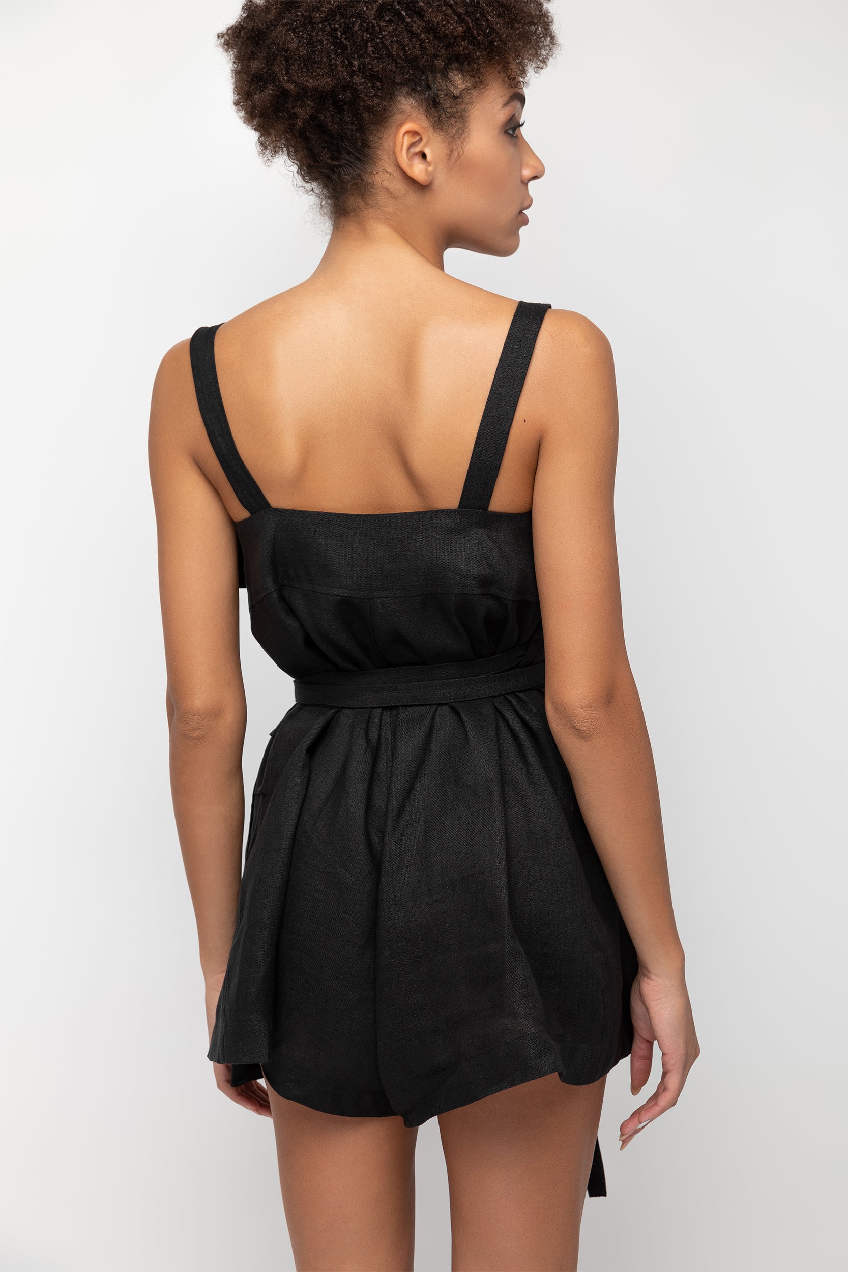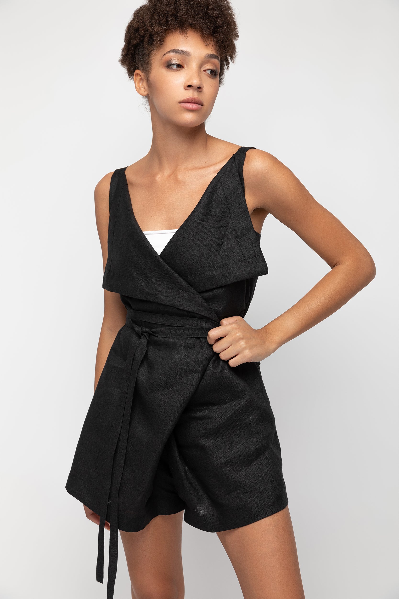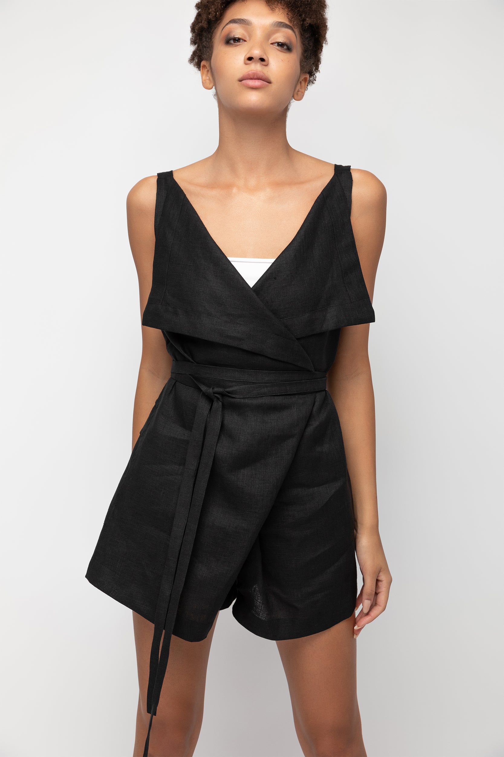 Made for passionate, young-spirited women, the Mujun in white radiates excitement for sun-soaked afternoons and leaves a lasting impression. This short jumpsuit conveys a carefree, lively mood, cut from linen to create a trapeze silhouette with a flared, playful bottom. Featuring two elongated ties that wrap around the waist to adjust the shape, Mujun is designed with wide geometric lapels that enhance its charming appeal. It includes hidden pockets and additional fabric detailing on the sides for an extra touch of flair, draping beautifully and flowing gracefully while walking, revealing a hint of sensuality. Minimizing effort while maximizing impact, Mujun can be worn as is or layered for added versatility.