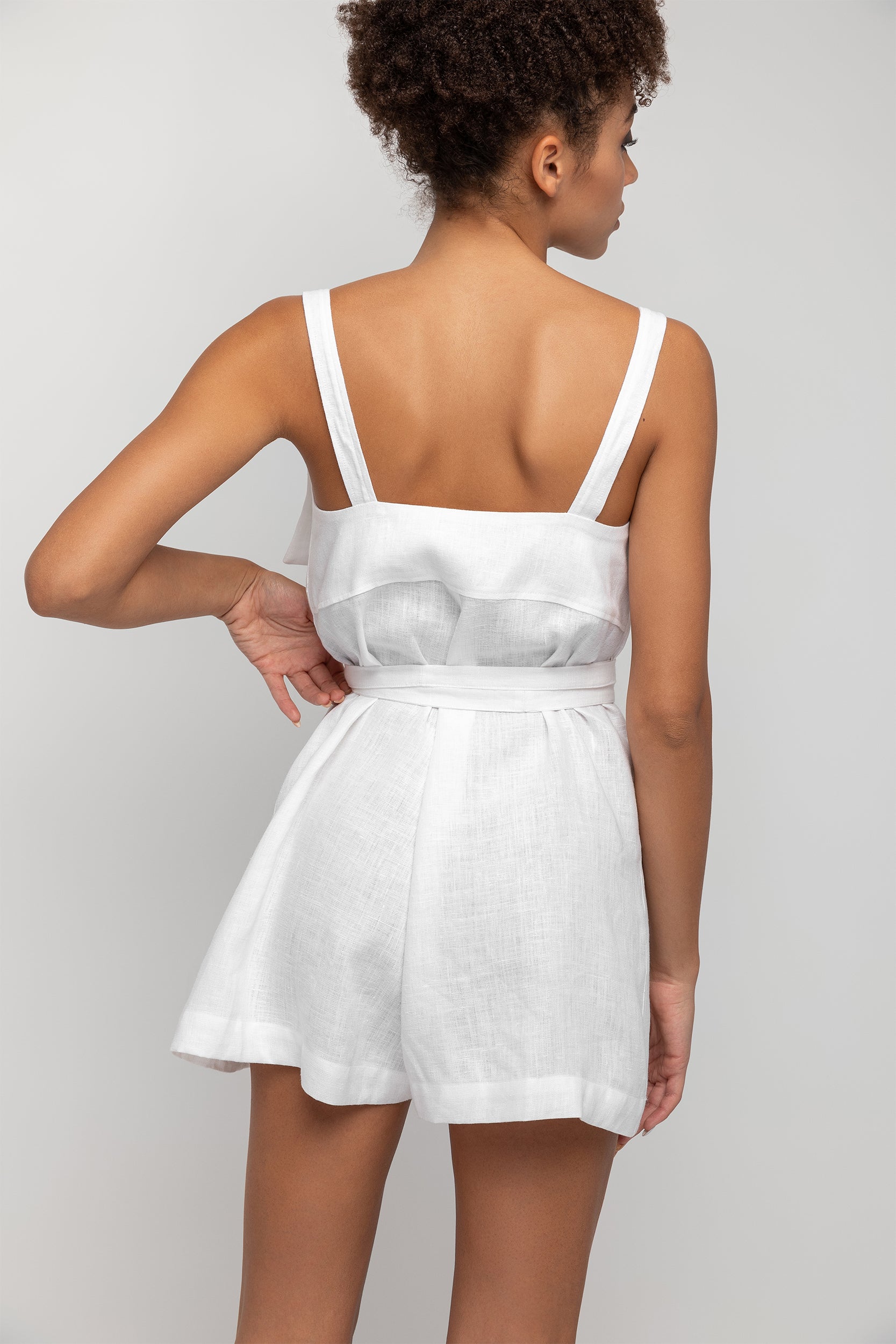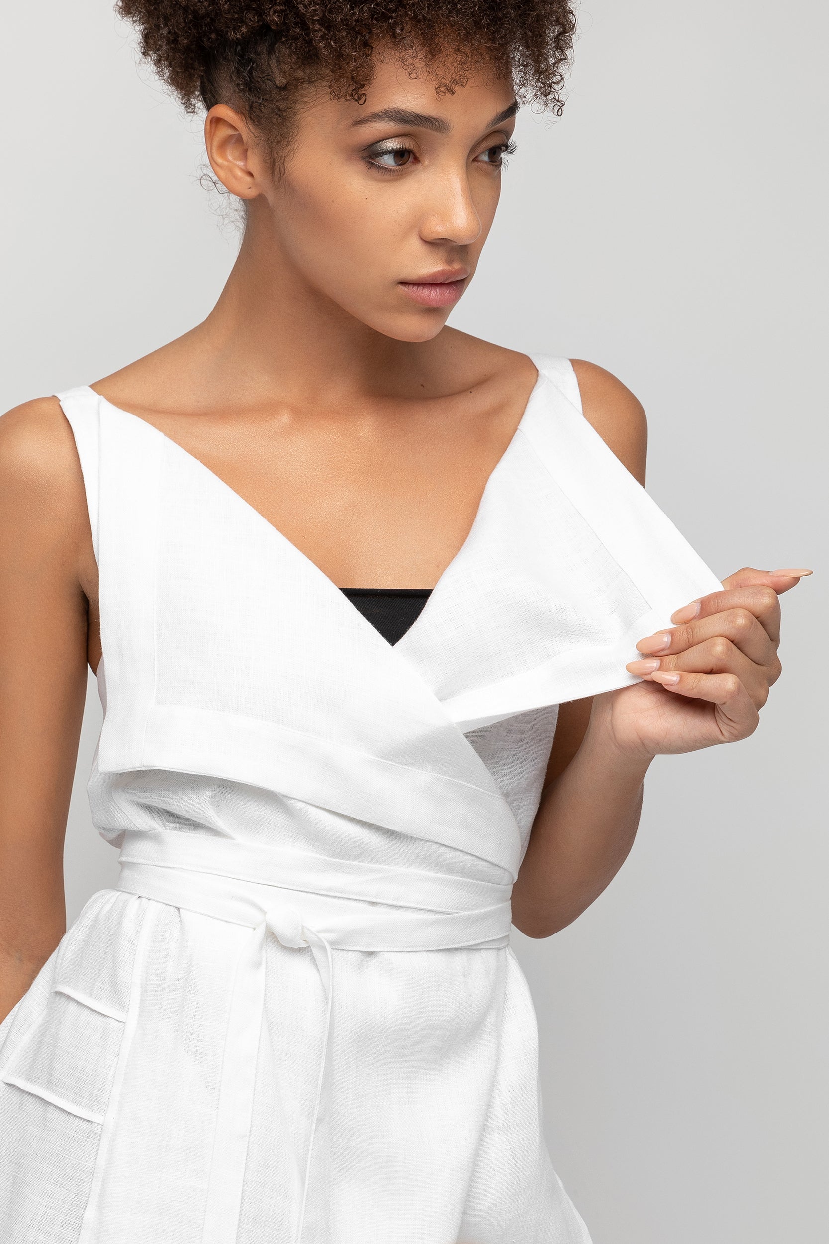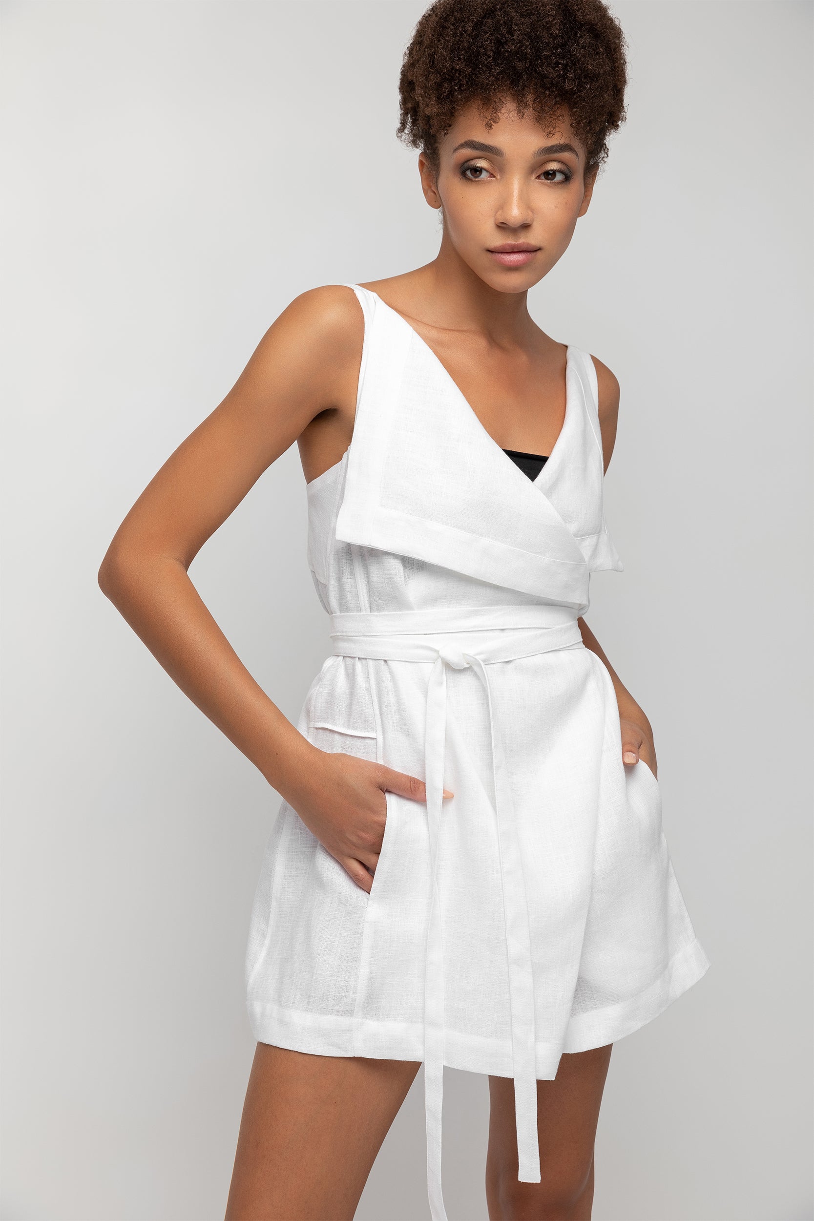 Opt for a lightweight alternative to the classic little black dress and embrace effortless summer style with the Mujun in black, a powerful illustration of contemporary elegance and comfort. This charming short jumpsuit is crafted from linen, featuring a trapeze silhouette with a wide, loose bottom for carefree movement. Mujun showcases a sensual V neckline formed by wide geometric lapels, extending into thick straps that lead to a partially open back, creating a suave appeal. Complemented by subtle inserts with decorative ribs on the sides and hidden pockets in the seams, this jumpsuit pairs beautifully with flats or heels for exciting summer nights.