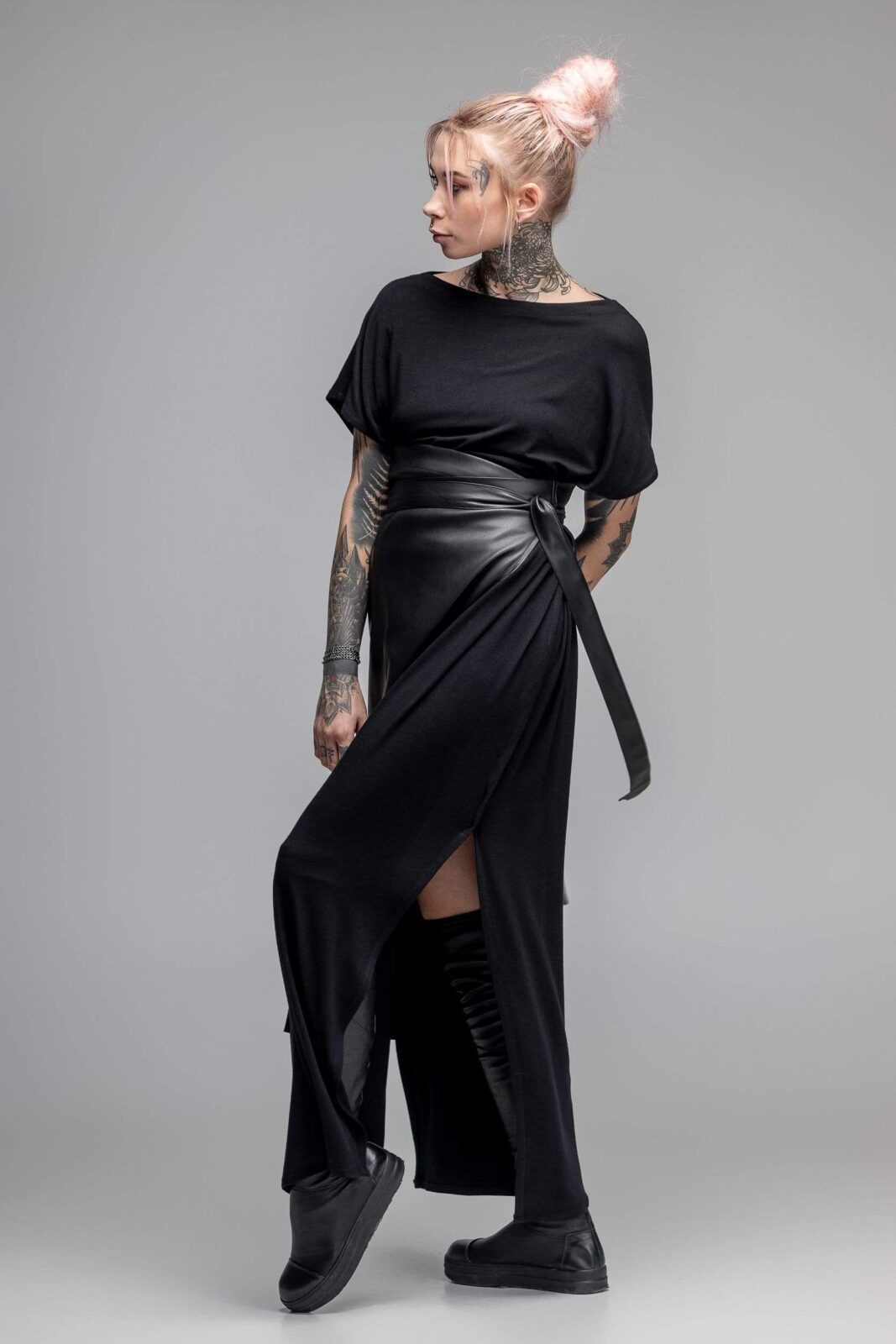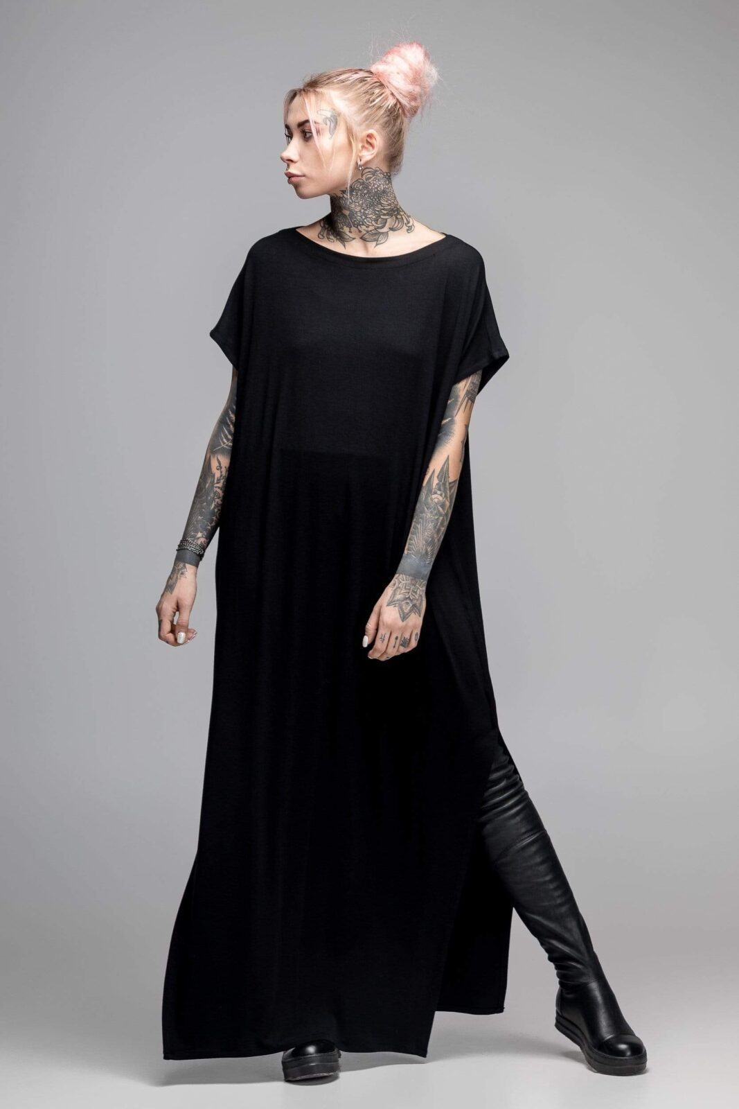 When the fashion gets loose, the oversized maxi dress happens. Simple and equally astonishing, it offers a clean look that fills you up with innovative energy. The long black dress matches forward-thinking natures and suits progressive, highly dynamic personalities who enjoy the freedom and welcome voluminous silhouettes. Constructed from light, breathable viscose with a touch of polyester for added longevity - this dress understands the importance of comfort. Featuring a wide neckline, ample shoulders, and side slits, this piece guarantees swift and sensual movement. Whether you wear it as a standalone item or as an under/top layering piece, it is a dress you will keep turning back to throughout the season.