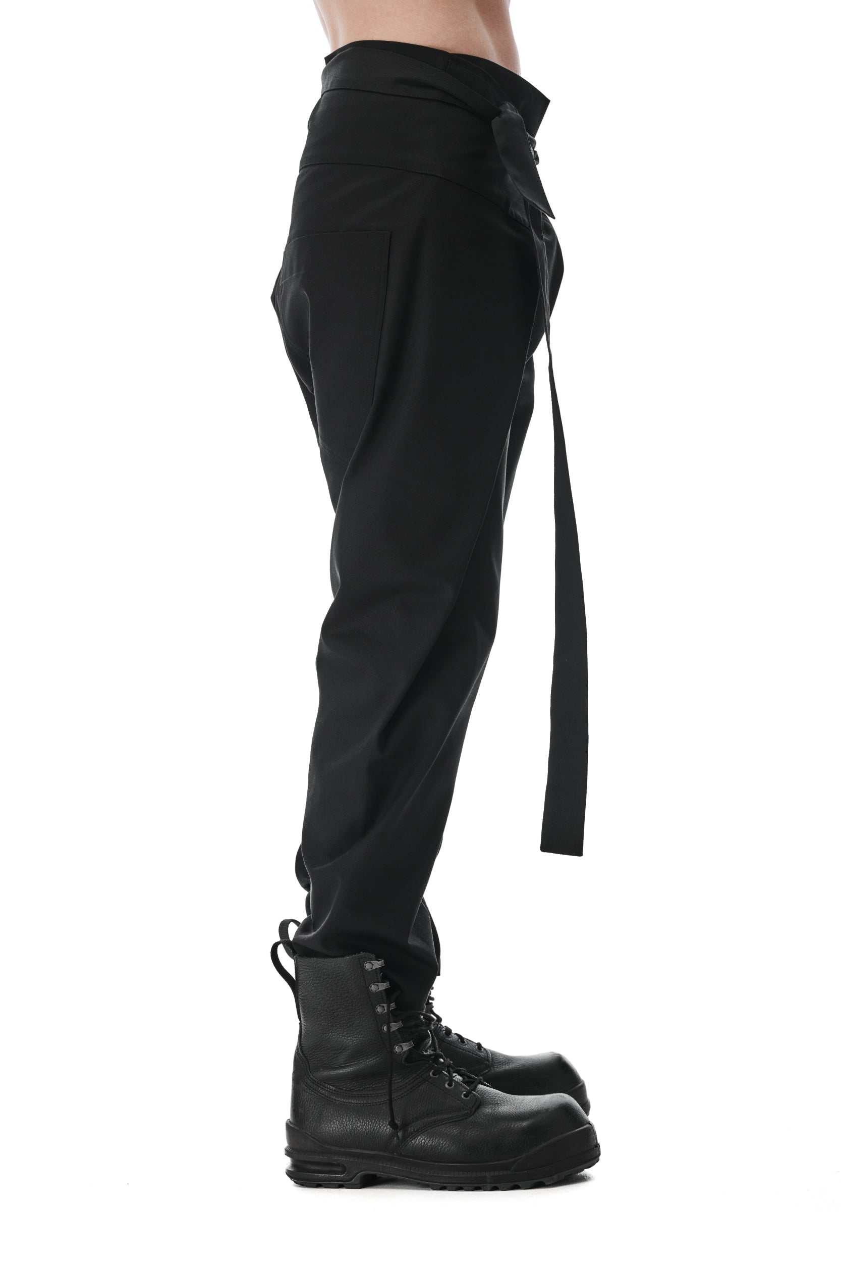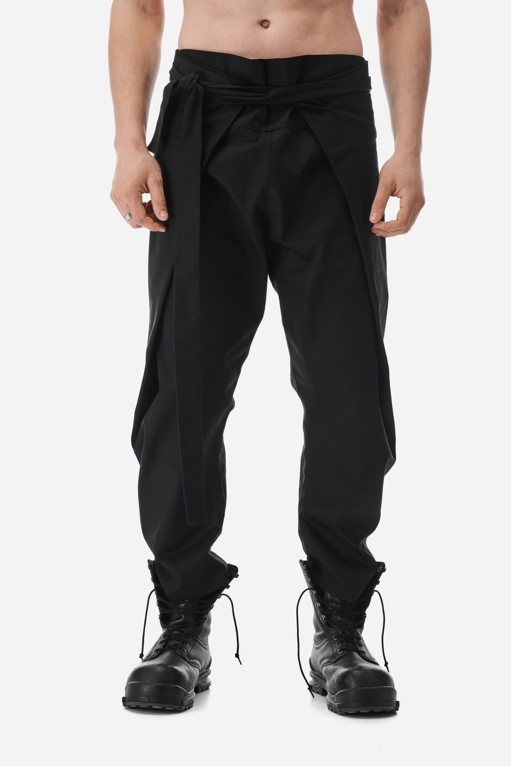 The Raven Wing Trousers are a unique addition to men's fashion. These trousers have a tie-waist design and feature patch pockets on the back for functional use.
