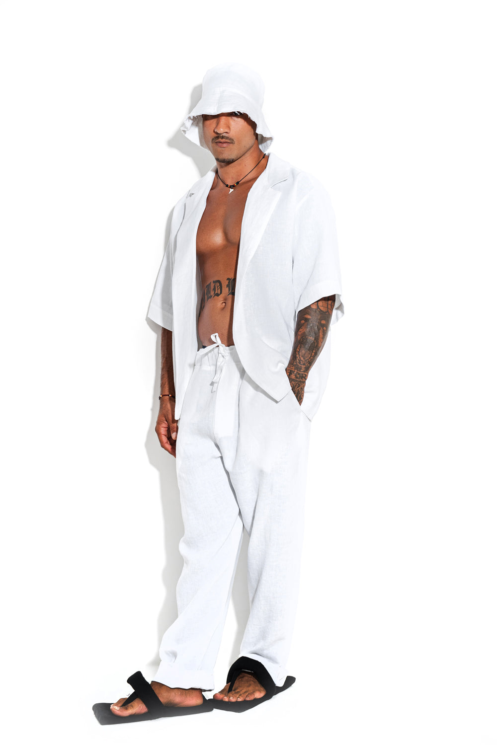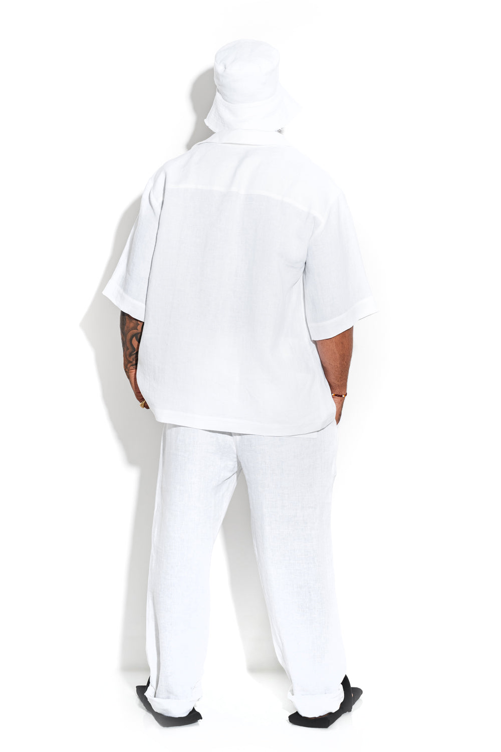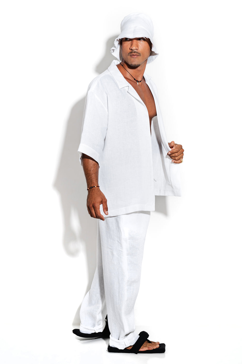 The laid-back feel of this shirt is achieved through its comfortable fit, club collar, loose sleeves, and breathable linen fabric.