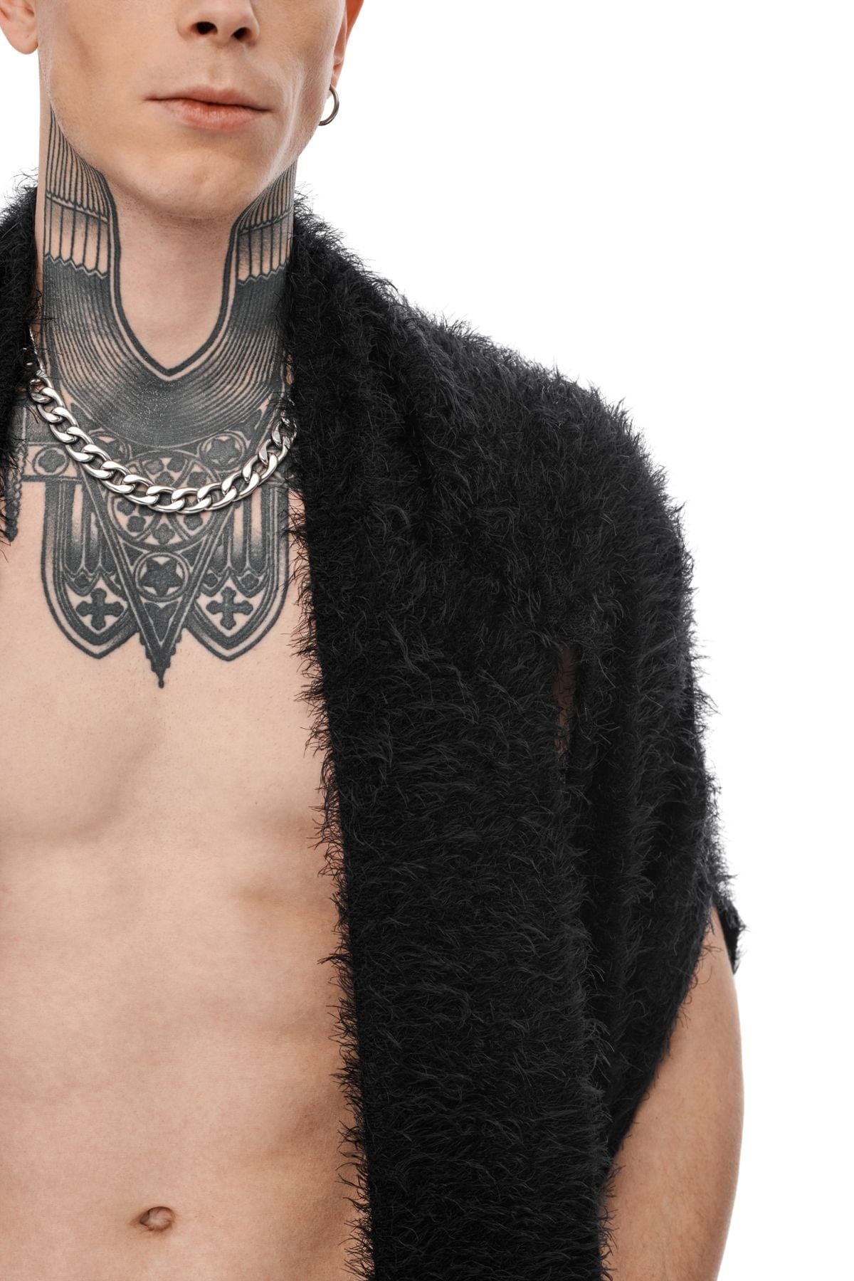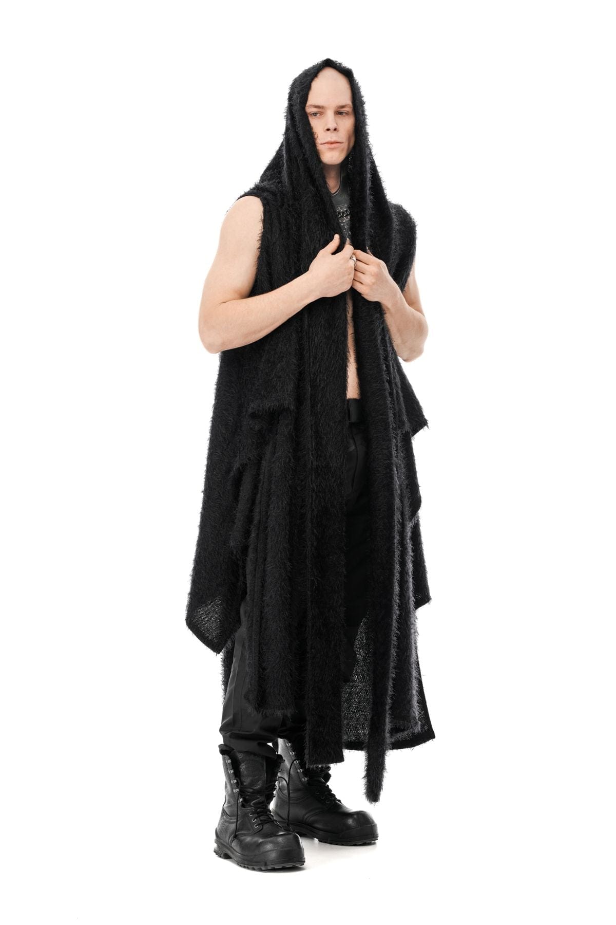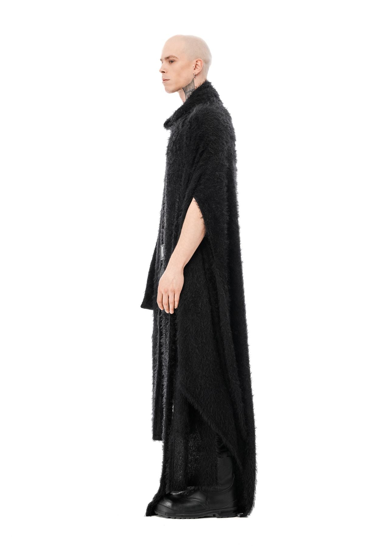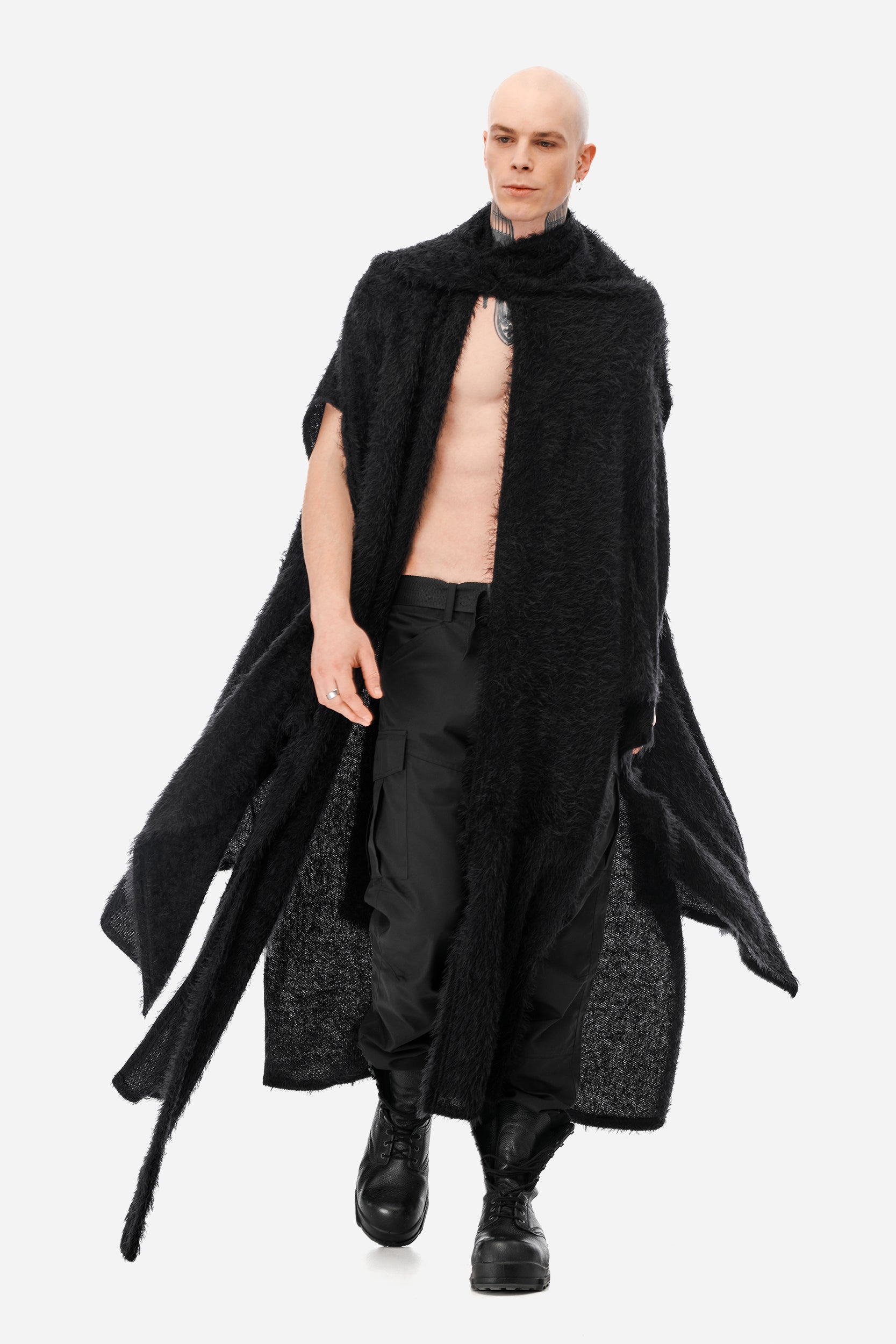 We identified this item as a cardigan, but it's so much more than that. This unisex staple combines a wild design with an animal-friendly, lightweight fabric that extends to a floor-length silhouette. Its symmetrical cut and split hem allow dynamic movement and versatile draping options. The exaggerated collar can be easily transformed into a scarf, while the hand holes in the seams add convenience. Celebrate authenticity and individualism with this unique cardigan.