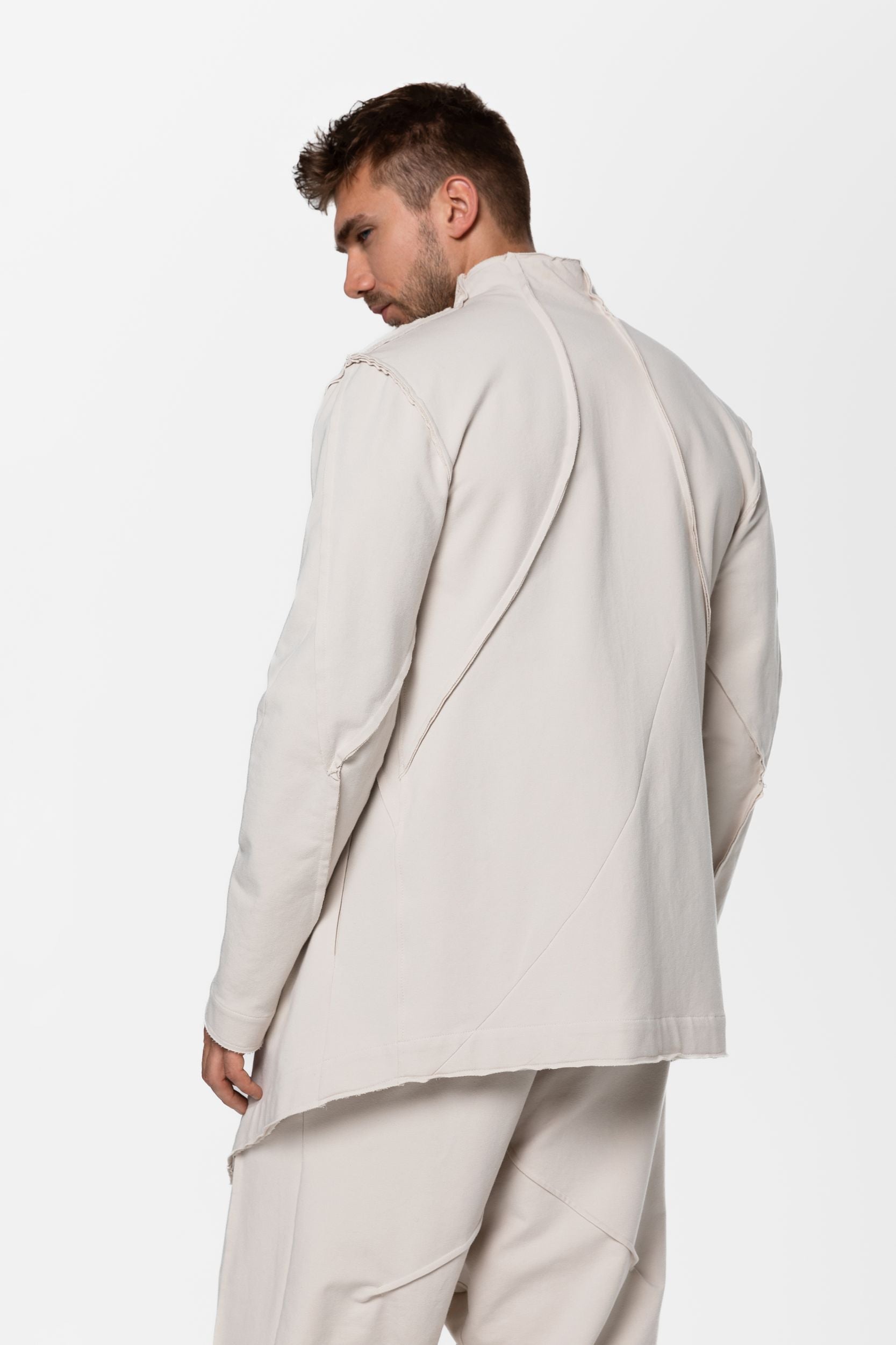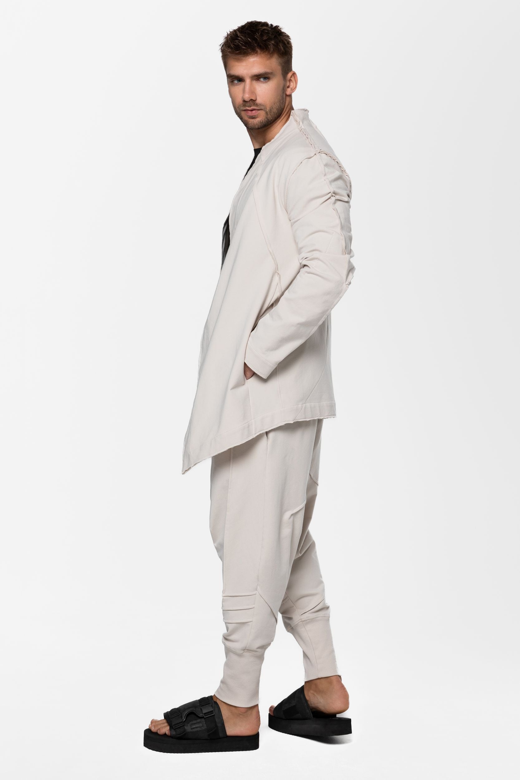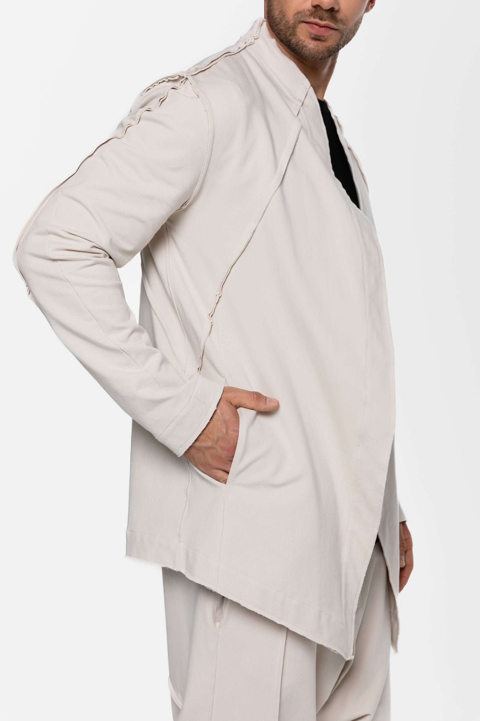 Introducing the new Reberu jersey jacket in a new dune beige shade — a fresh approach to our already classic linen jacket. This men's blazer blends a tailored cut with a relaxed fabric, giving it a summer cardigan vibe. Its intricate texture adds a touch of creativity, making it suitable as a festival coat for men. With slit pockets and a raw edge hem, this jacket for men is the ideal statement piece for a stylish yet casual outfit.