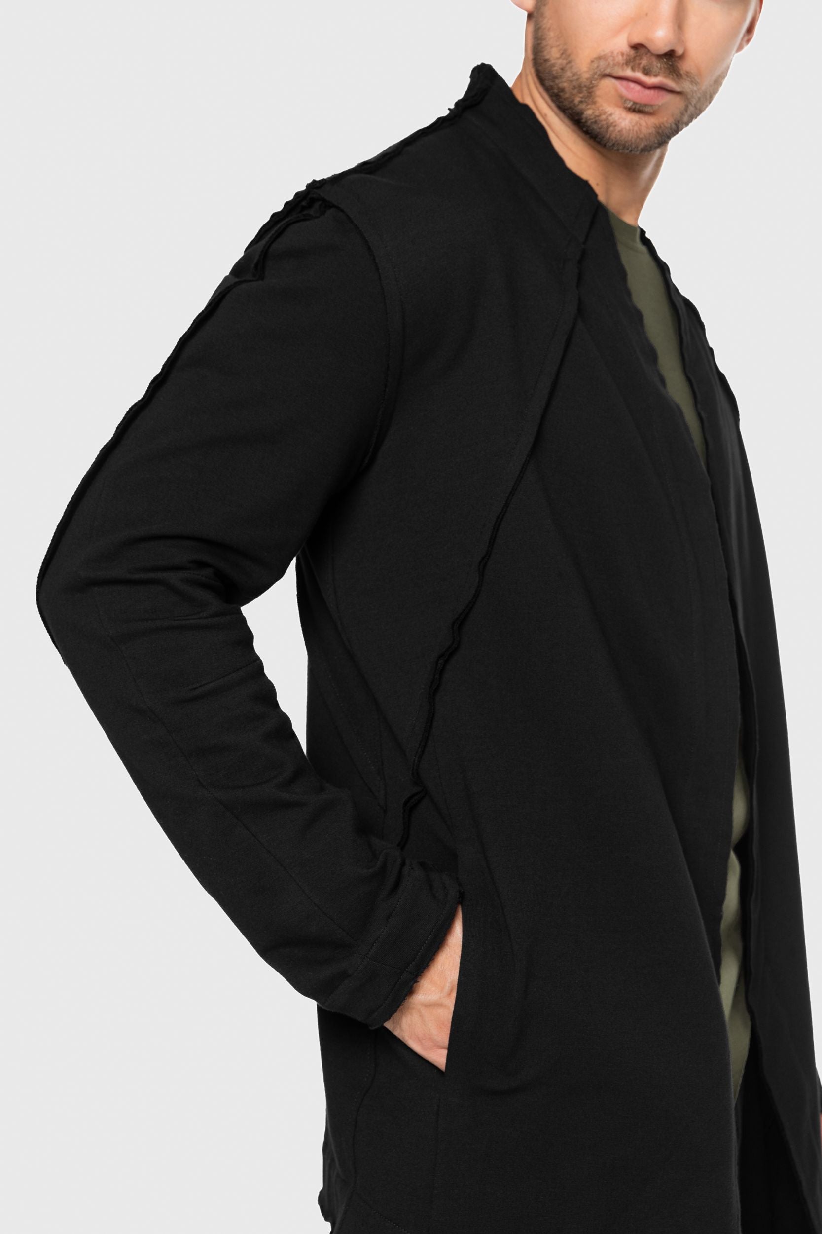 Introducing the new Reberu jersey jacket — a fresh approach to our already classic linen jacket. This men's blazer blends a tailored cut with a relaxed fabric, giving it a summer cardigan vibe. Its intricate texture adds a touch of creativity, making it suitable as a festival coat for men. With slit pockets and a raw edge hem, this jacket for men is the ideal statement piece for a stylish yet casual outfit.
