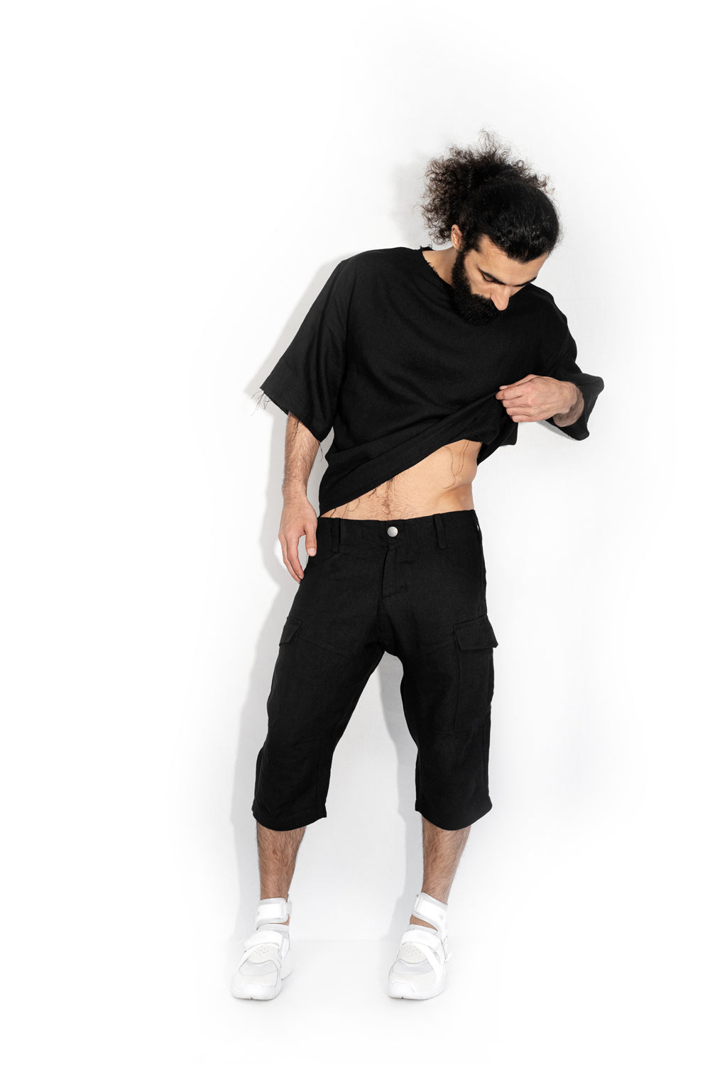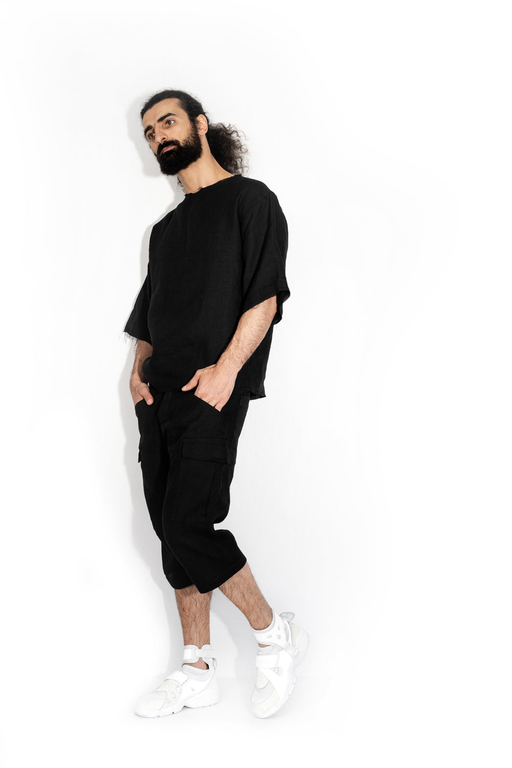 Another oversized T-shirt made from fine heavyweight linen. It boasts dropped shoulders and wide elbow-length sleeves. The neckline, hem, and sleeves are all finished with raw, rough edges.