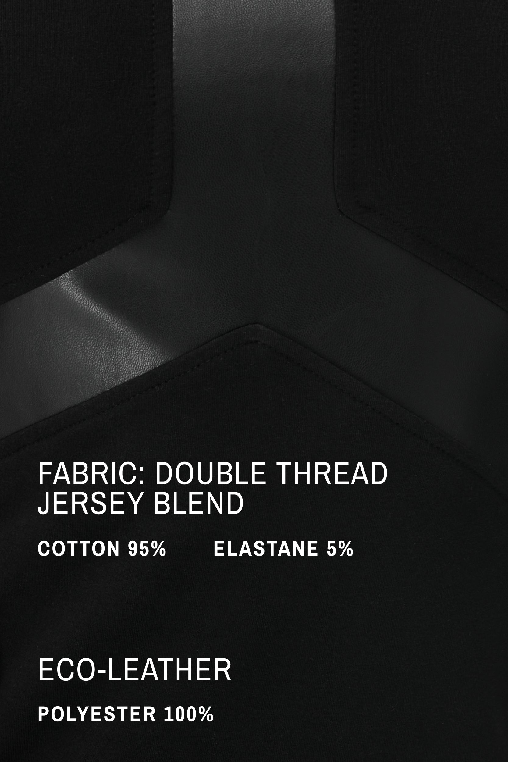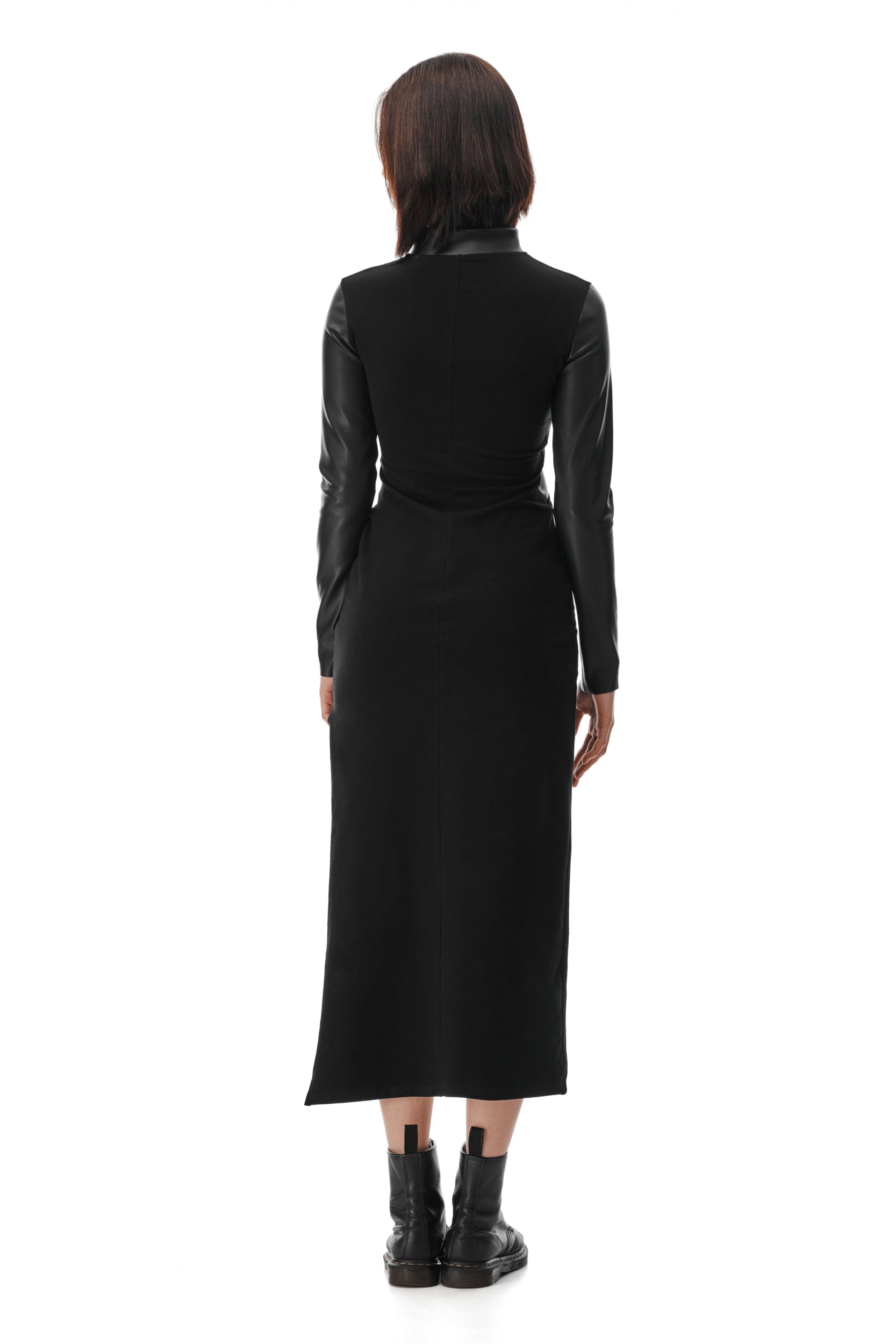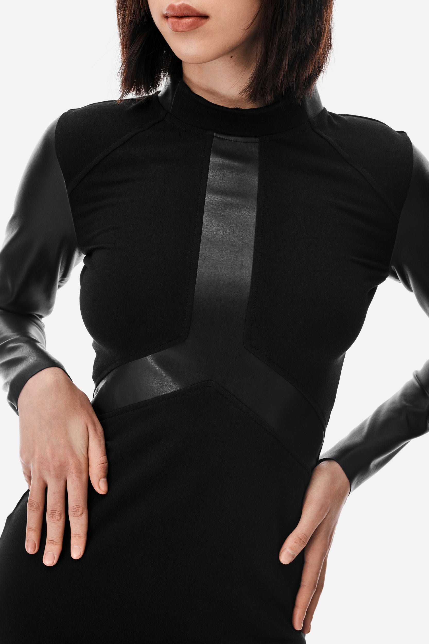 This dress combines the gentle embrace of quality jersey with the assertive touch of eco-leather, crafting a look that's as tenacious as it is alluring.