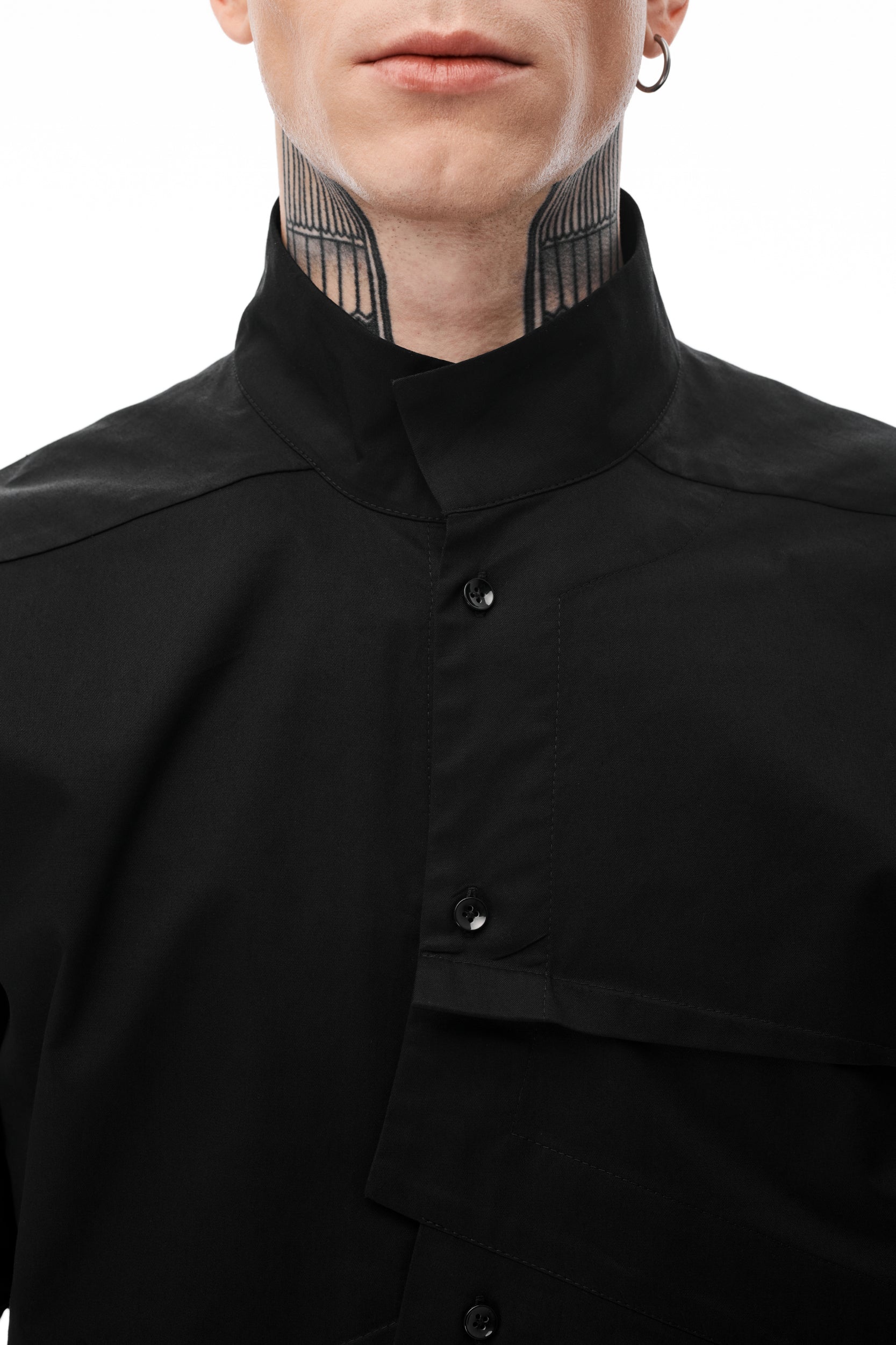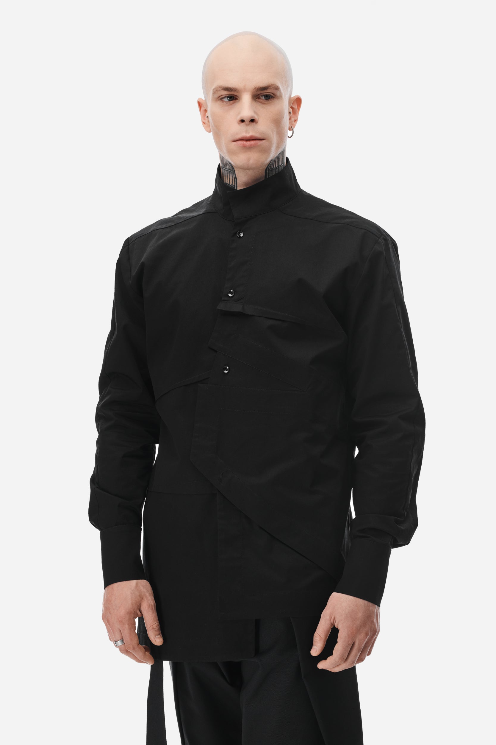 The Black Shirt offers a contemporary spin on men's fashion with its asymmetrical design. This shirt features decorative darts and folds on the front, providing a visually interesting detail.