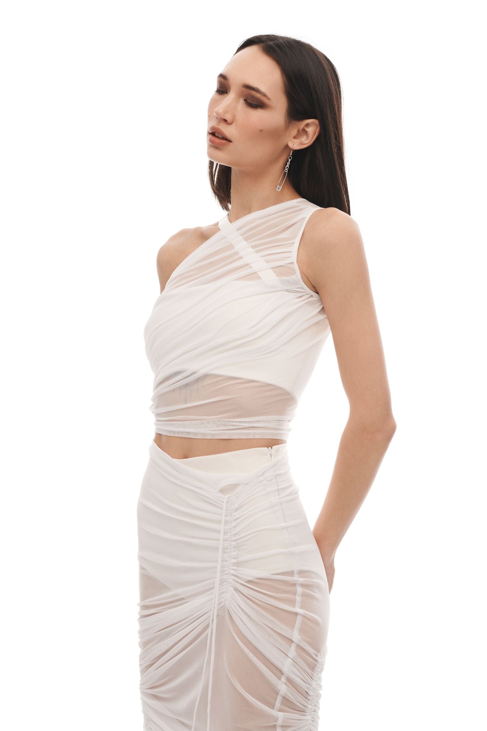 A willful spirit artfully captured in a one-shoulder top, Veil in white orchestrates a devilish demeanor confident that you’re going to keep coming back to it.